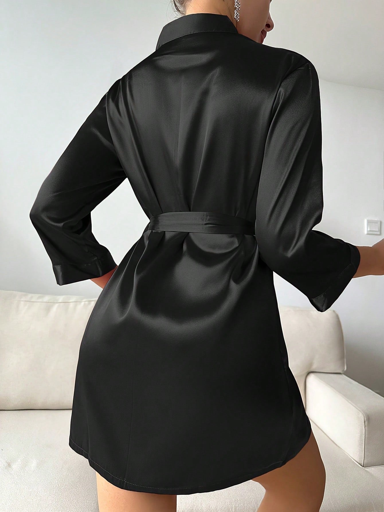 1pc Women's Solid Color Elegant Tie-Up Lightweight Sexy Short Satin Robe, Comfortable Sleepwear For Home Use