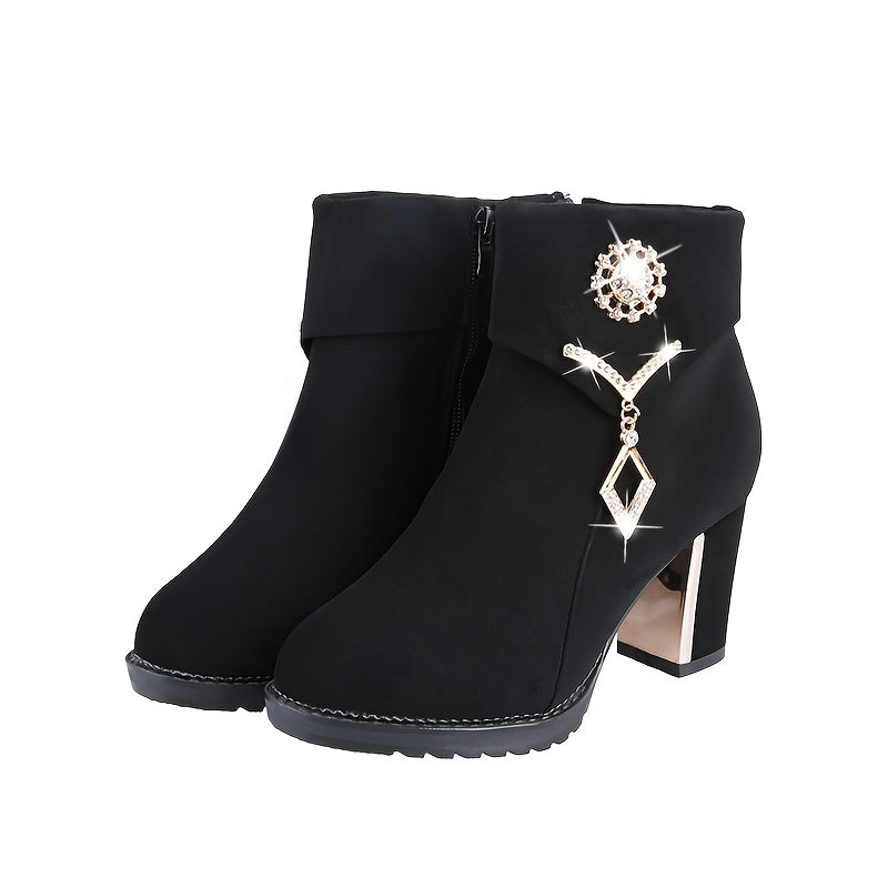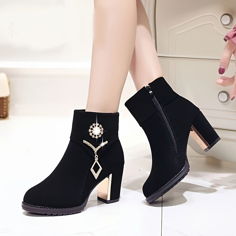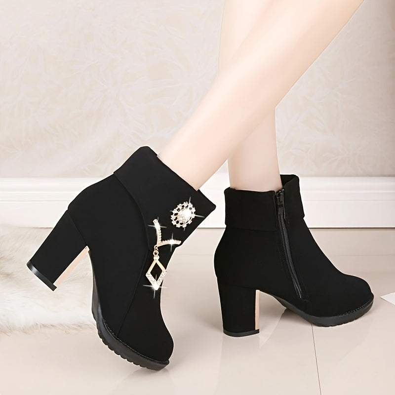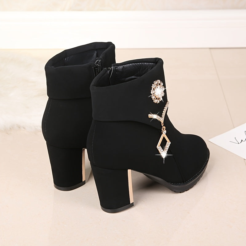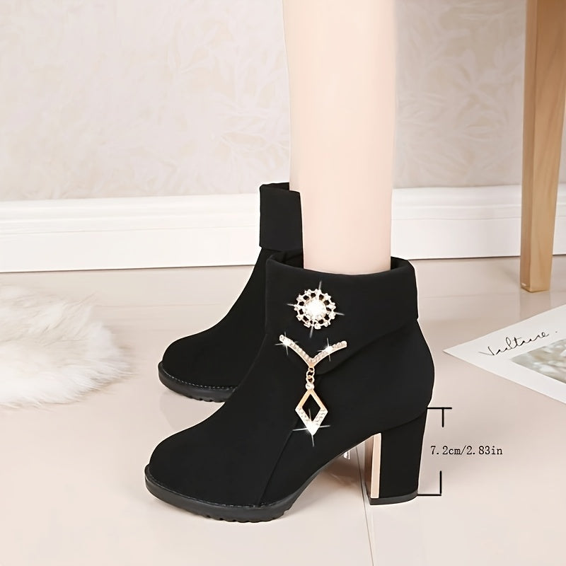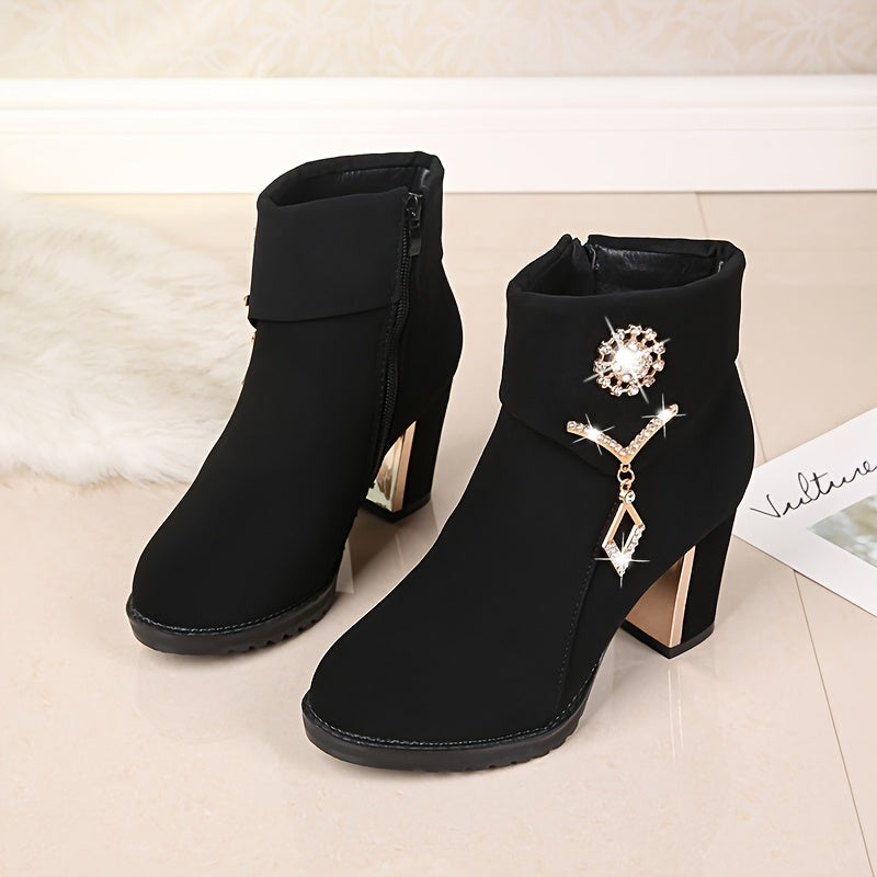 1pr Elegant Women'S Ankle Boots - Solid Color Block Heel Booties with Rhinestone Accents, Round Toe, Zipper Closure, Faux Leather Sole, Flannel Insole, Mesh Lining - Versatile High Heels for Casual Fall Wear
