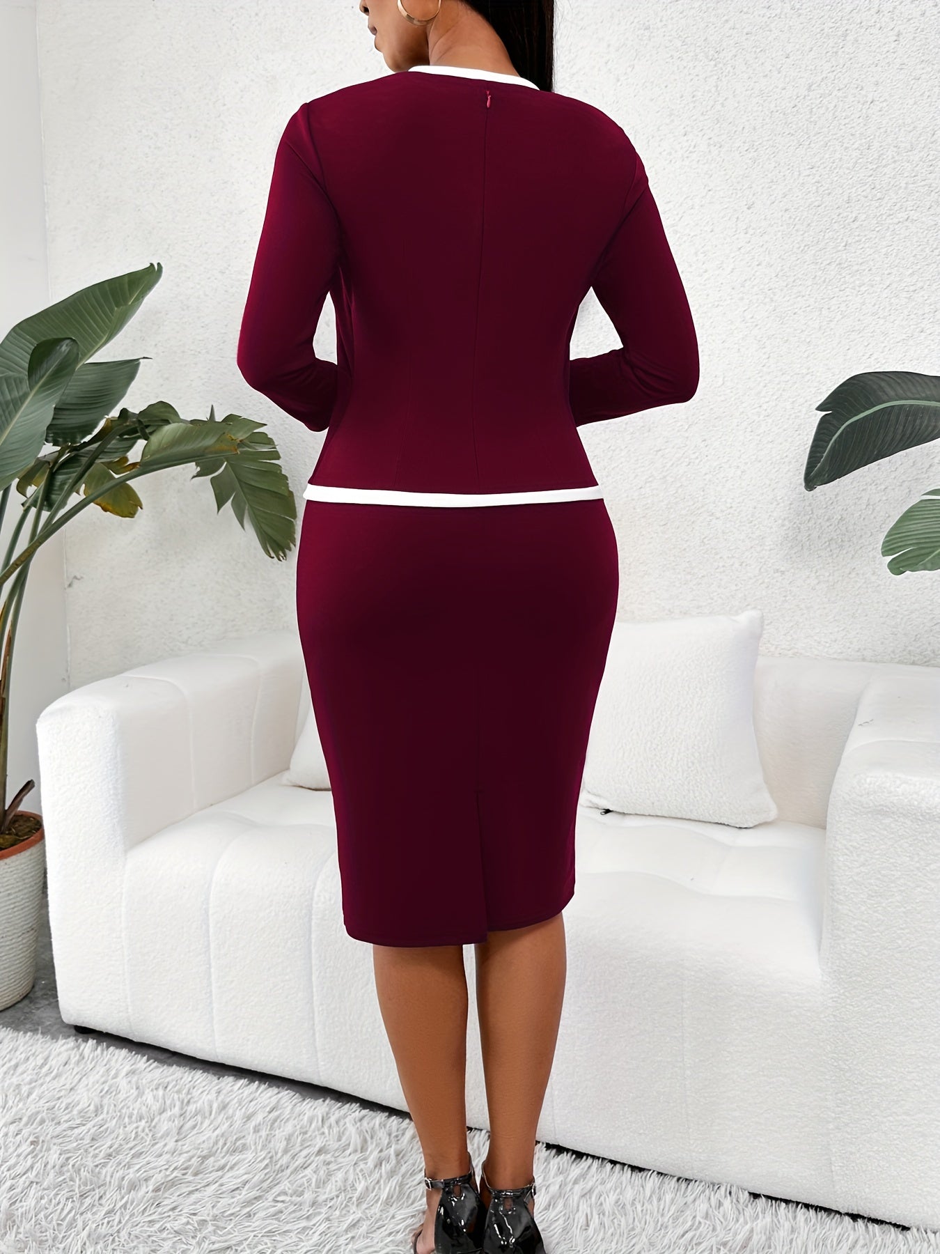 2-in-1 Contrast Trim Splicing Bag Hip Elegant Dress - 3/4 Sleeve, Versatile, Chic, and Comfortable for Spring and Fall Seasons - Womens Clothing for Various Occasions