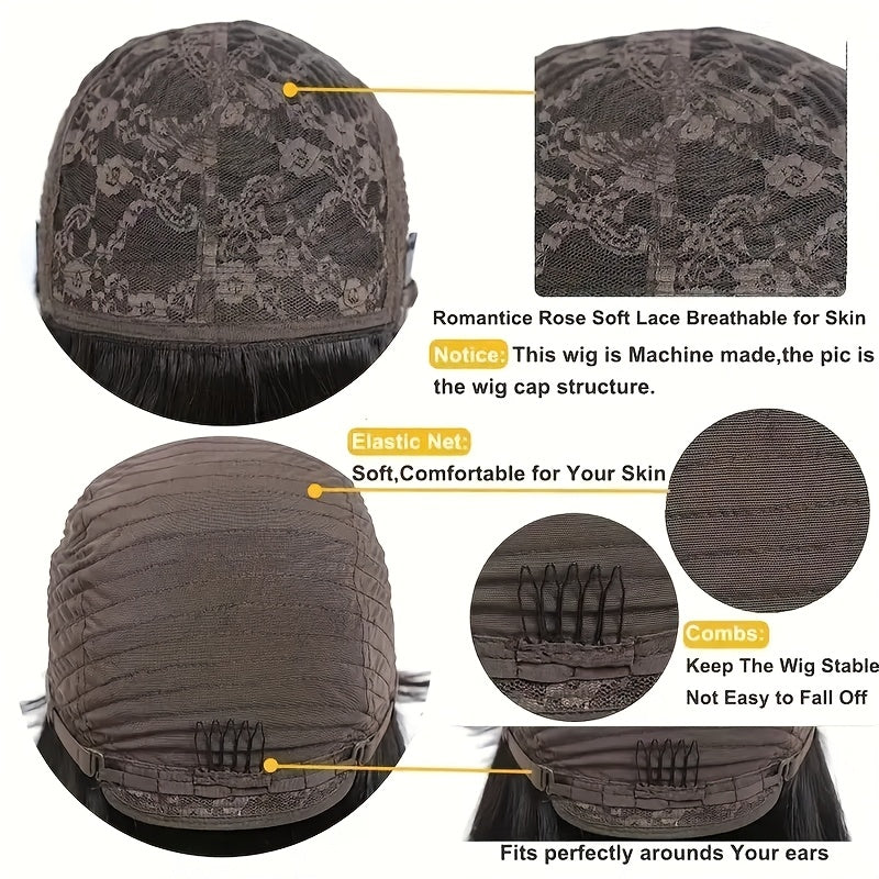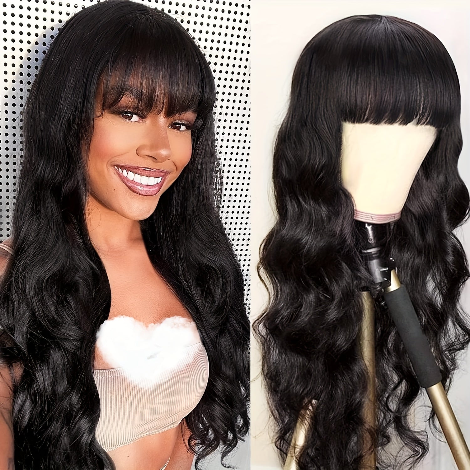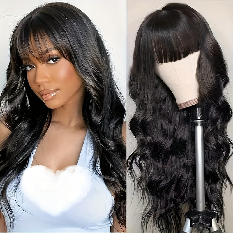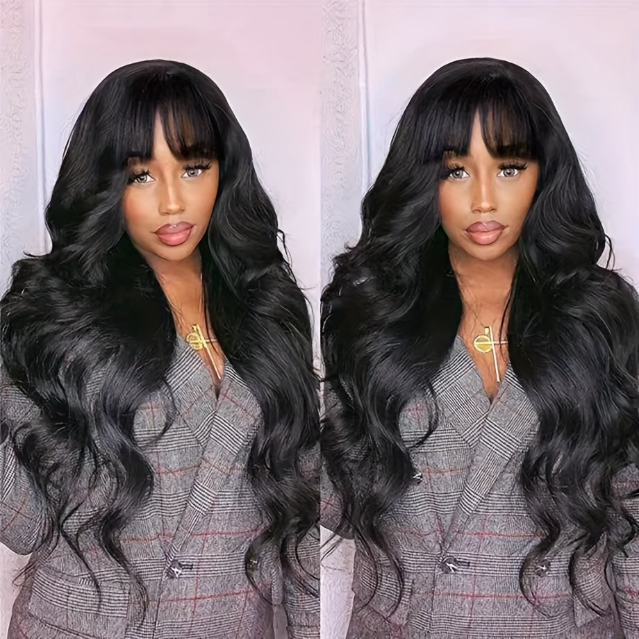 200% Density 100% Brazilian Virgin Human Hair Body Wavy Wigs With Bangs Long And True Length Human Hair #1B Glueless Body Wavy Full Machine Made Scalp Top Wig No Lace Front Wigs For Women Natural Color