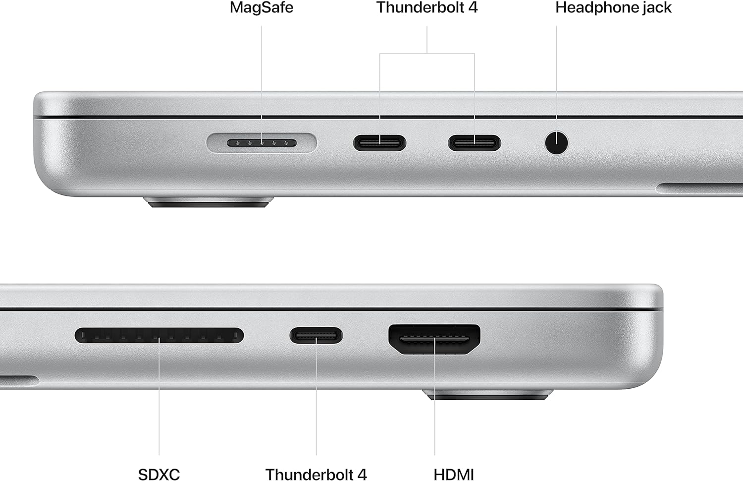 CONNECT WHAT YOU WANT — MacBook Pro features a MagSafe charging port, three Thunderbolt 4 ports, an SDXC card slot, an HDMI port, and a headphone jack. And enjoy seamless wireless connectivity with Wi-Fi 6E and Bluetooth 5.3.