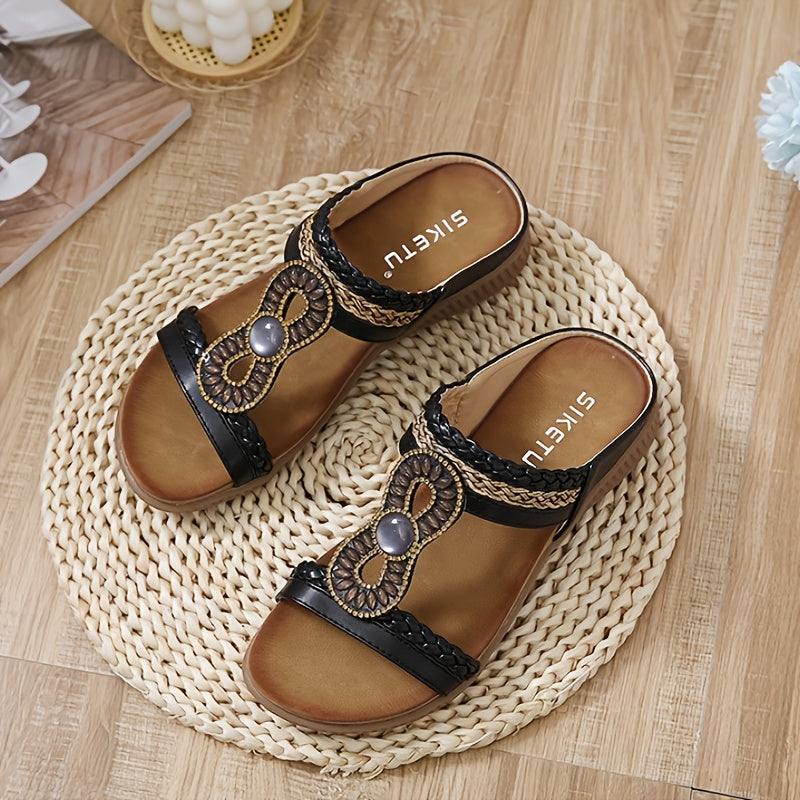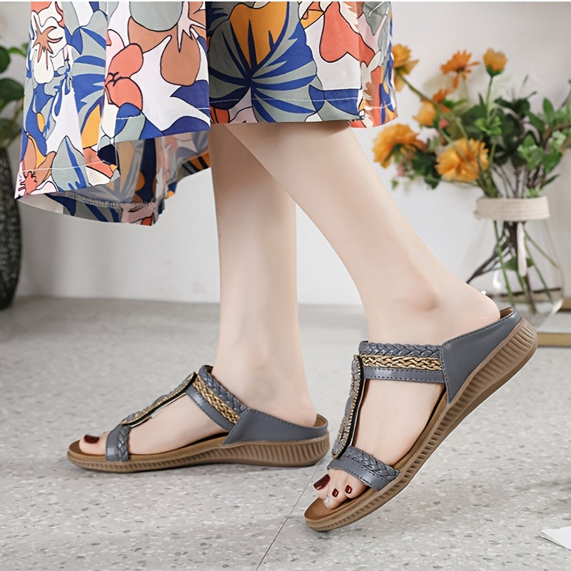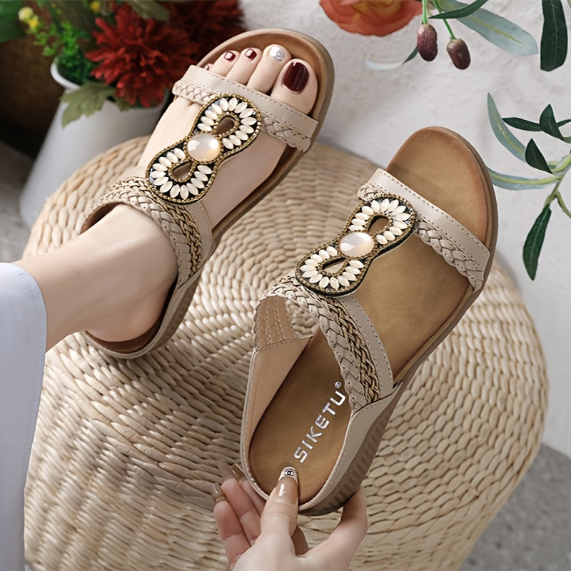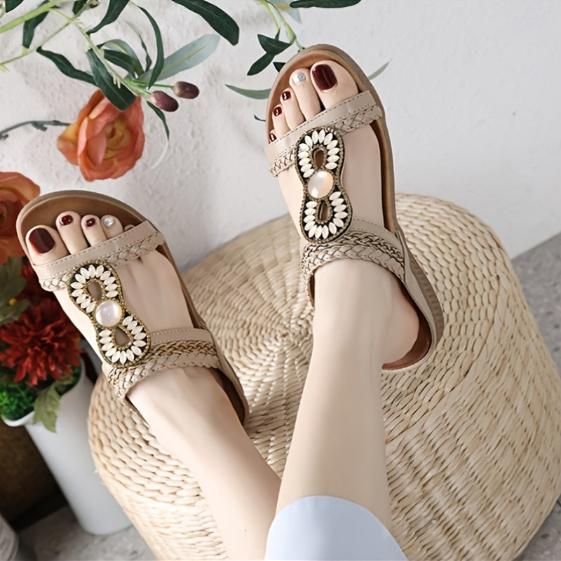2025 New Bohemian Rhinestone Flat Sandals - Open-Toe Summer Beach Shoes with Adjustable Hook-and-Loop Strap, Comfortable Round Toe Design for Women, Plus Size & Flats Available, Ladies Shoes And Sandals, Durable Tpr Sole