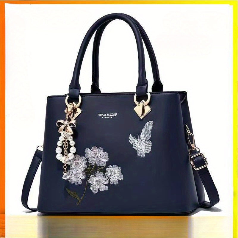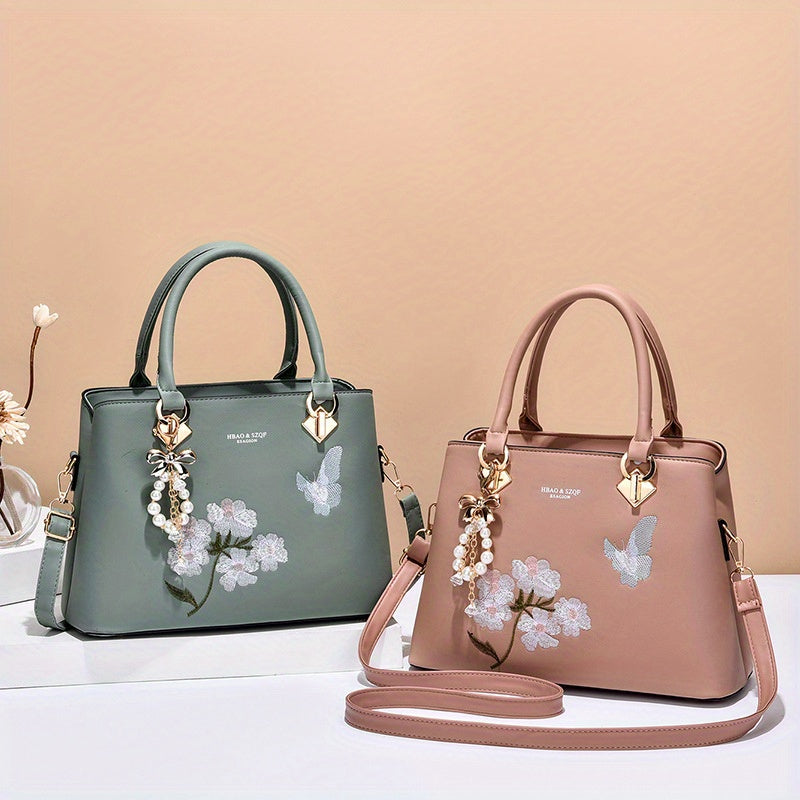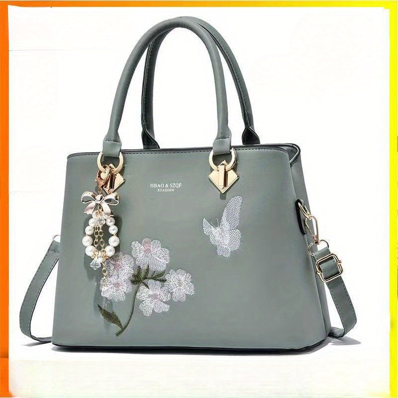 2025 New Women's Floral Embroidered Crossbody Bag with Accents - Detachable Shoulder Strap, Zipper Closure, European Collection (White/Green/Black)