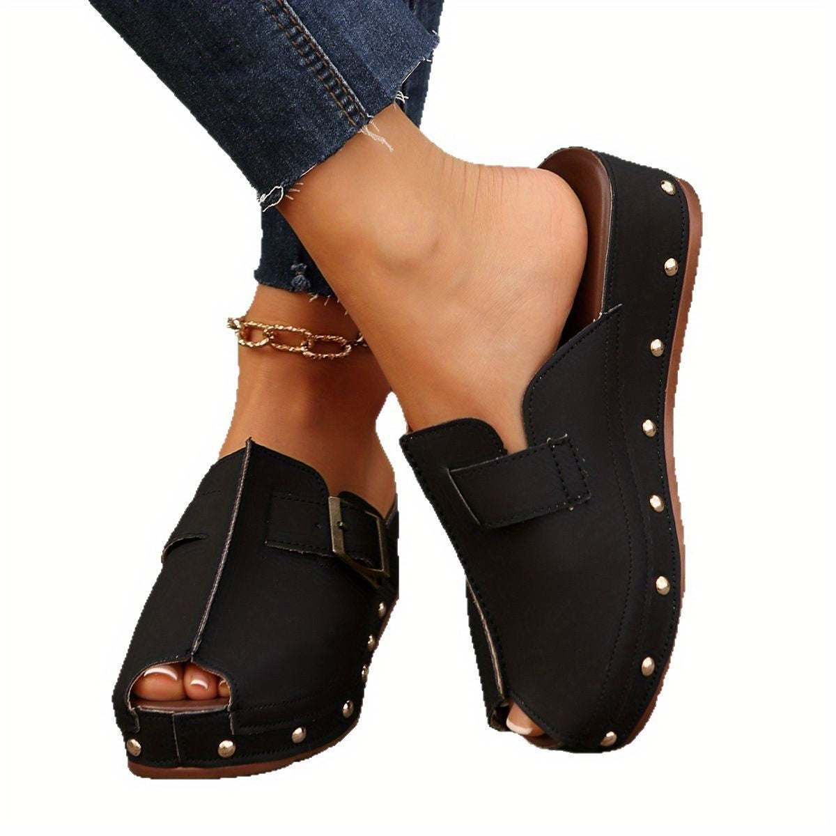 2025 Summer Women'S Open-Toe Platform Sandals - Thick Sole Slip-On Beach Slippers with Metallic Buckle Straps, Black Rubber & PVC Upper, Mid-Heel Comfort for Casual Outings, Sandals for Wide Feet, Crisscross Strap Design, Durable Traction Footwear