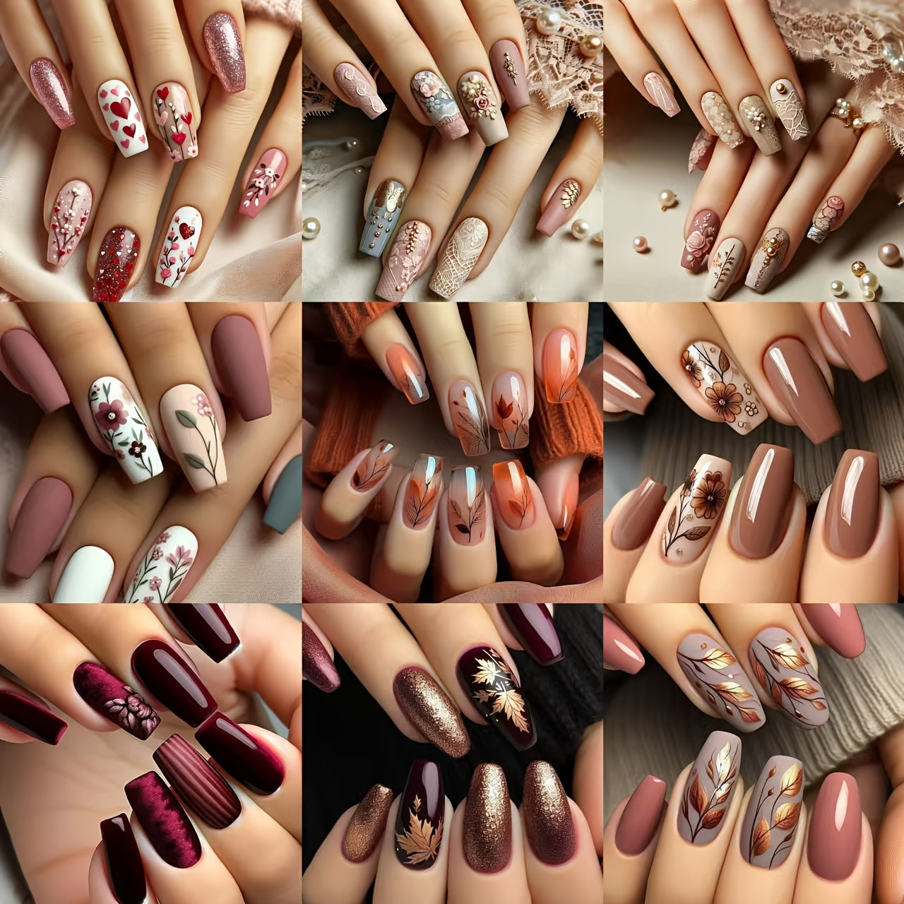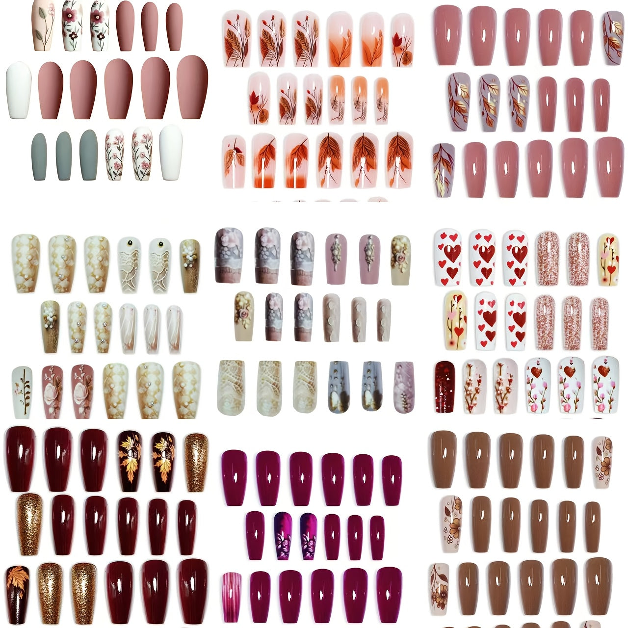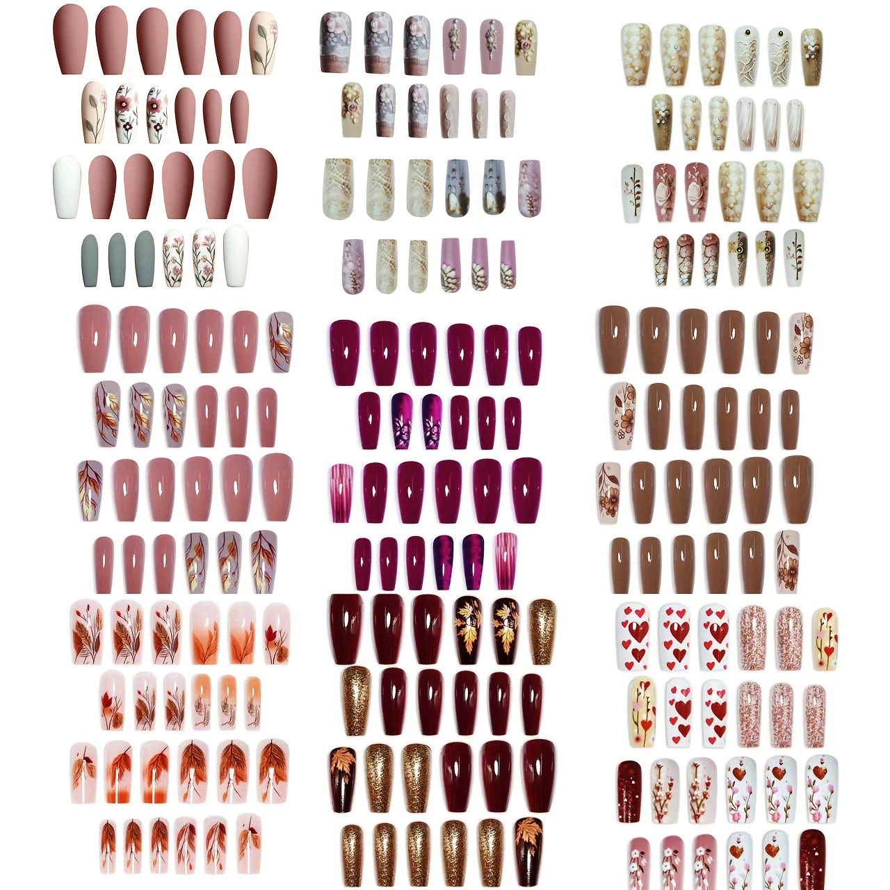 216pcs Ballet Nail Shape Press On Nails Set, Mixed Color System with Flower & Maple Patterns, Middle Length with Glossy Finish - Seasonal Fashion Kit Including Jelly Adhesive & Nail File