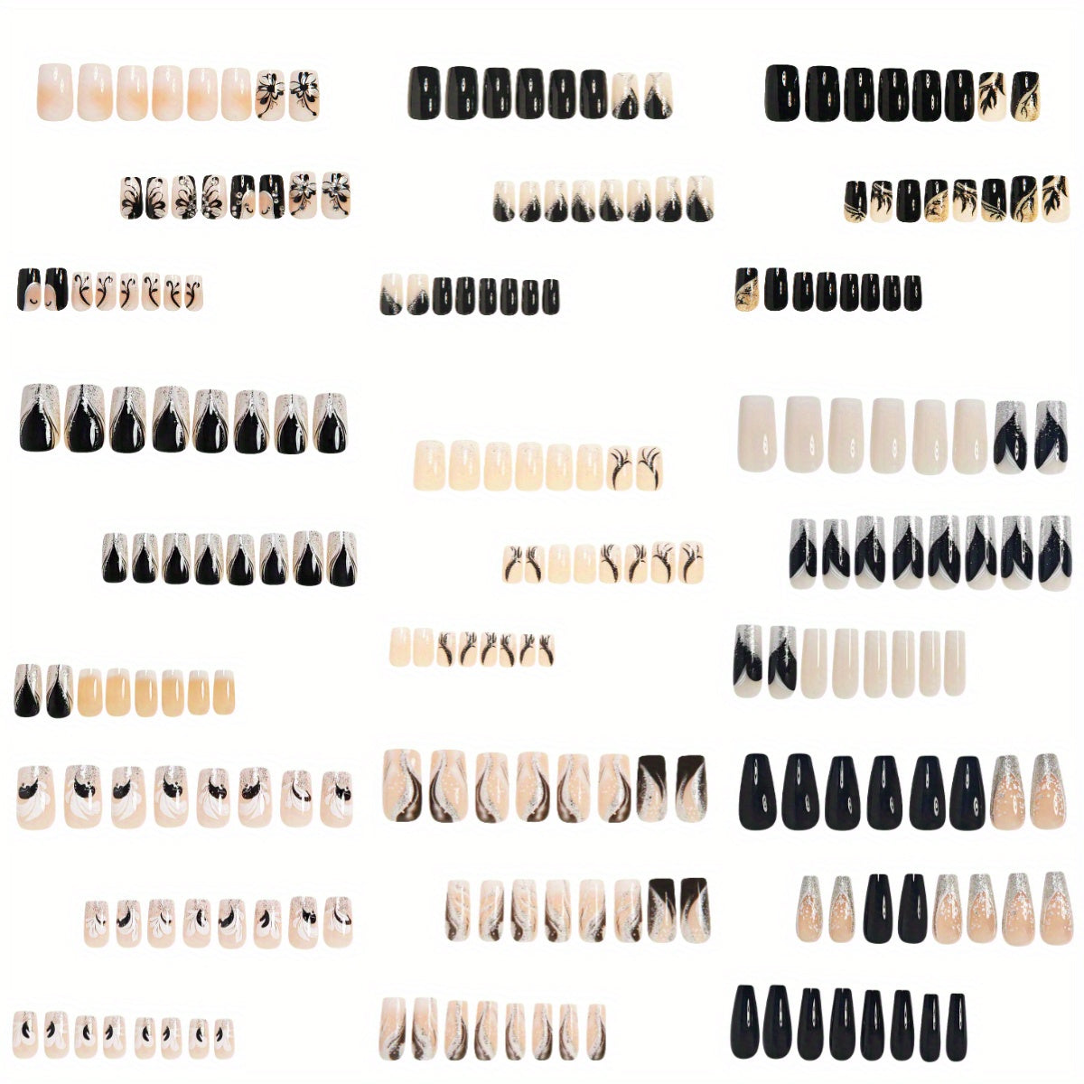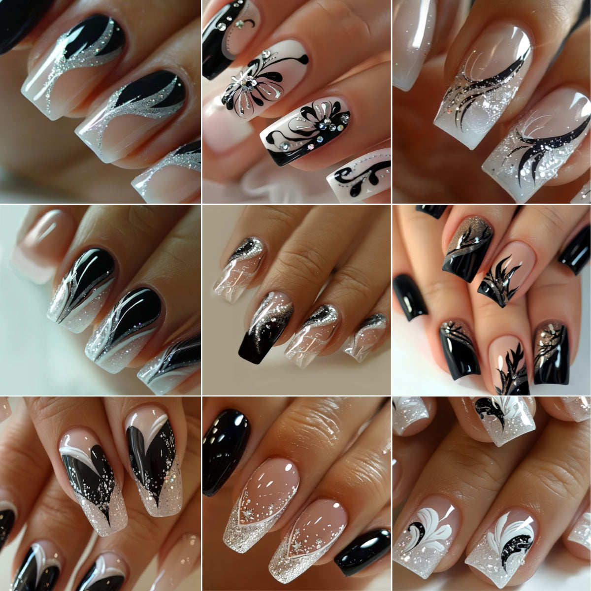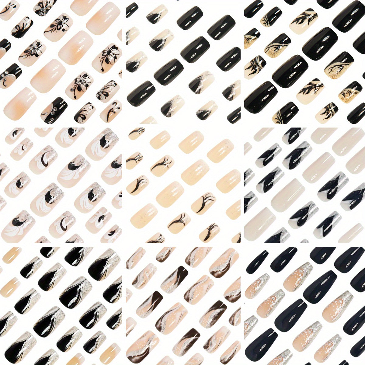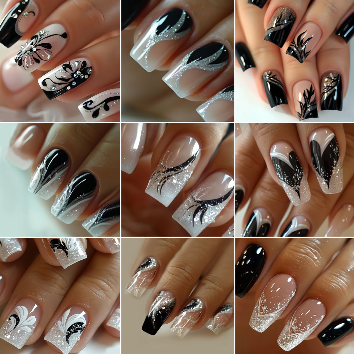 216pcs Elegant Press-On Nail Set in Black & White with Glitter Accents - Includes 3D Butterfly, Floral, and Fox Tail Designs, Medium Square Acrylic Nails for Women & Girls - Comes with Jelly Glue & File, Fashion Nail Art|Elegant Nail Designs|Intricate Nai