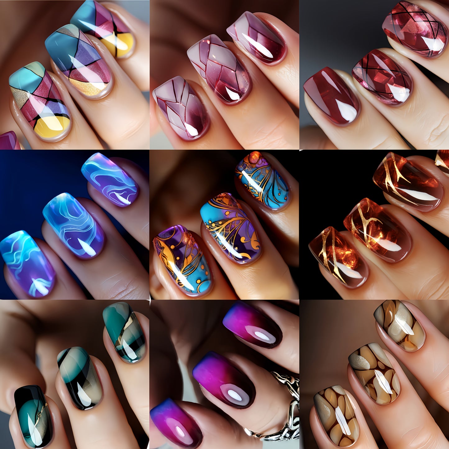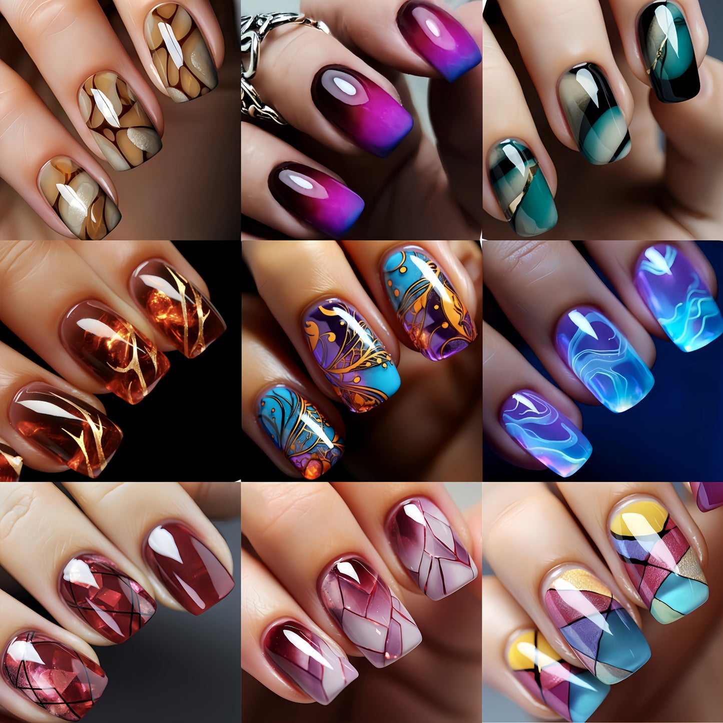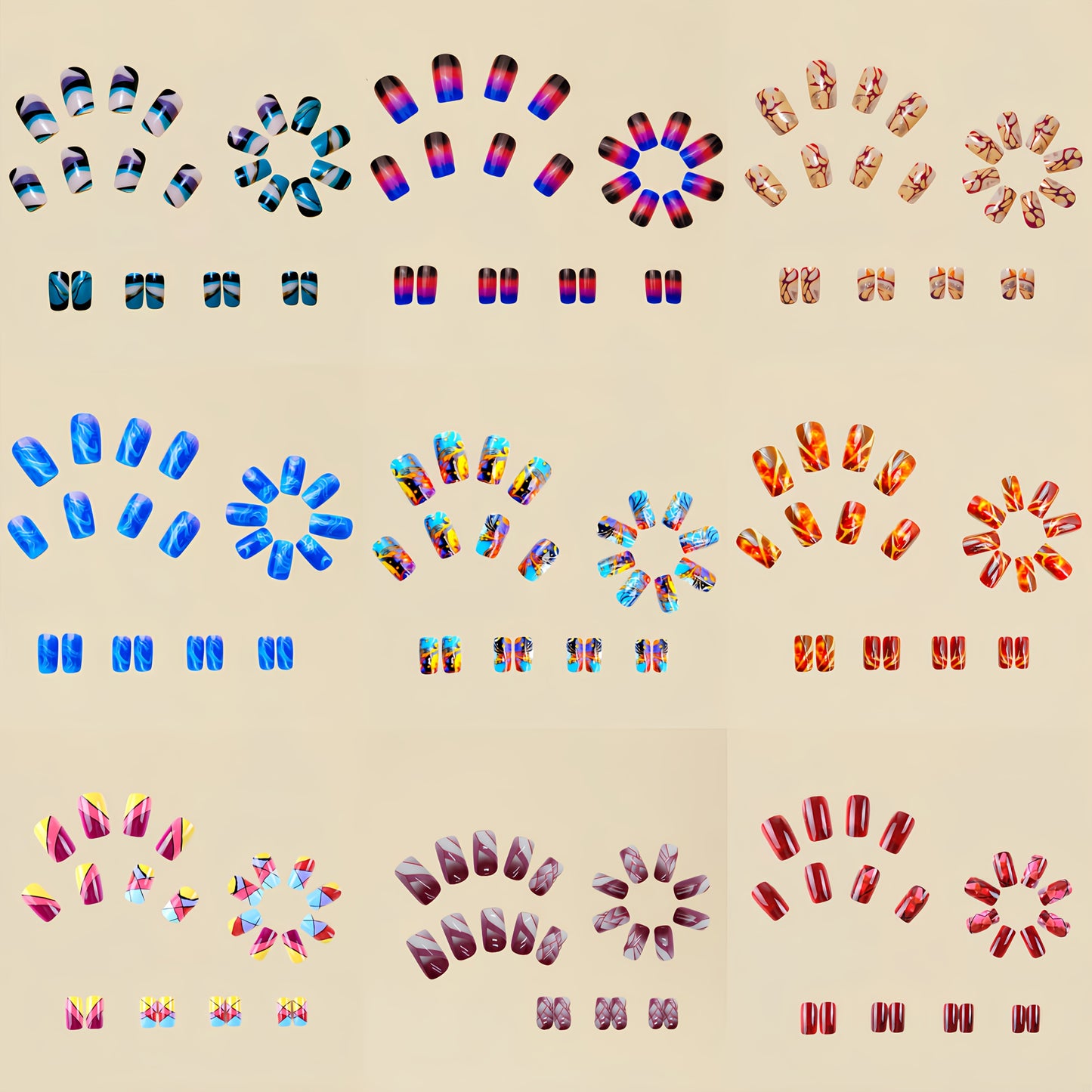 216pcs Press-On Nail Set - Medium Square, Glossy Finish with Striped & Gradient Designs in Brown, Blue, Purple - Reusable Fake Nails for Chic Manicure Mix and Match