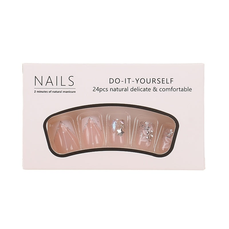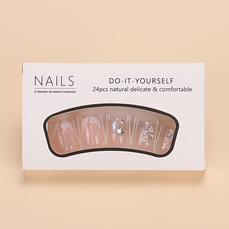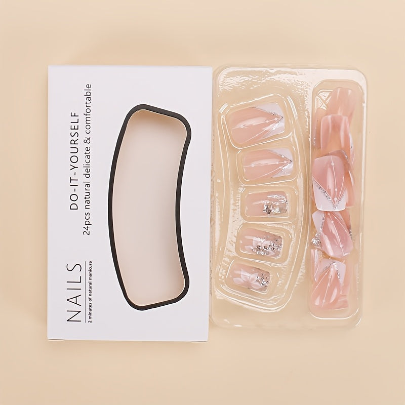 24pcs French Glitter Flower Press-On Nails Set, Nude Square Short Nail Tips with Glossy Finish, Includes Jelly Glue & Nail File