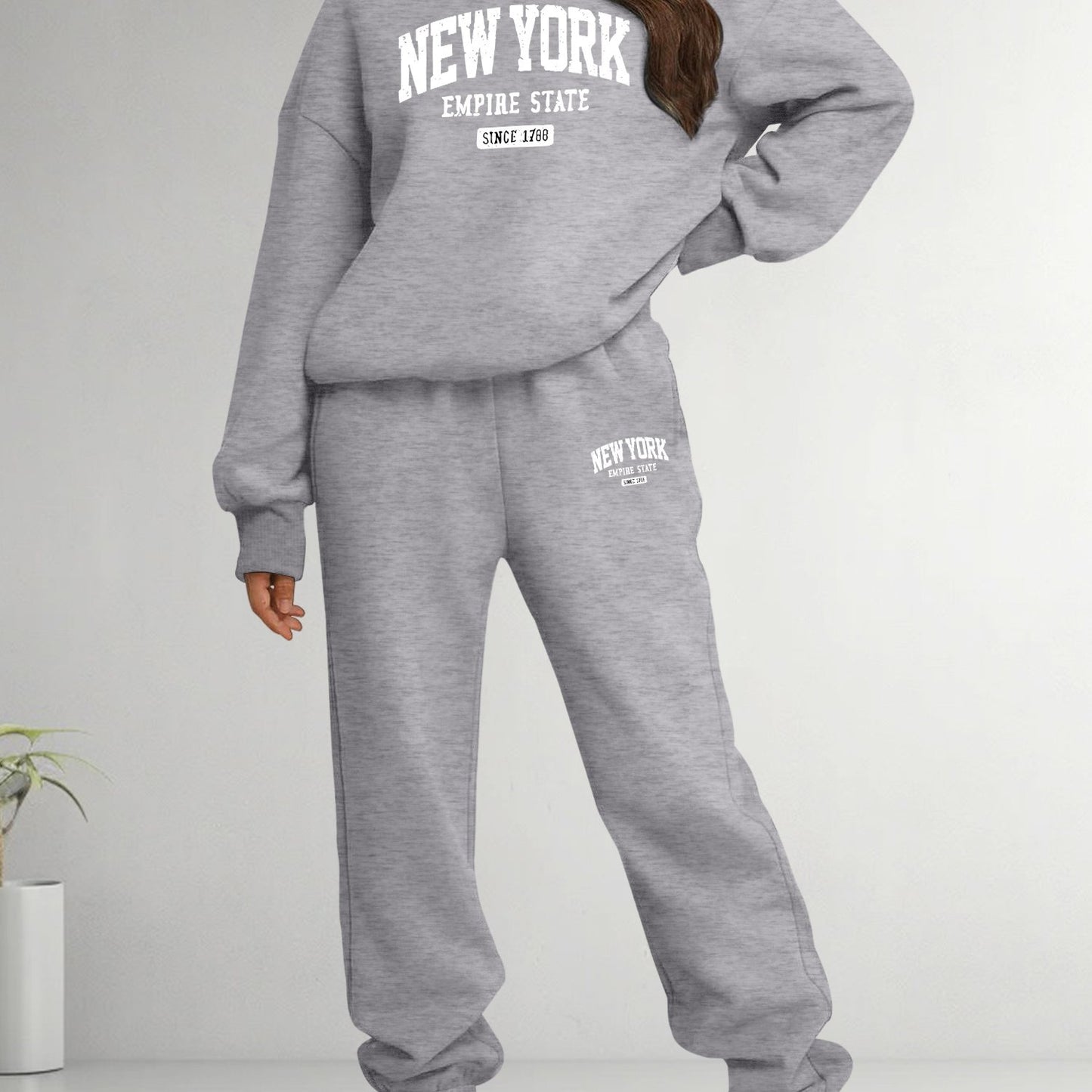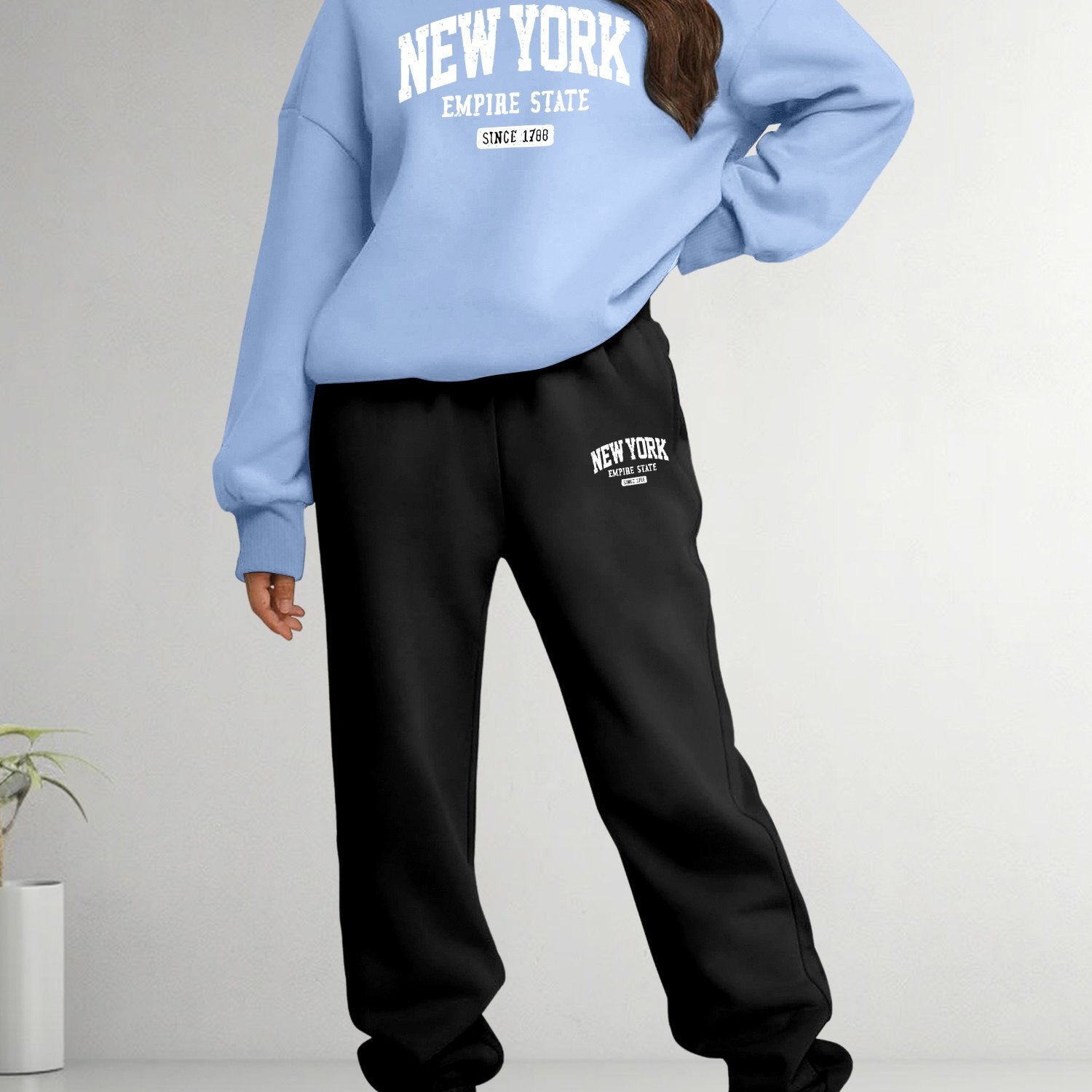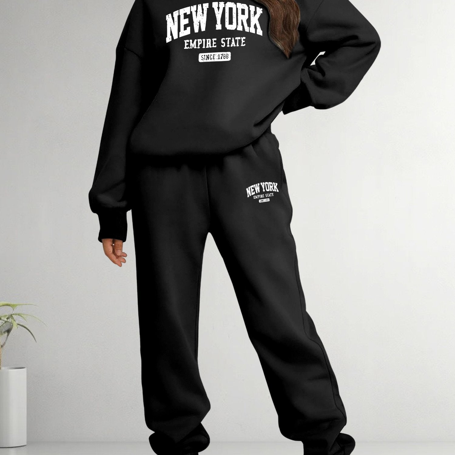 2pcs Casual Polyester Tracksuit Set for Women, New York Print Crew Neck Sweatshirt and Jogger Pants, Long Sleeve Knit Fabric Loungewear with Pockets, for Fall/Winter