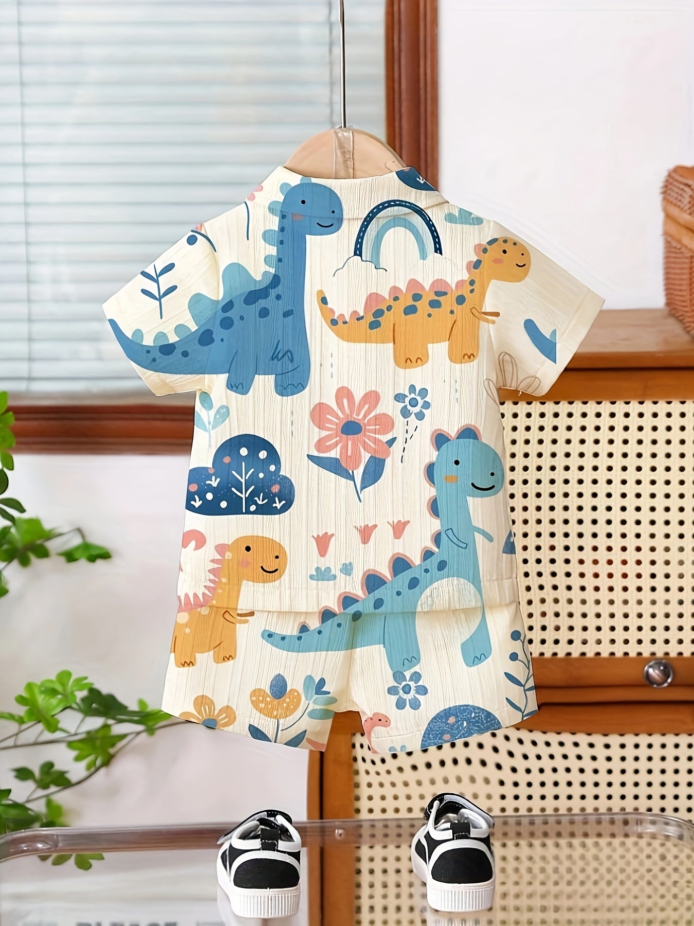 2pcs Dinosaur Print Short Sleeve Shirt & Shorts Set for Baby Boys - Casual Summer Outfit with Rainbow & Cloud Design, Polyester Fabric, Perfect for Beach & Holiday, Holiday Outfit|Playful Print|Polyester Fabric, Baby Clothes, for Outdoor