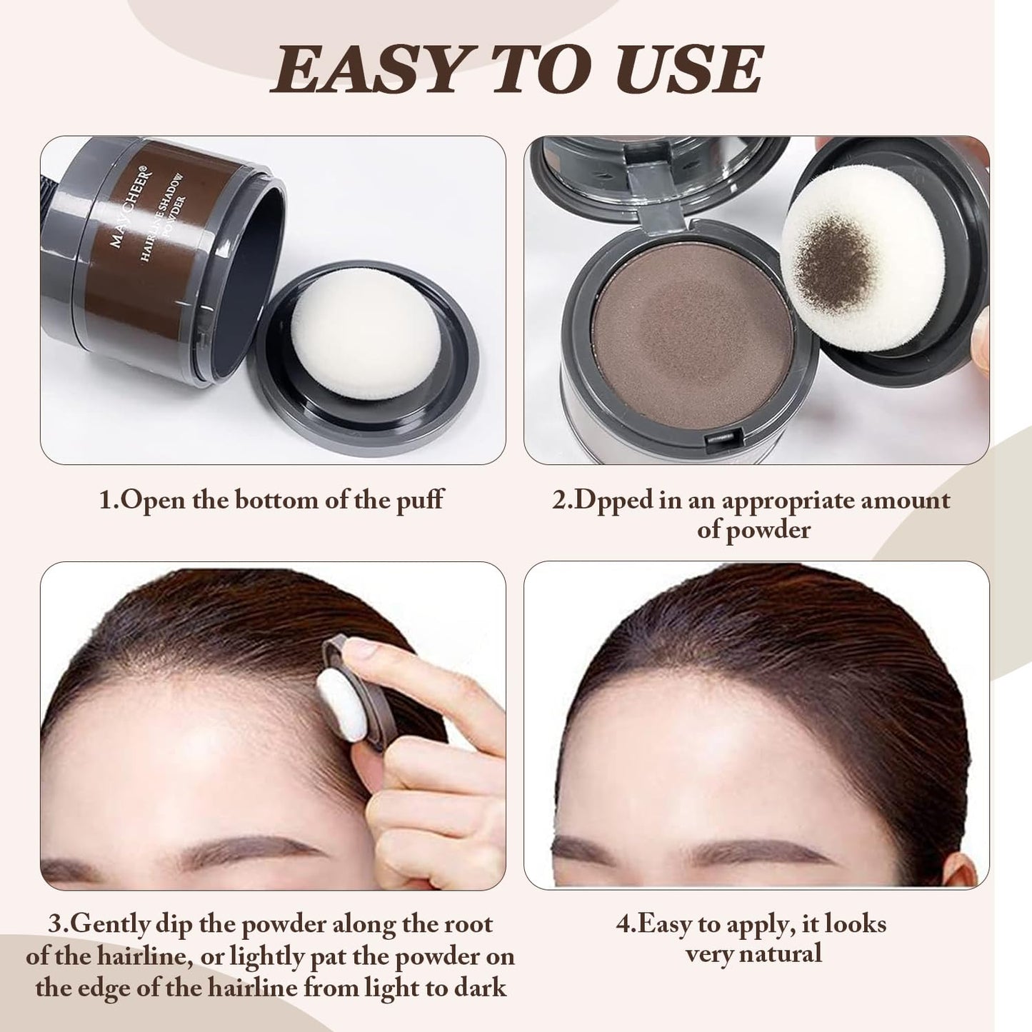 【Easy to Use】Open the bottom of the powder puff, dip an appropriate amount of powder, and gently dip the powder along the root of the hairline, or gently pat the powder on the edge of the hairline from light to dark. Pat it gently with the powder puff without any mess or trouble.