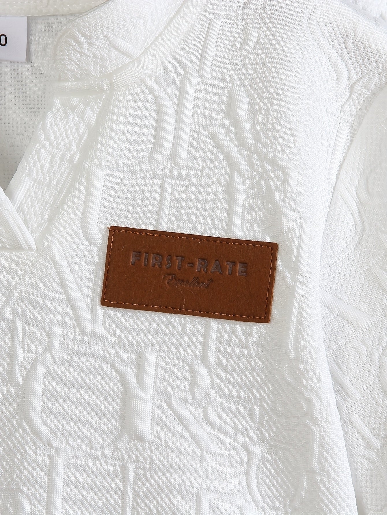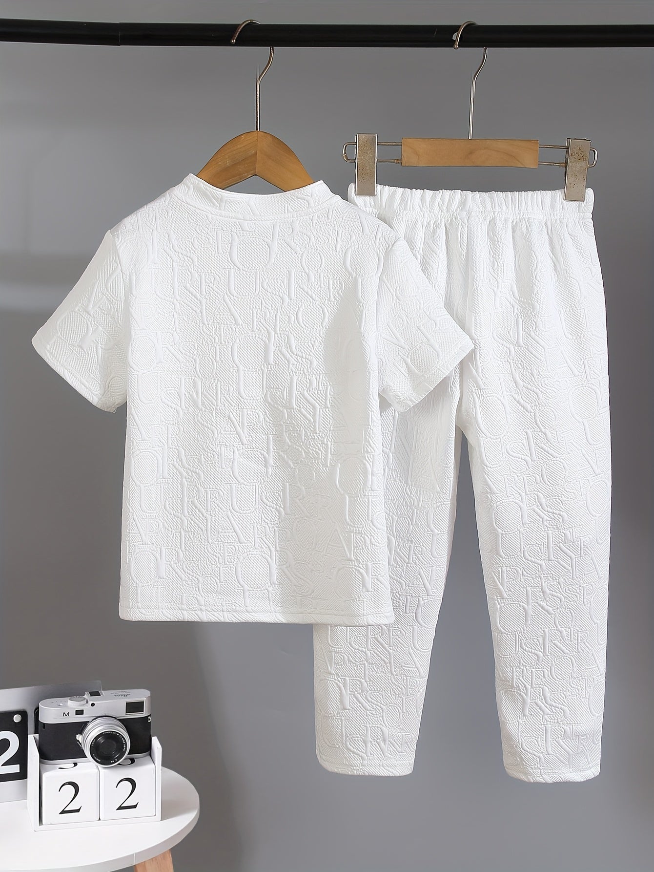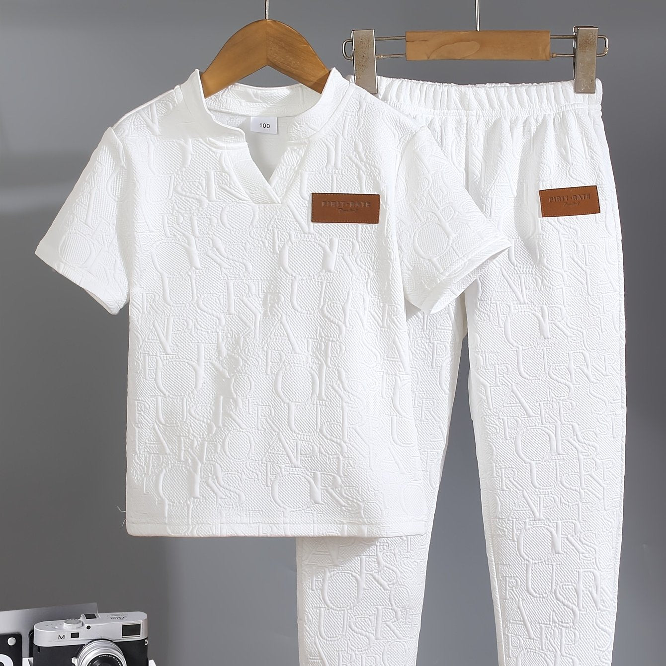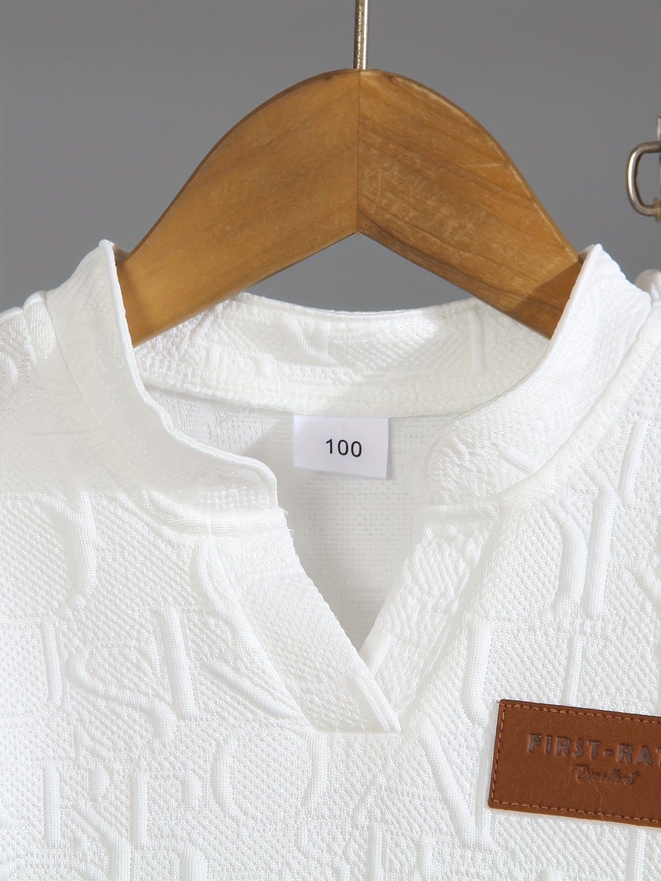 2pcs set of Young Boy textured fabric tops and pants. The small stand-up collar V-chest design is simple and fashionable, and the embellishment of Zhangzi shows the boy's personality charm, suitable for daily casual wear