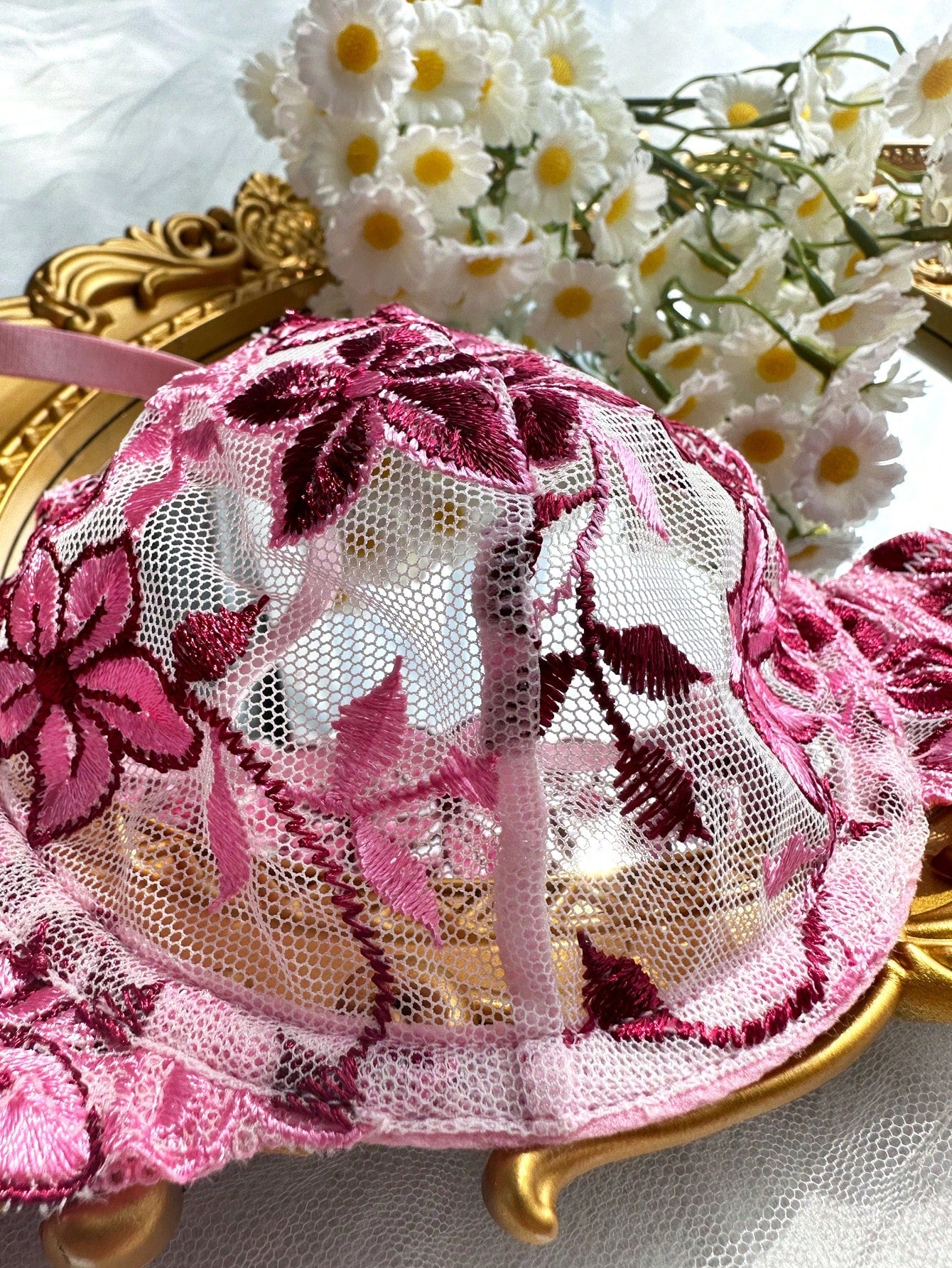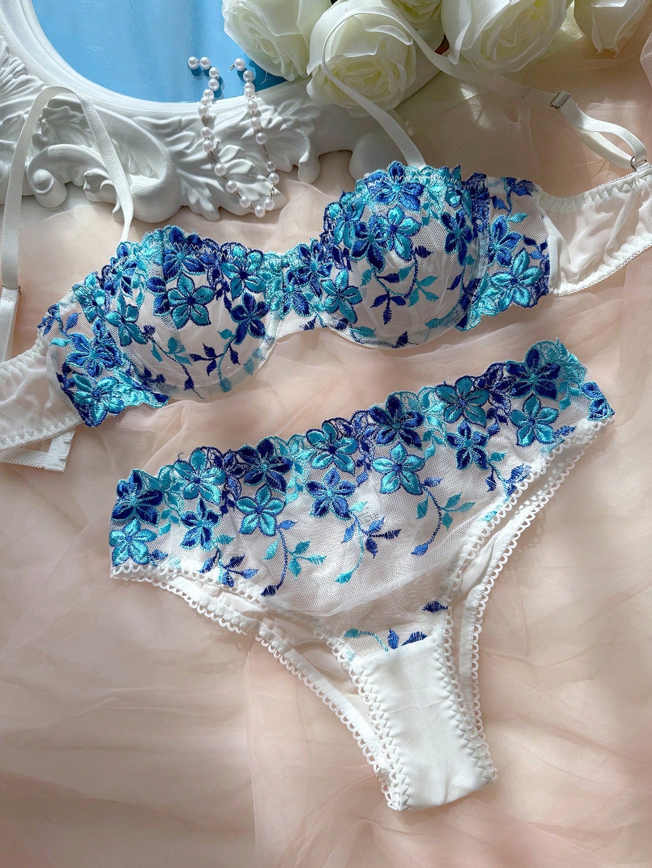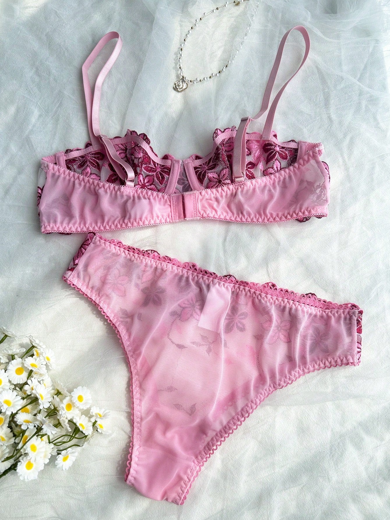 2pcs/Set Romantic Embroidered Sheer Lace Bra And Panty Set Lingerie