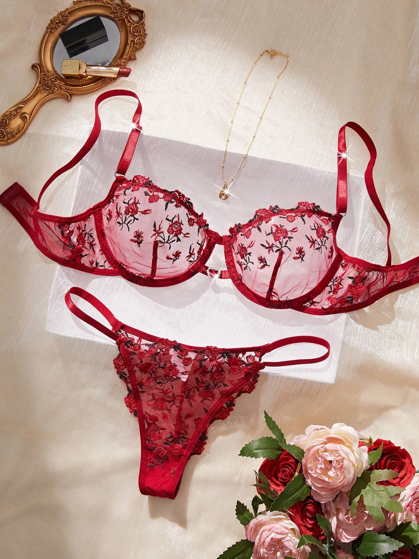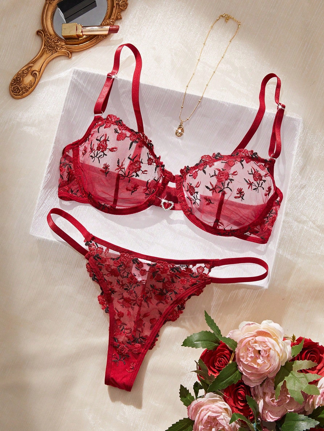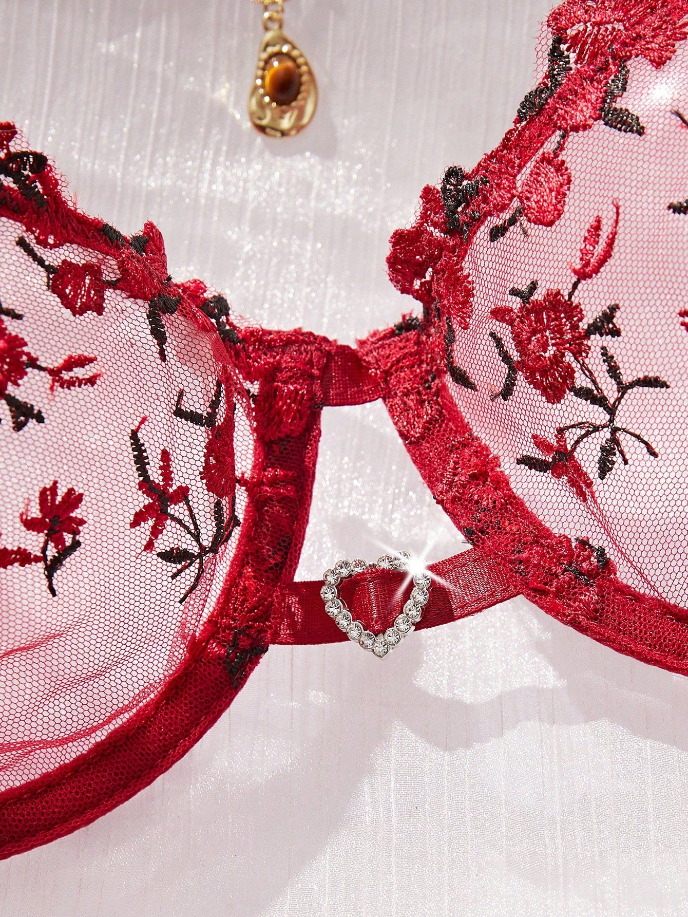 2pcs/Set Women's Heart Stone Decor Embroidered Lingerie Set