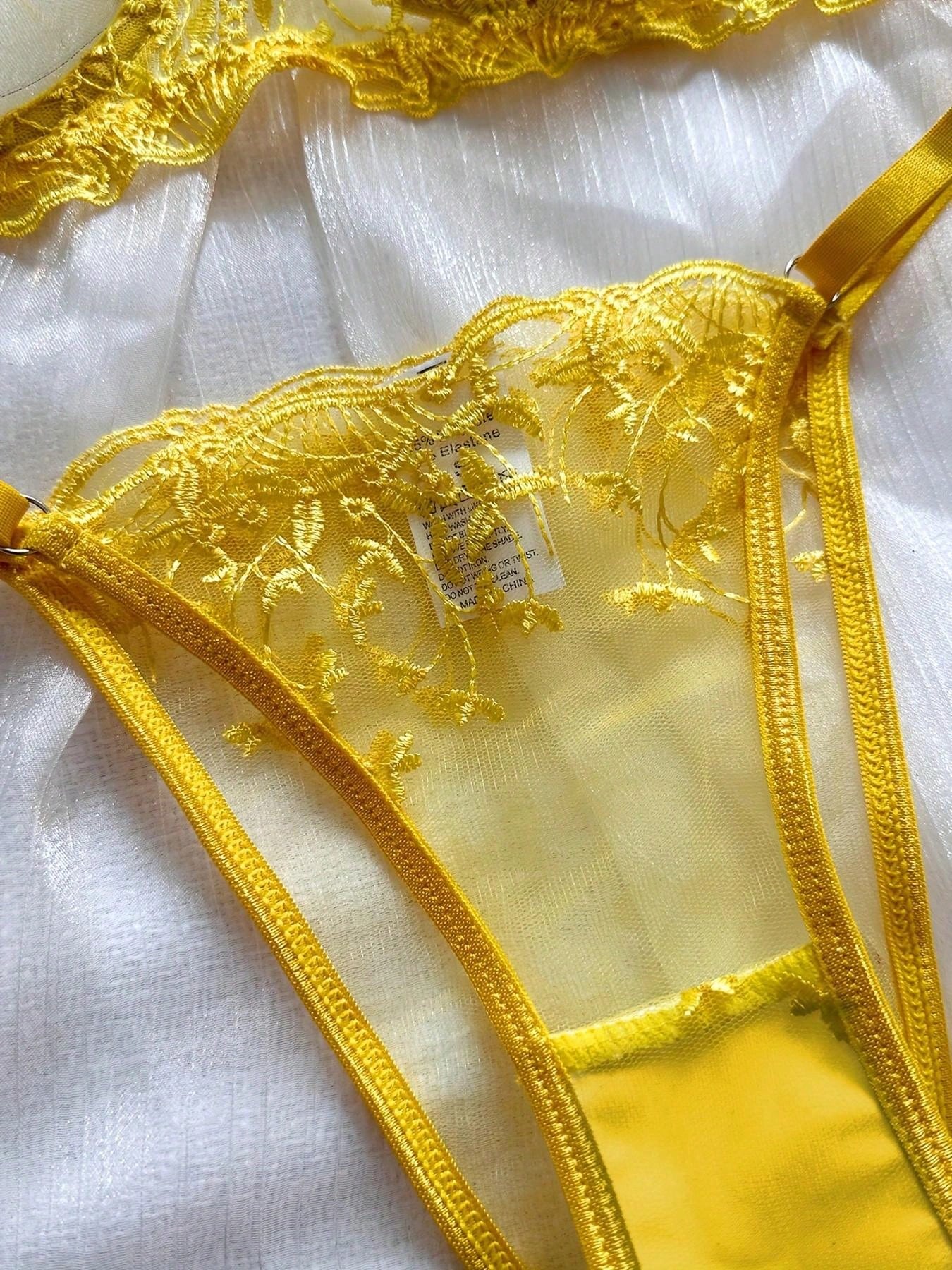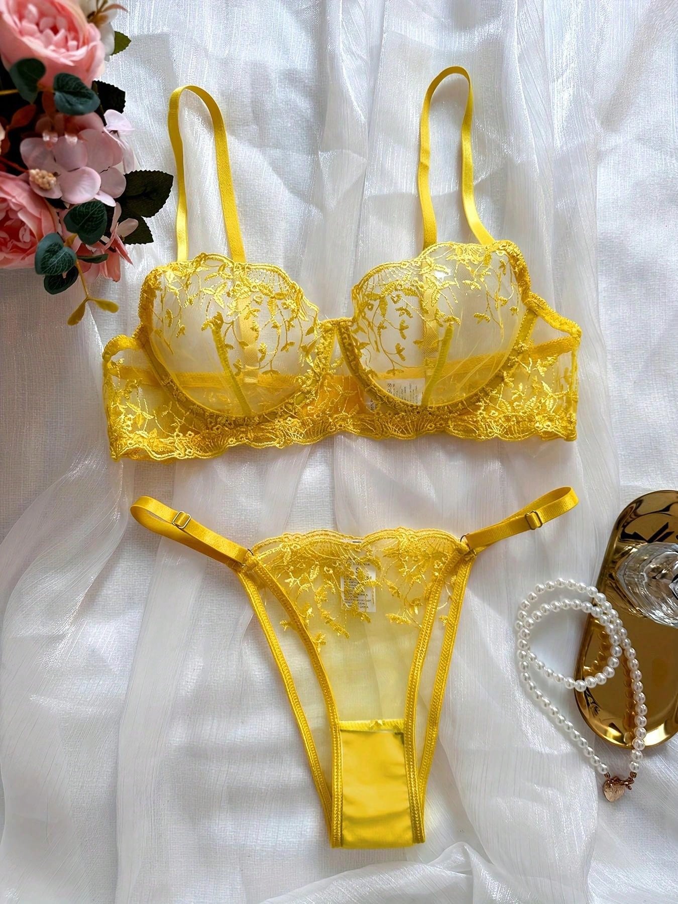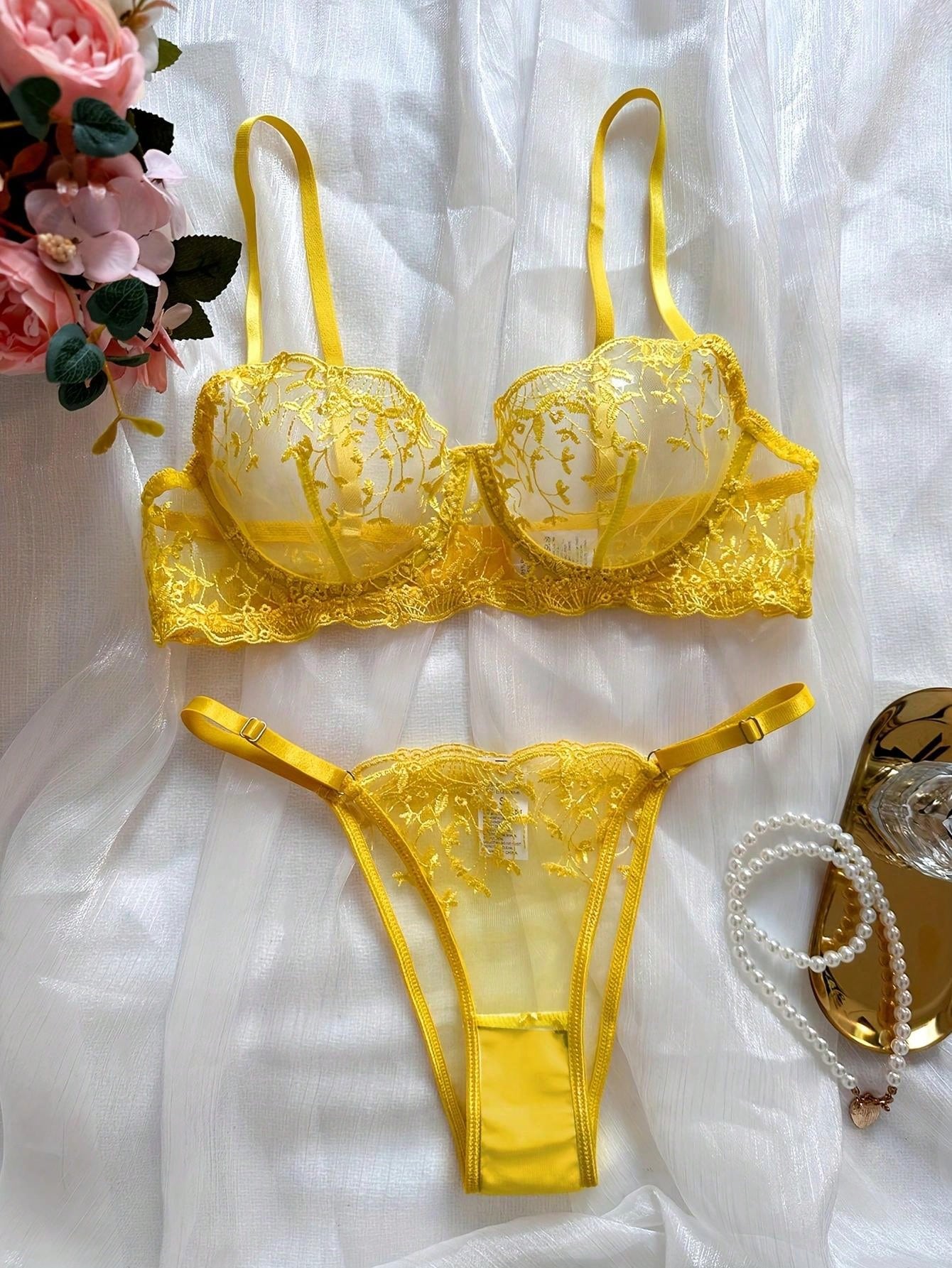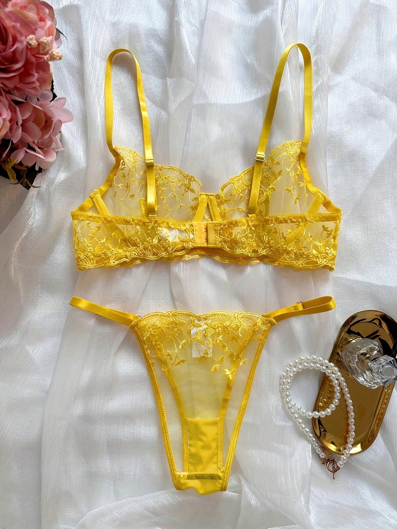 2pcs Women Sexy Lingerie Set, Yellow Mesh Floral Embroidered Sheer Bra And Panty, Intimate Apparel For Valentine's Day, Nightclub