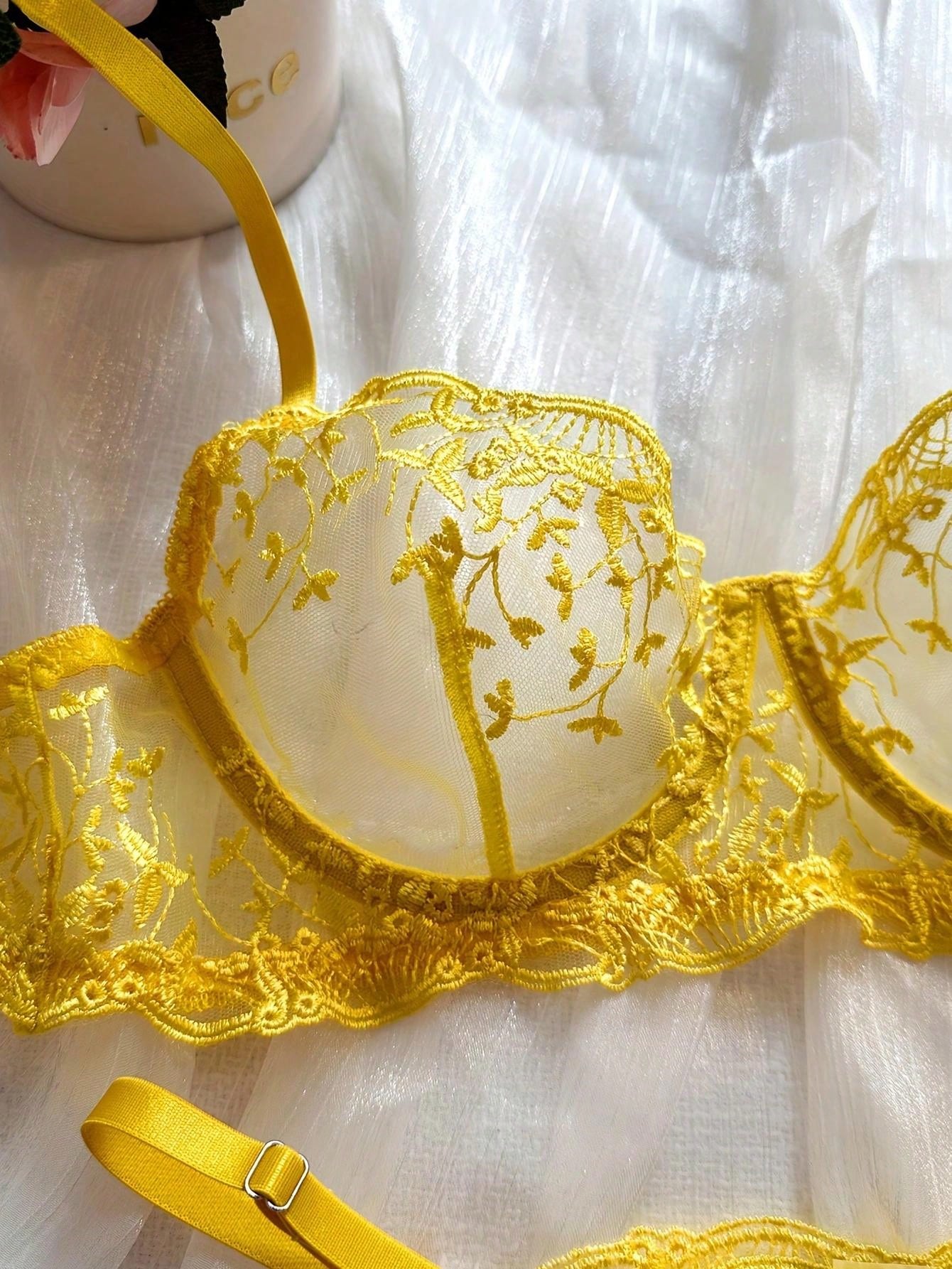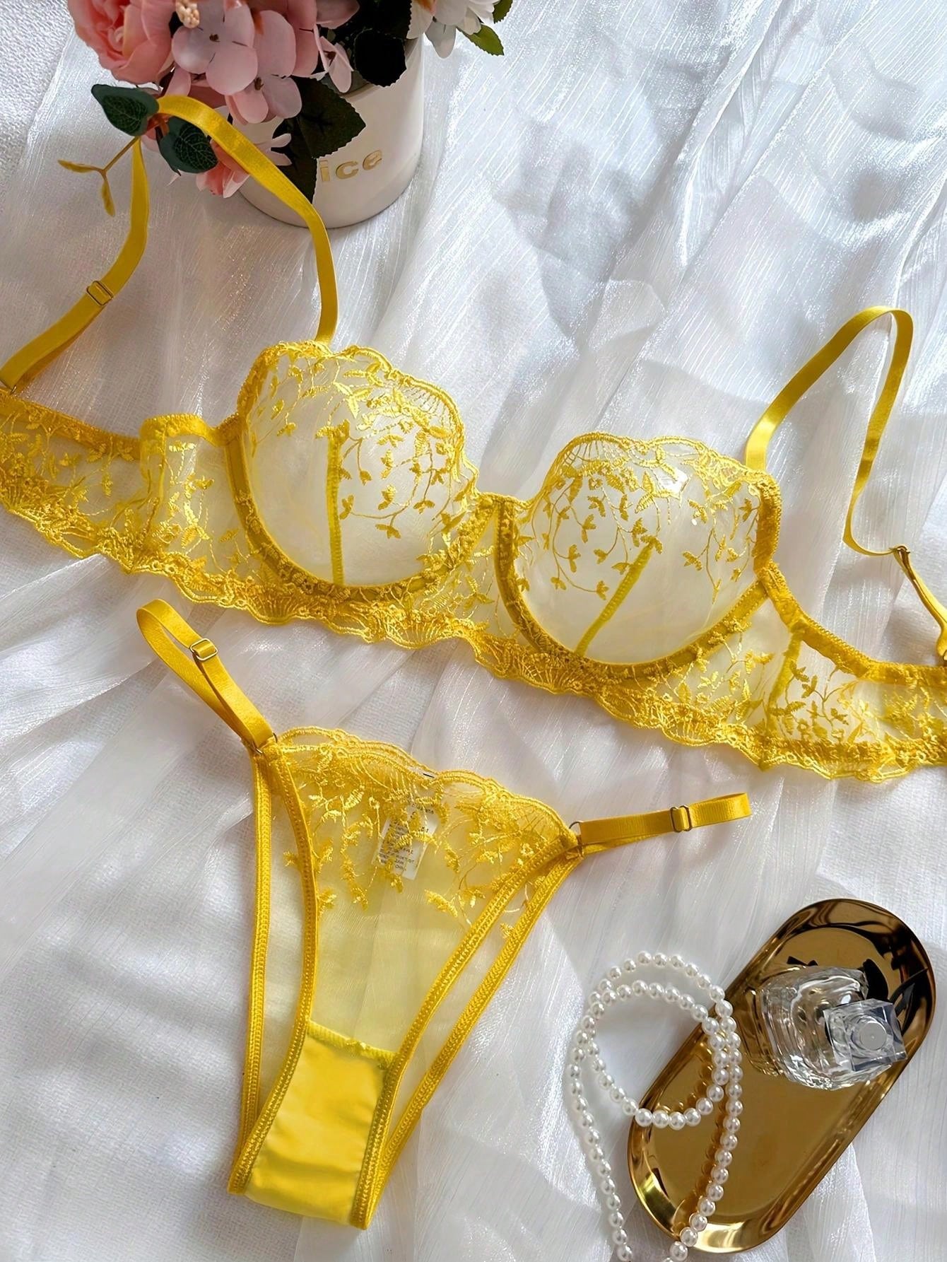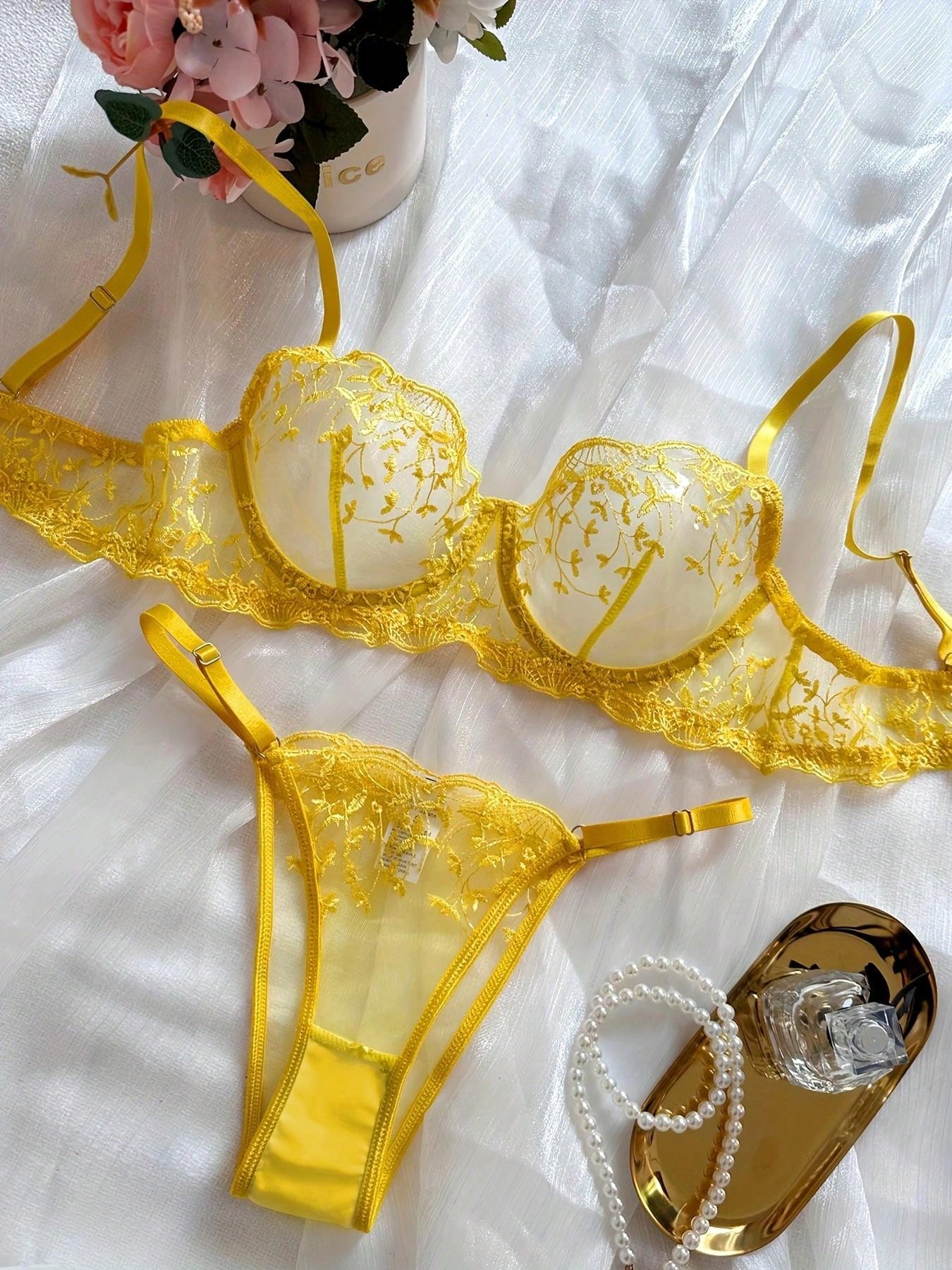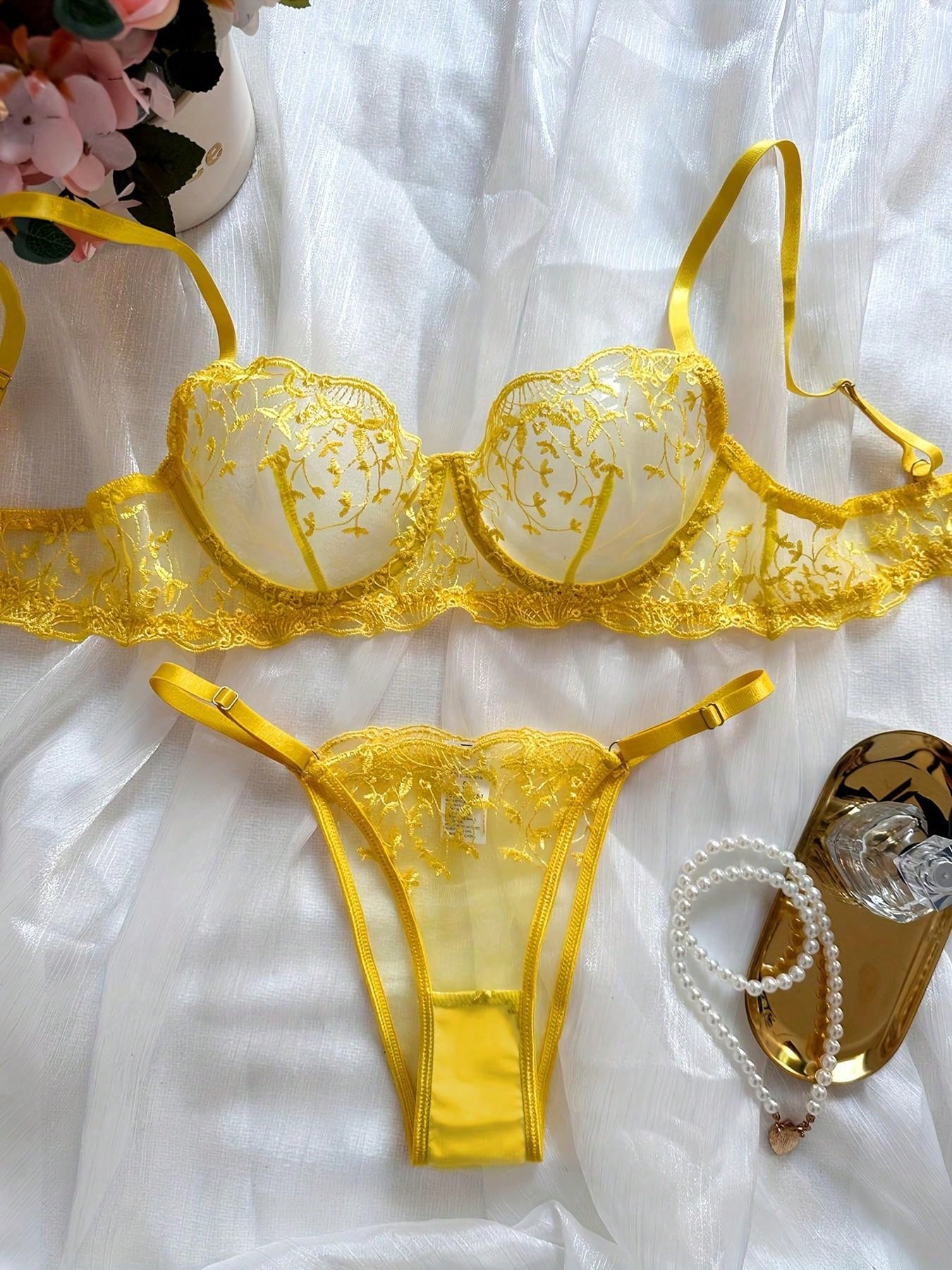2pcs Women Sexy Lingerie Set, Yellow Mesh Floral Embroidered Sheer Bra And Panty, Intimate Apparel For Valentine's Day, Nightclub