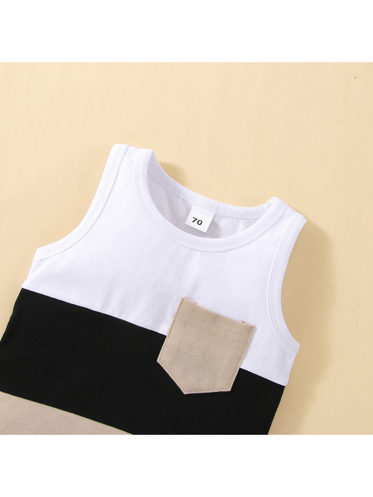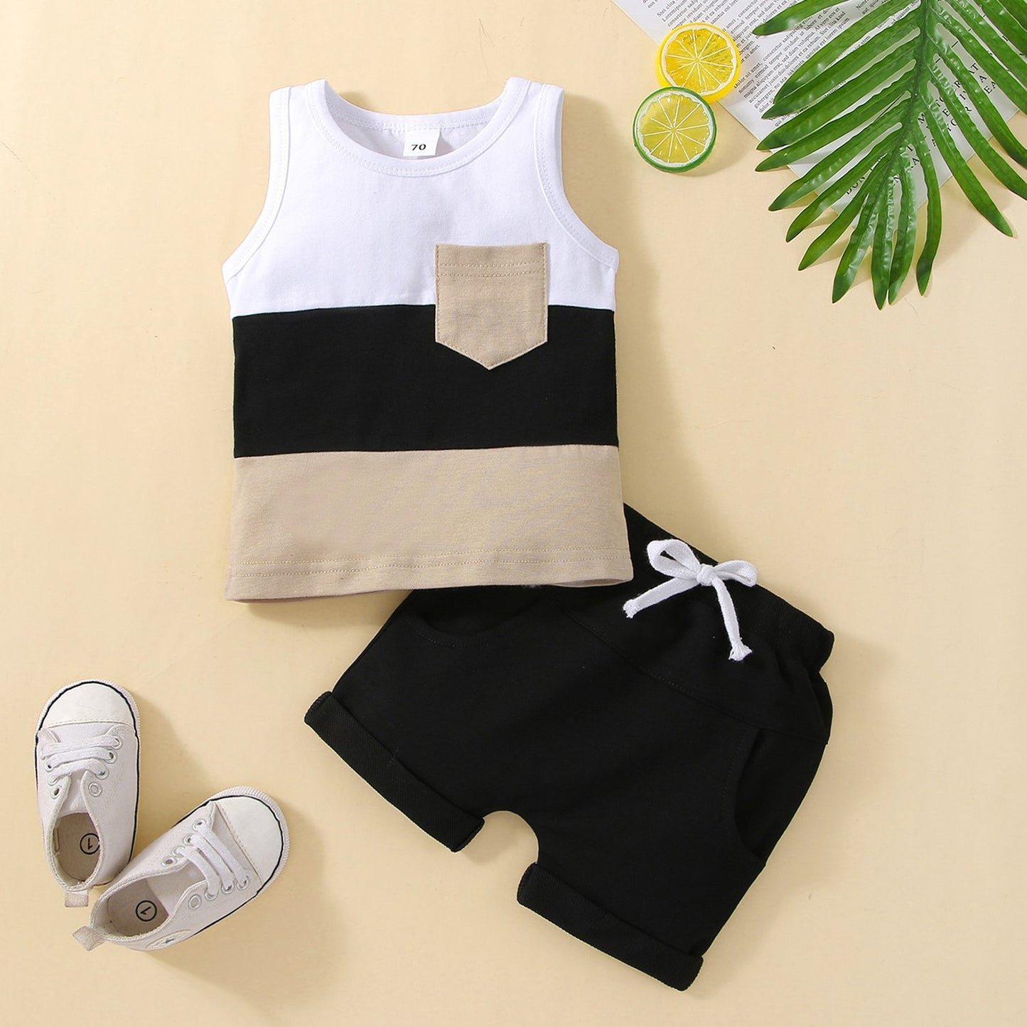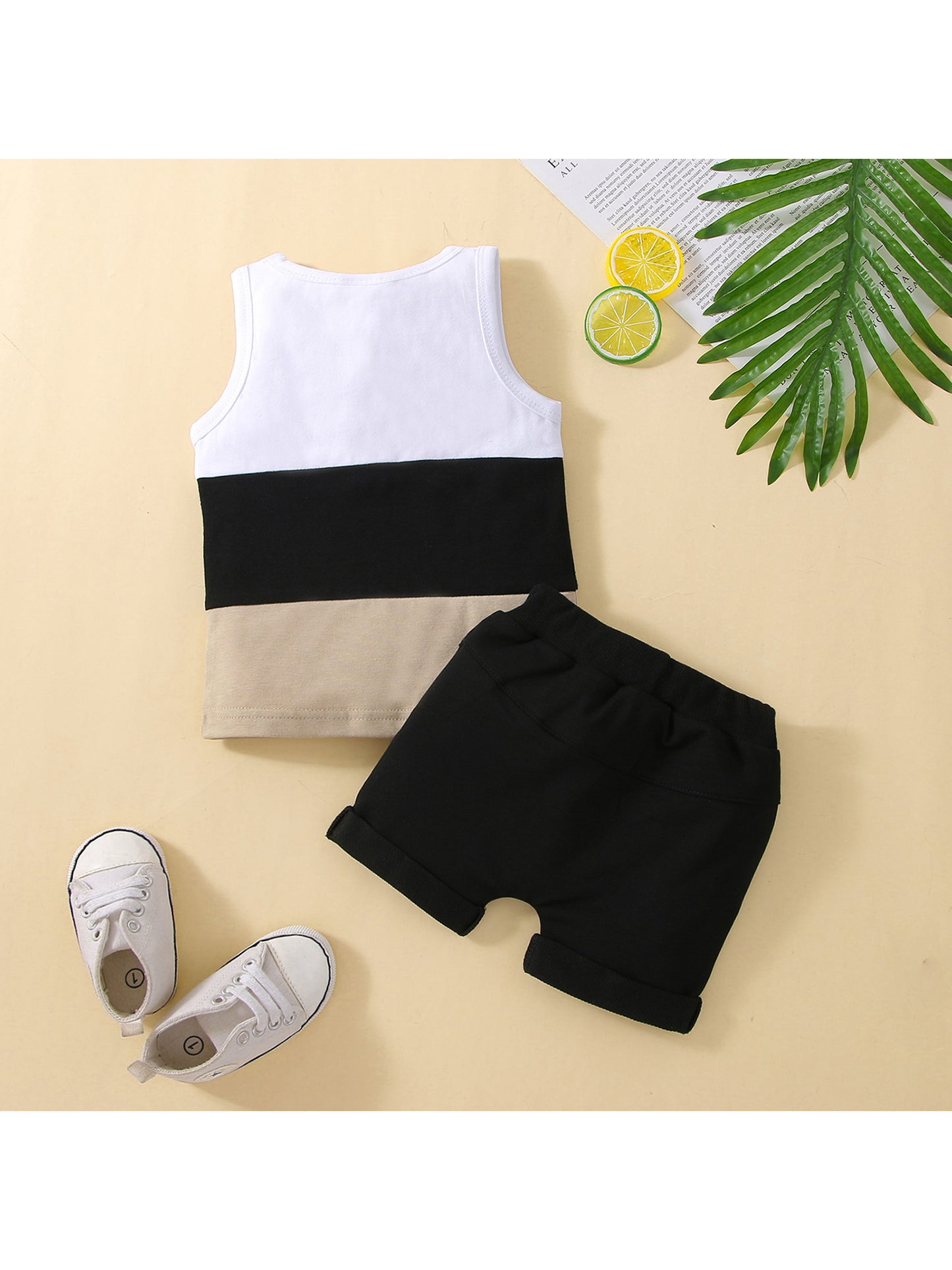 3 Months-3 Years Toddler Baby Boys 2PCS Pants Suit, Sleeveless Patchwork Crew Tank Tees + White Straps Short Pants, Toddler Boys Casual Outfit