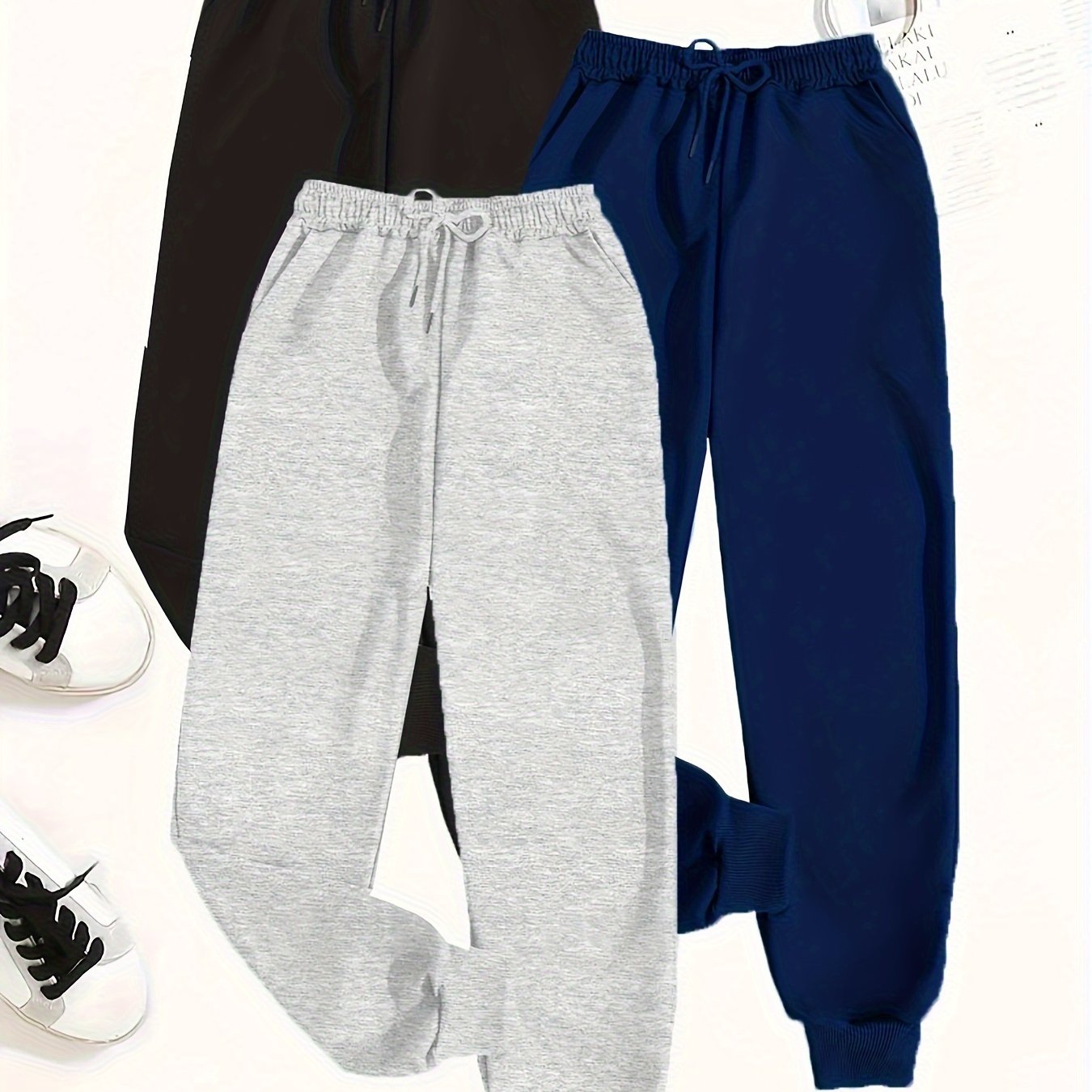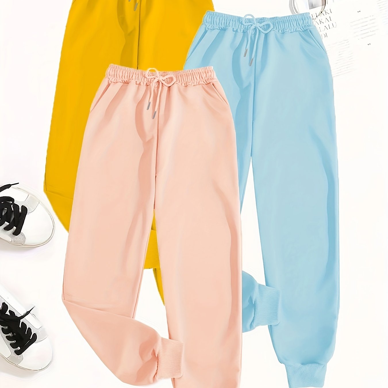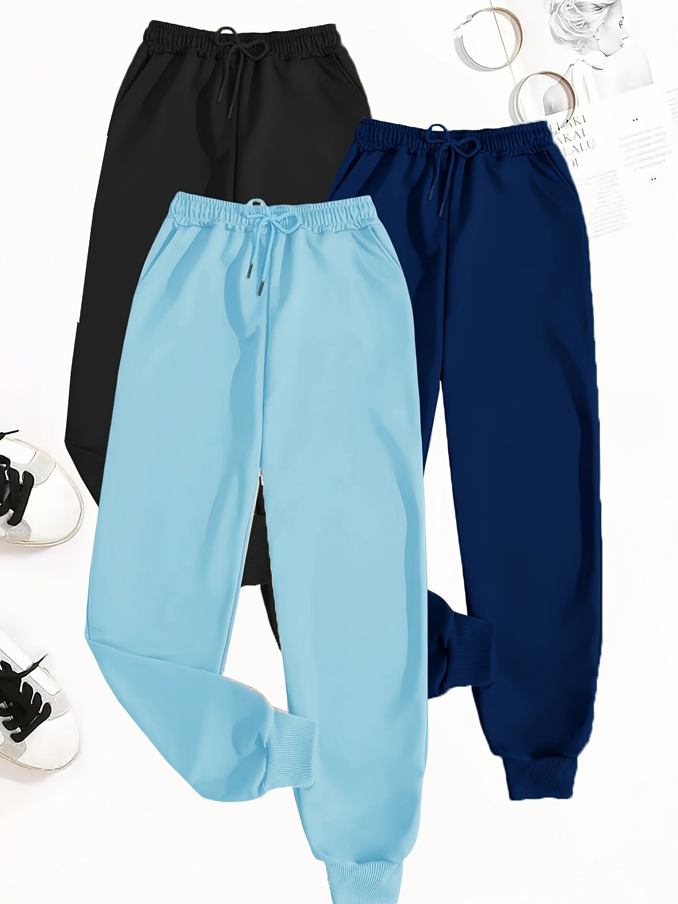 3-Pack 100% Polyester Knit Fabric Solid Color Drawstring Joggers with Pockets, All-Season Casual Elastic Waist Pants for Women - Middle-Eastern Style Regular Fit Lounge Trousers
