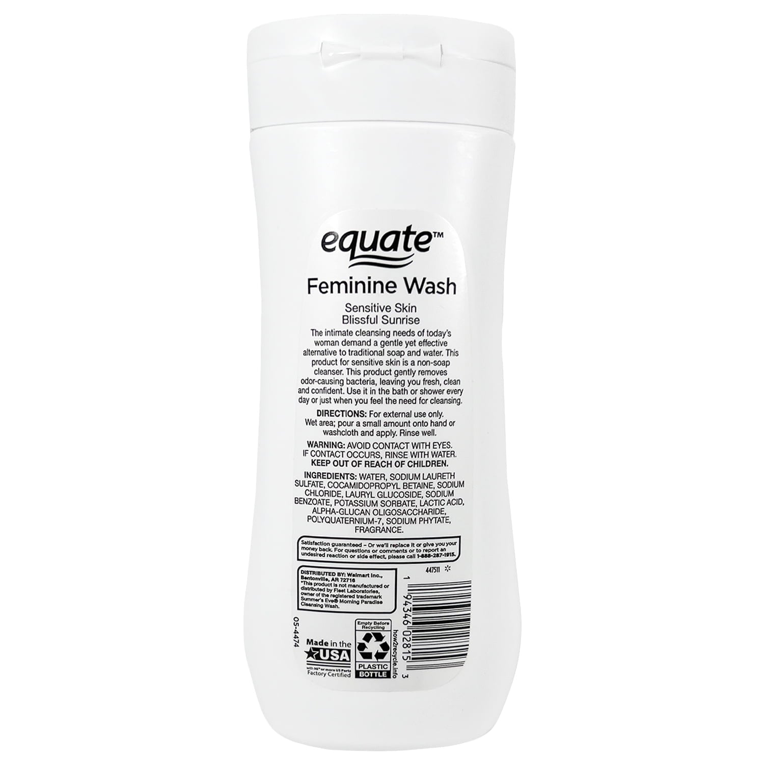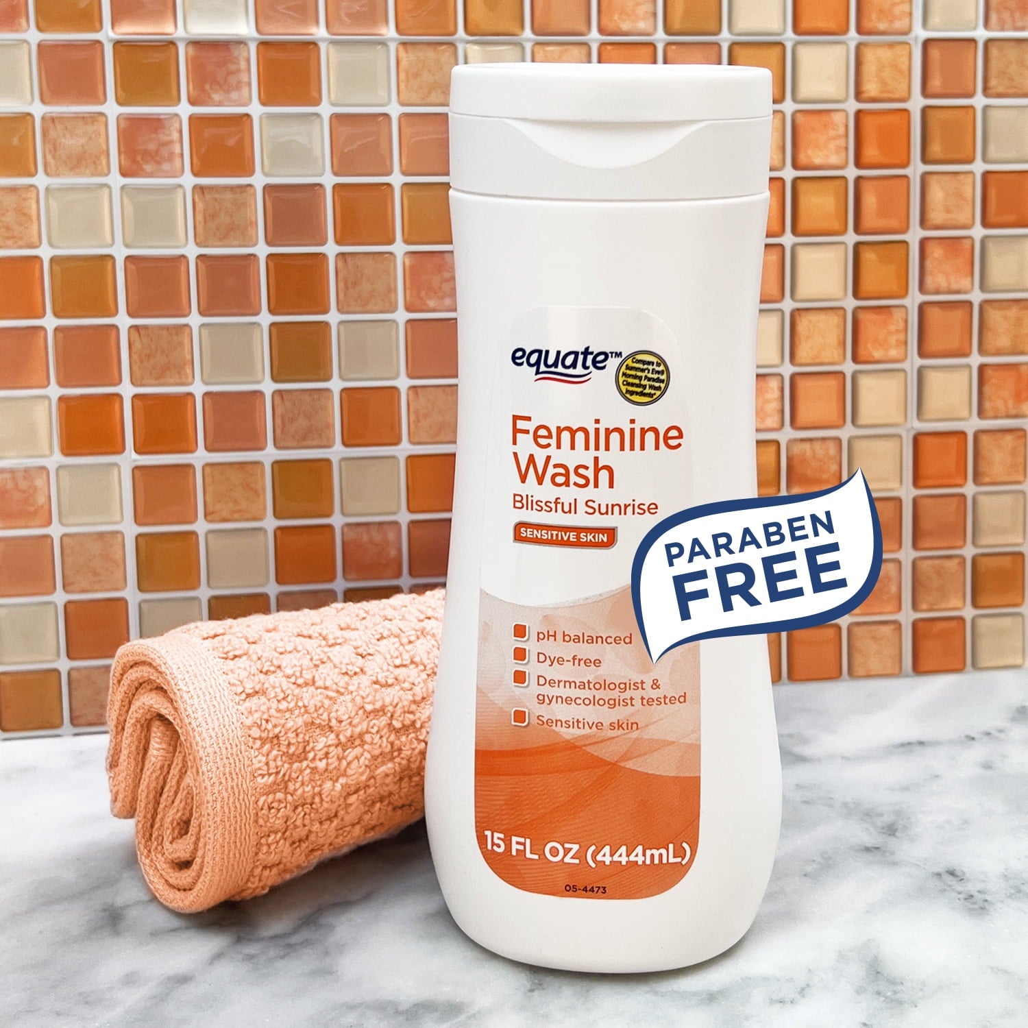 The intimate cleansing needs of today's woman demand a gentle yet effective alternative to traditional soap and water. Equate Feminine Wash Blissful Sunrise 15 oz bottle is PH balanced, dye free, dermatologist and gynecologist approved and paraben free. This product for sensitive skin is a non stop cleanser. This product gently removes odor causing bacteria, leaving you fresh, clean and confident. Use in the bath or shower every day or when you feel the need for cleansing.