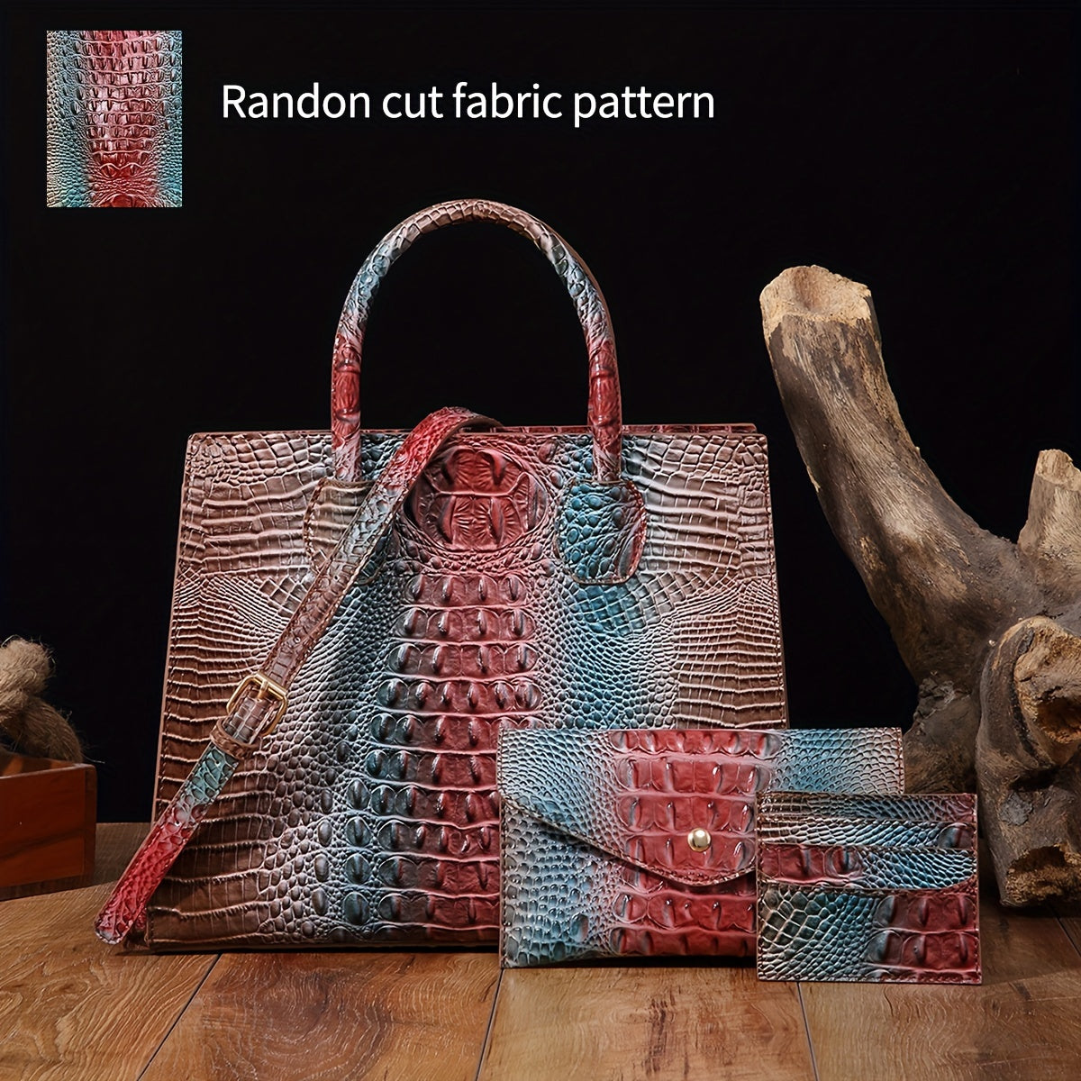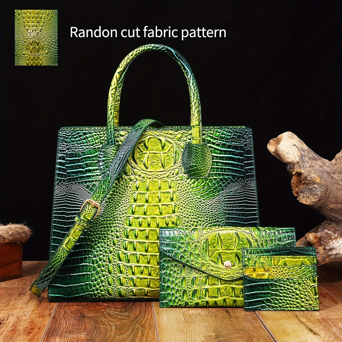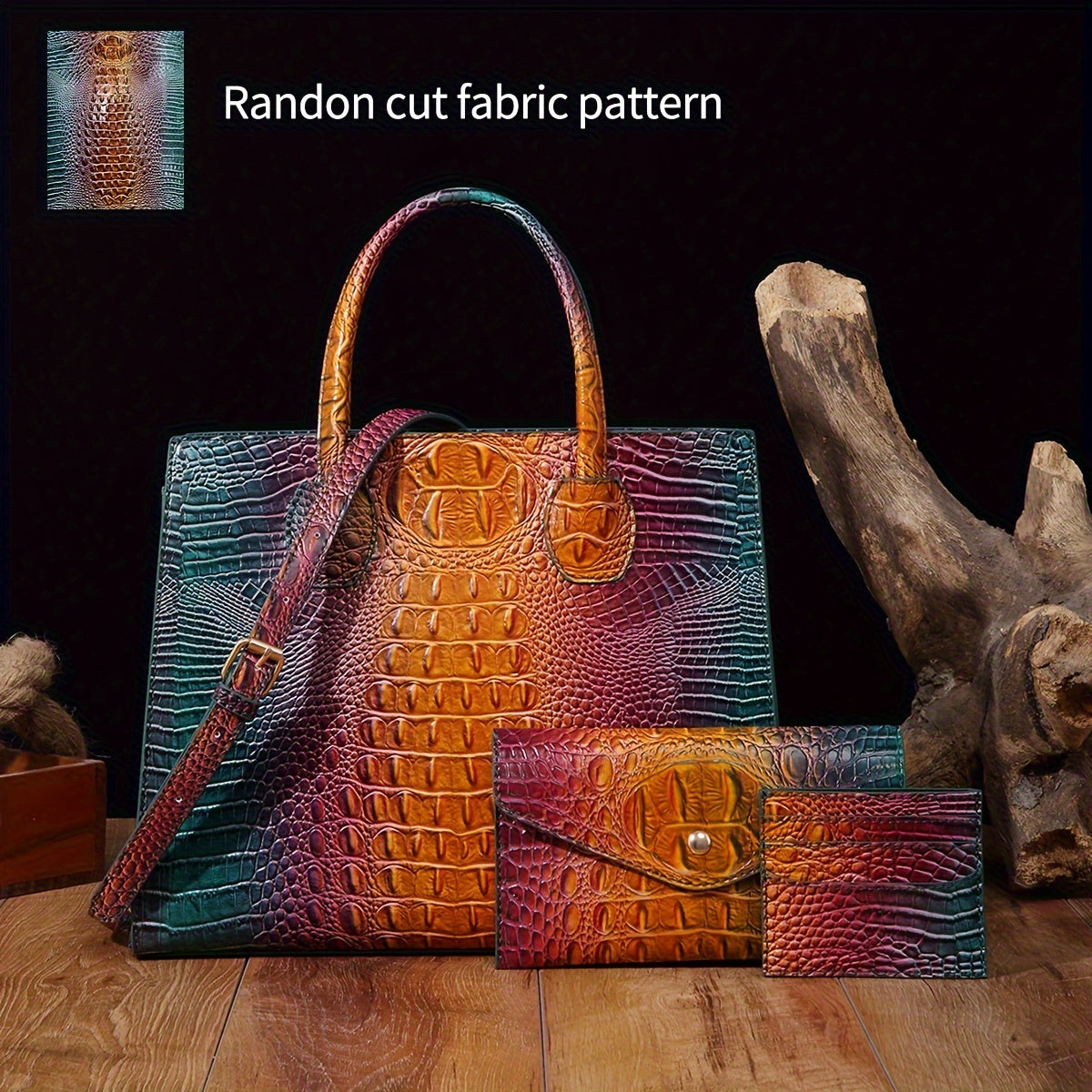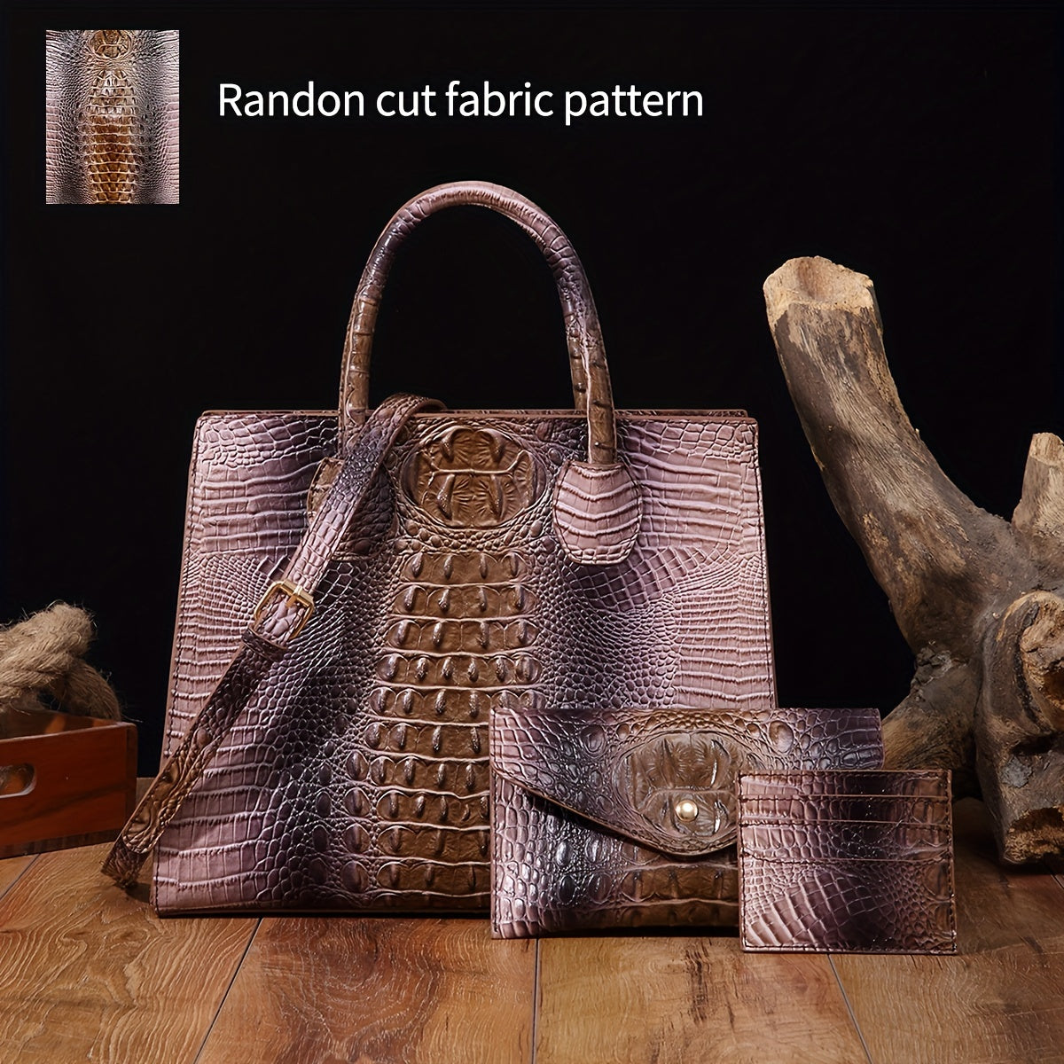 3 Pcs Crocodile Pattern Handbag & Purses Set, Multi-functional Vintage Top Handle Crossbody Bag & Business Clutch Bag & Card Coin Purse