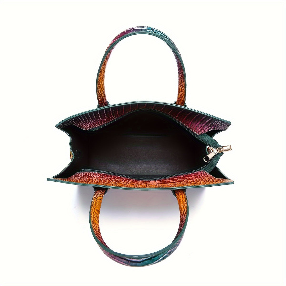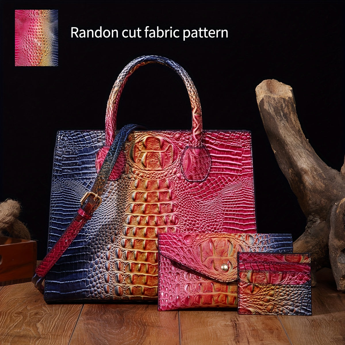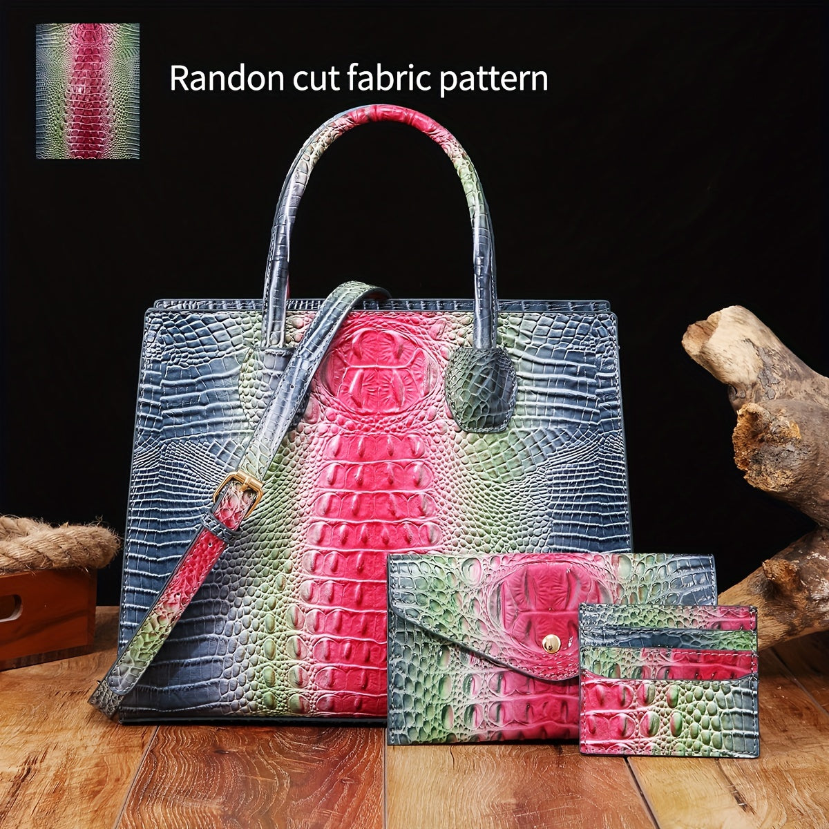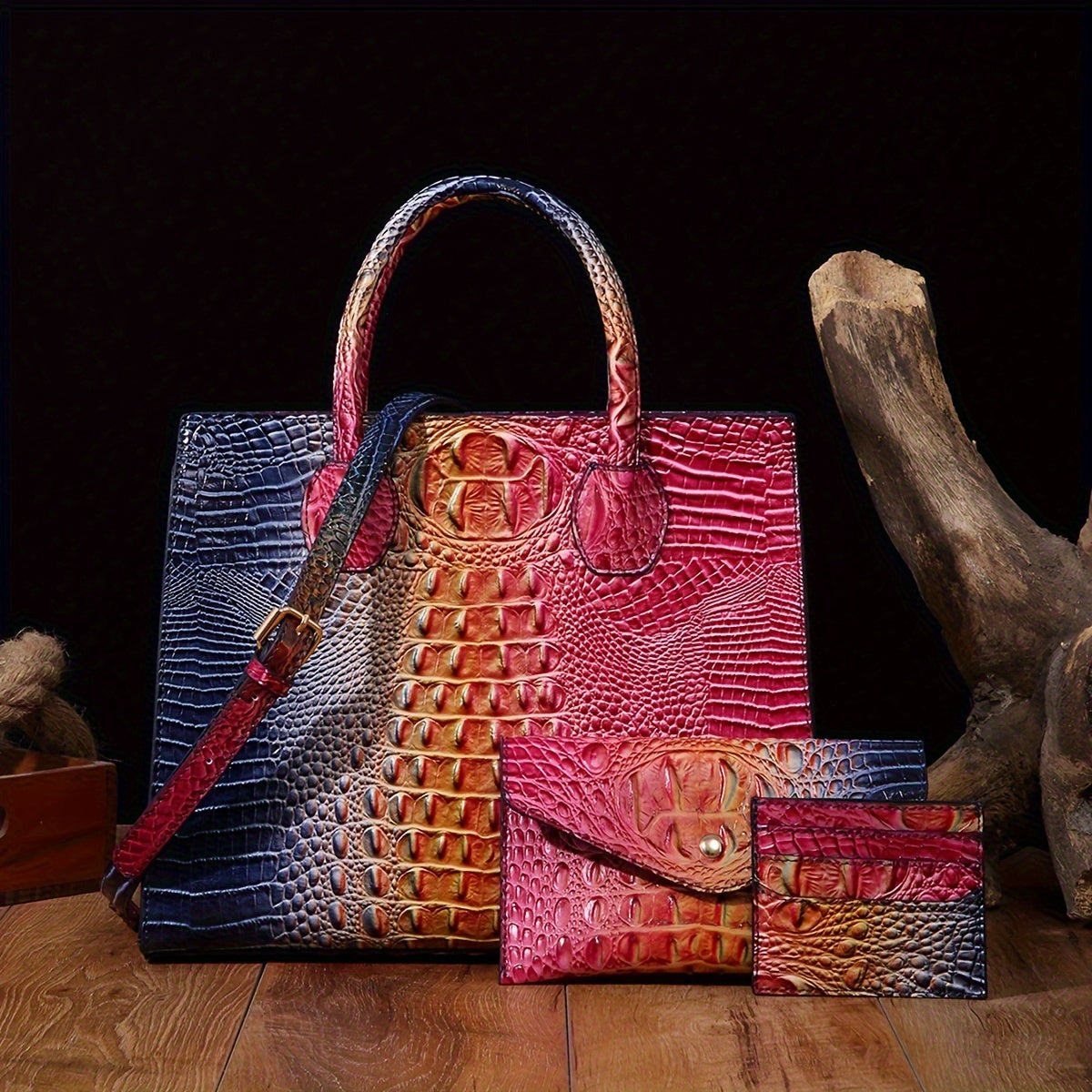 3 Pcs Crocodile Pattern Handbag & Purses Set, Multi-functional Vintage Top Handle Crossbody Bag & Business Clutch Bag & Card Coin Purse
