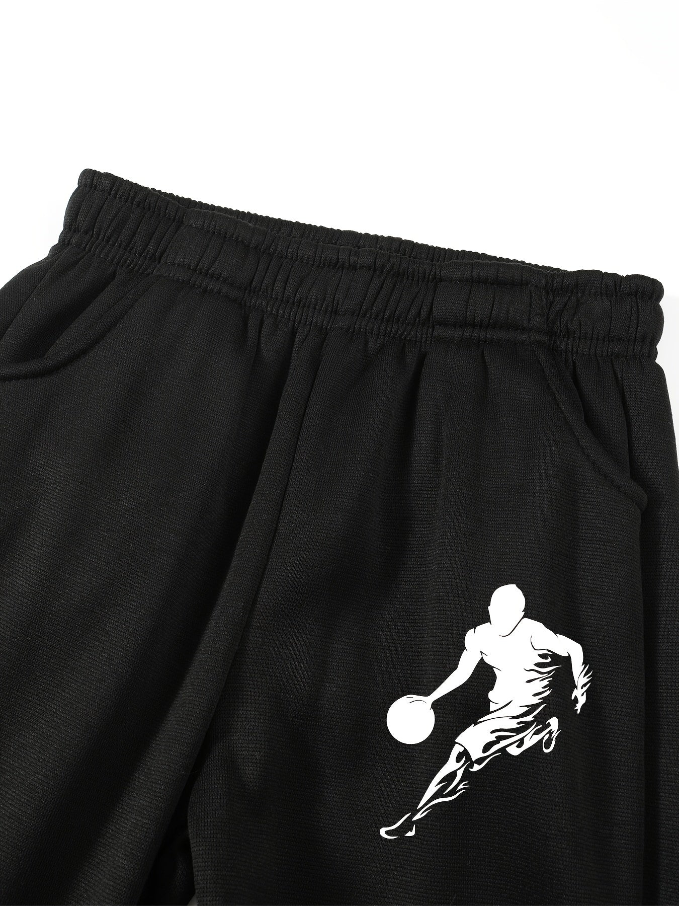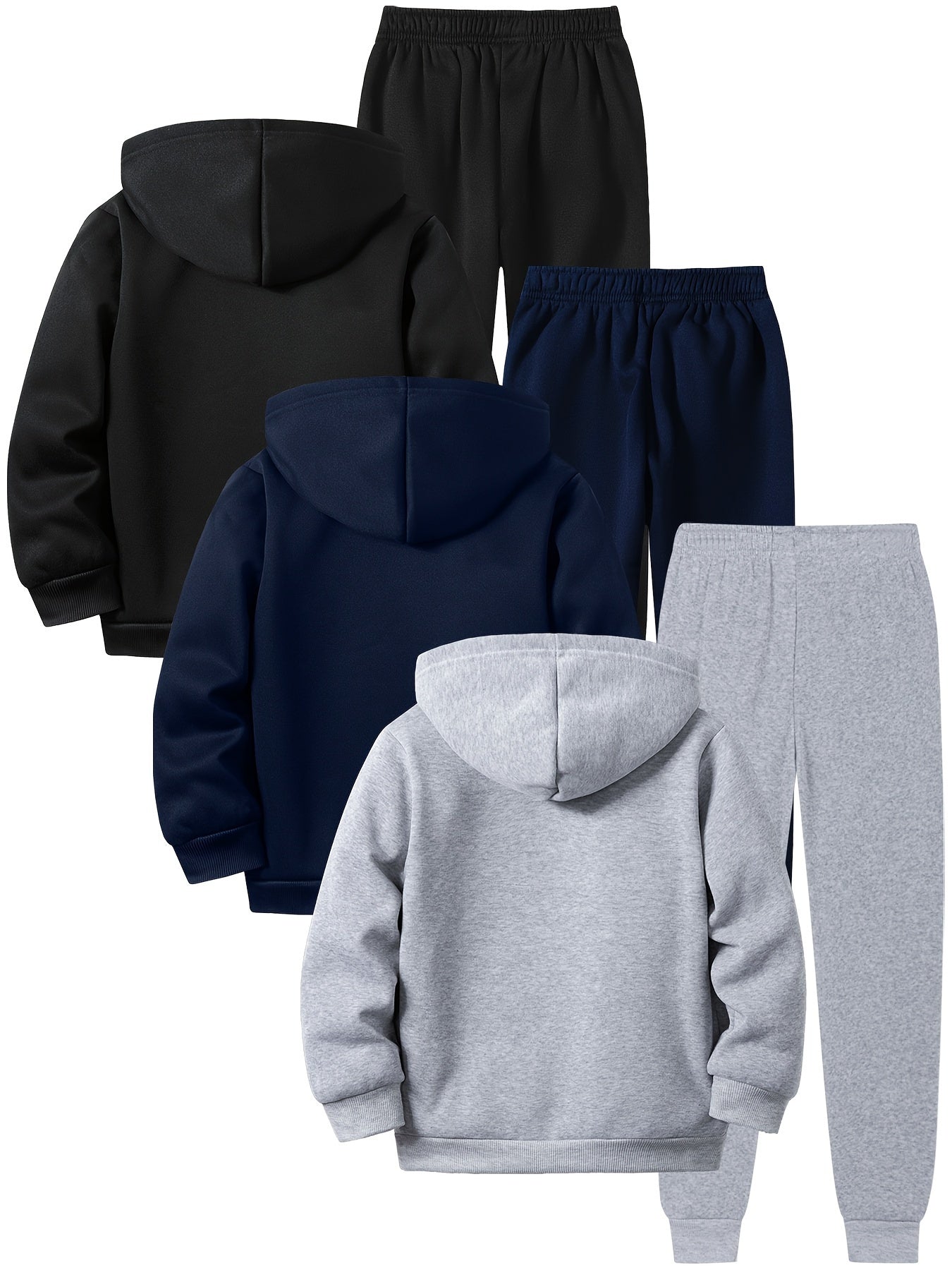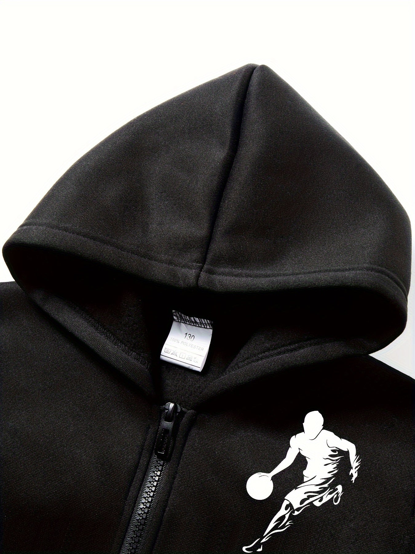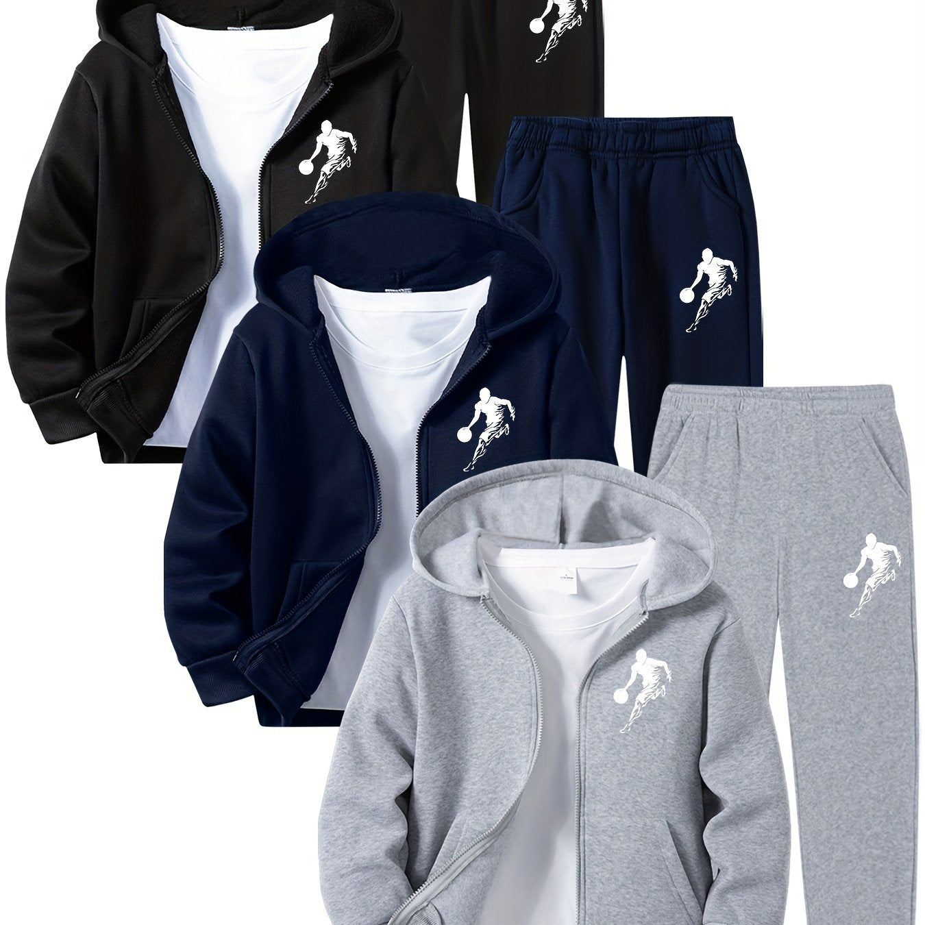 3 Sets Boy's Fleece Lining Casual Outfits - Basketball Silhouette Pattern Print - Long Sleeve Hooded Jacket & Loose Pants - Autumn Winter Outdoor