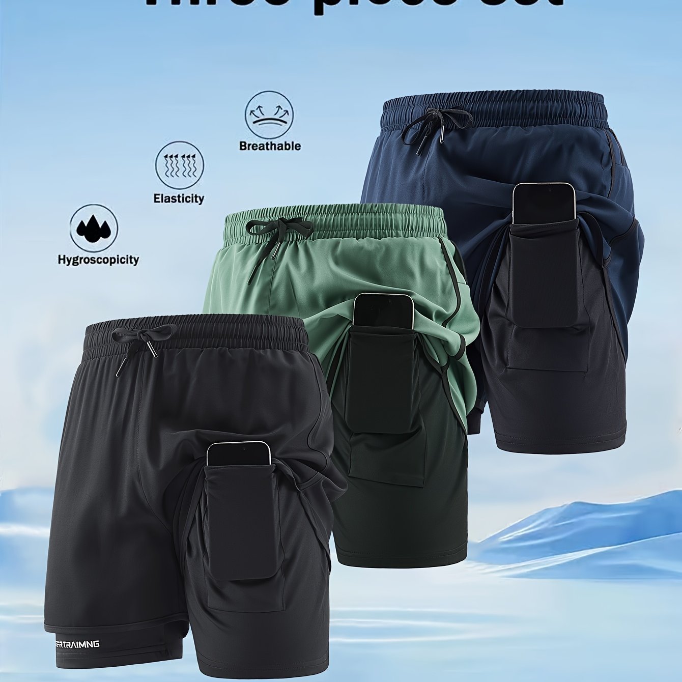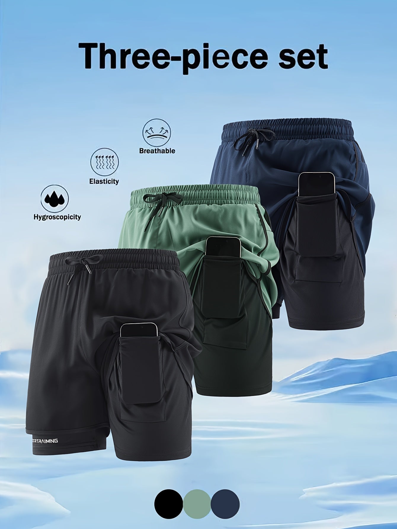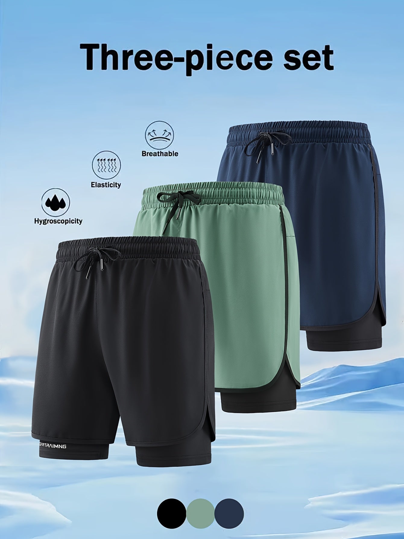 3pcs Men's 2-in-1 Running & Fitness Shorts - Breathable Polyester Blend, Elastic Waistband, Zipper Pockets for Gym, Training