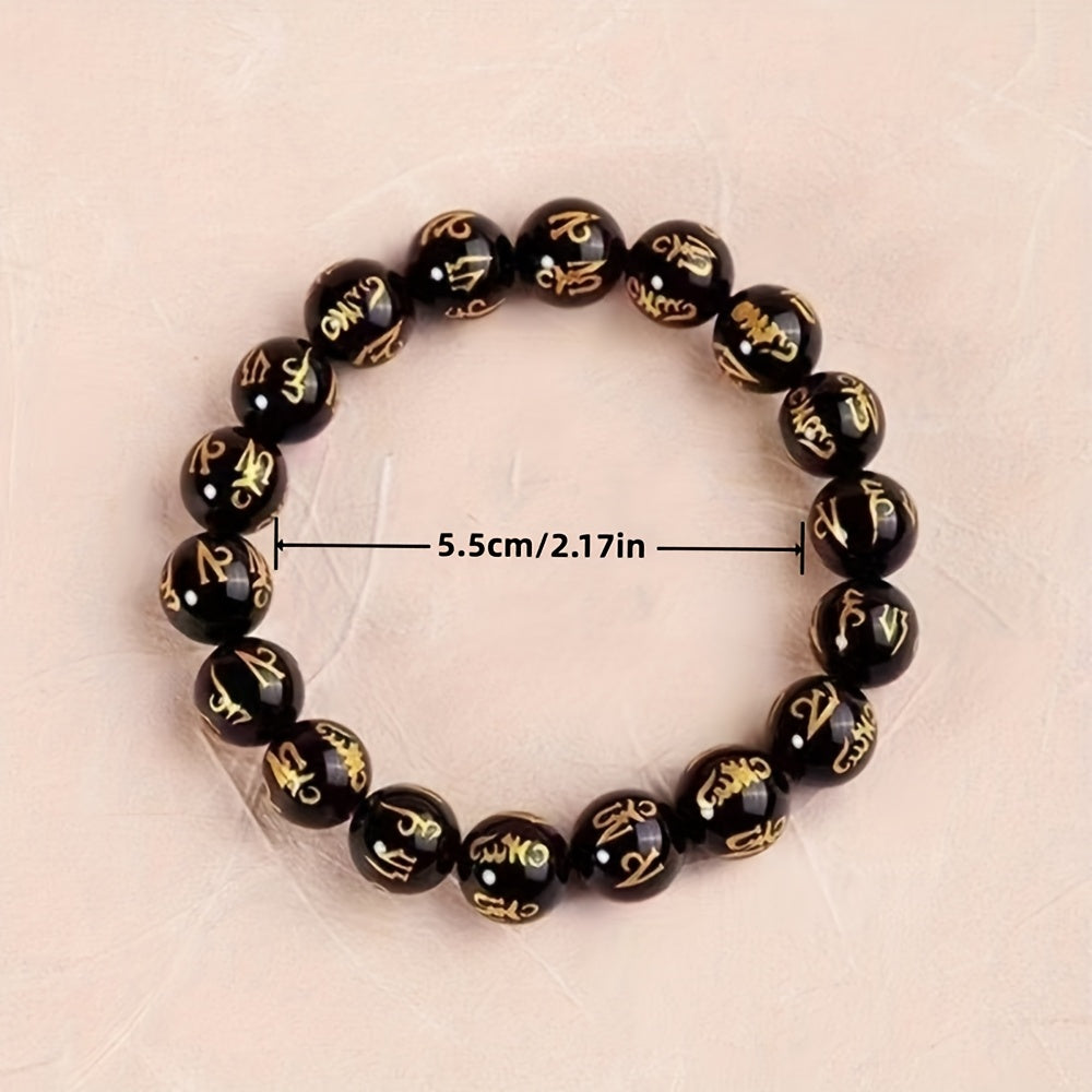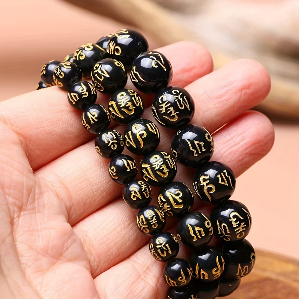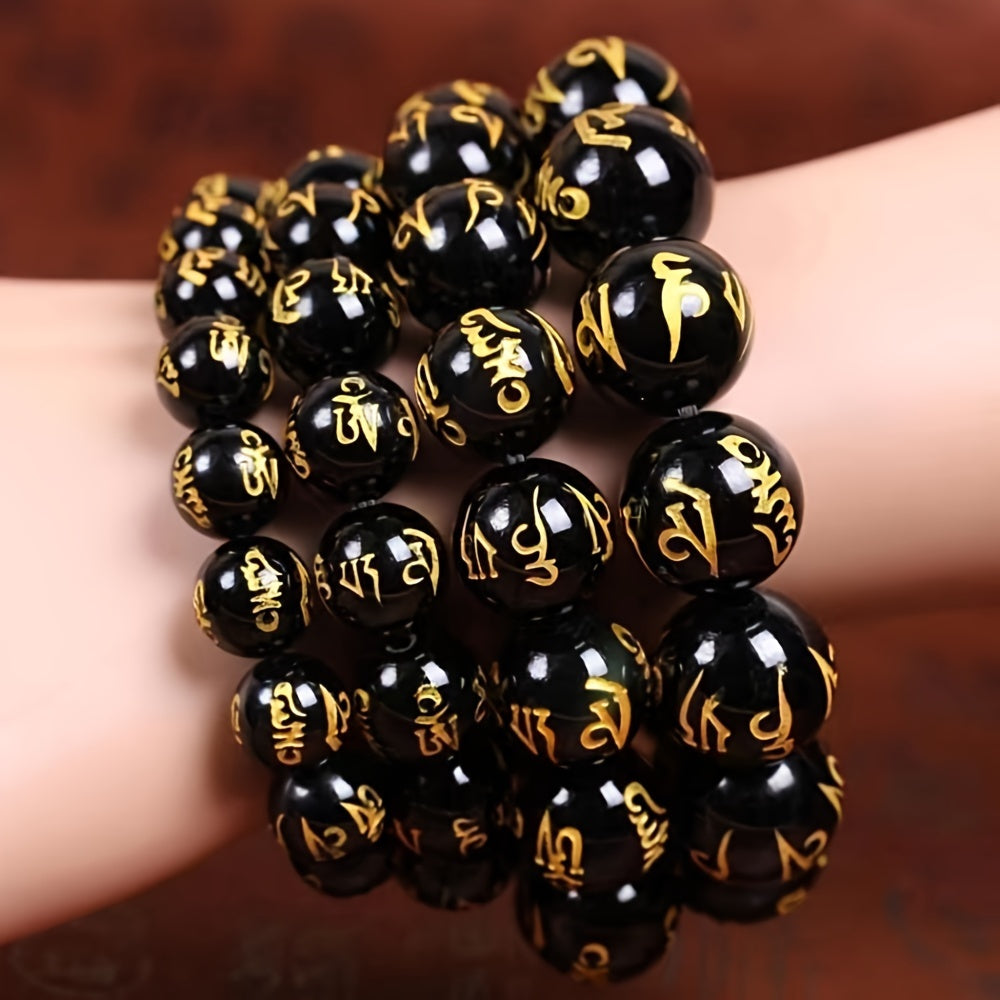 3pcs Men's Good Luck Obsidian Bracelets with Golden Inscriptions - Natural Stone, August Birthstone, Wealth Attraction, Ideal Gift Set