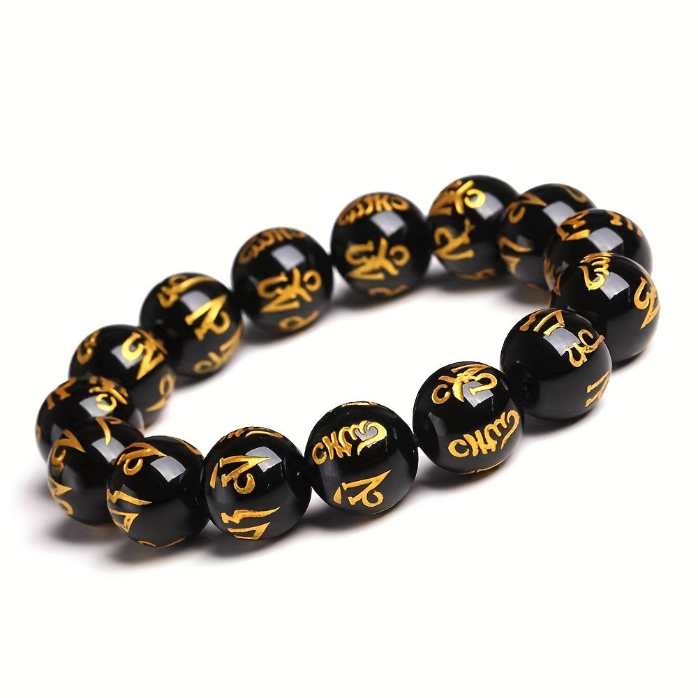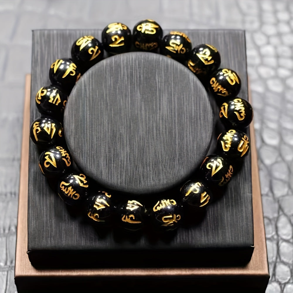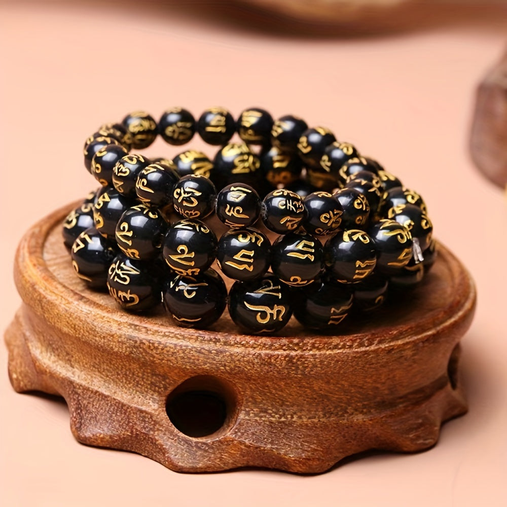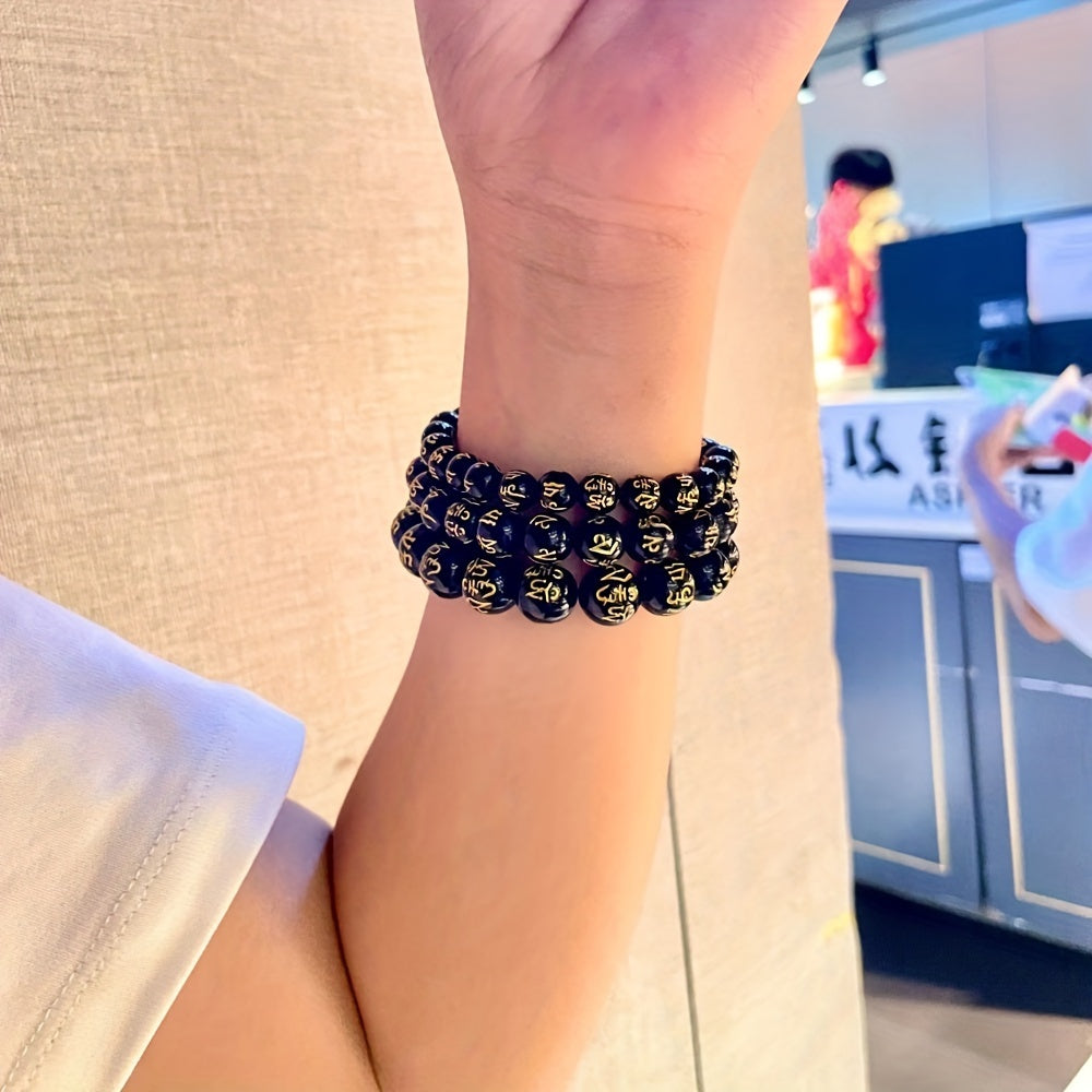 3pcs Men's Good Luck Obsidian Bracelets with Golden Inscriptions - Natural Stone, August Birthstone, Wealth Attraction, Ideal Gift Set
