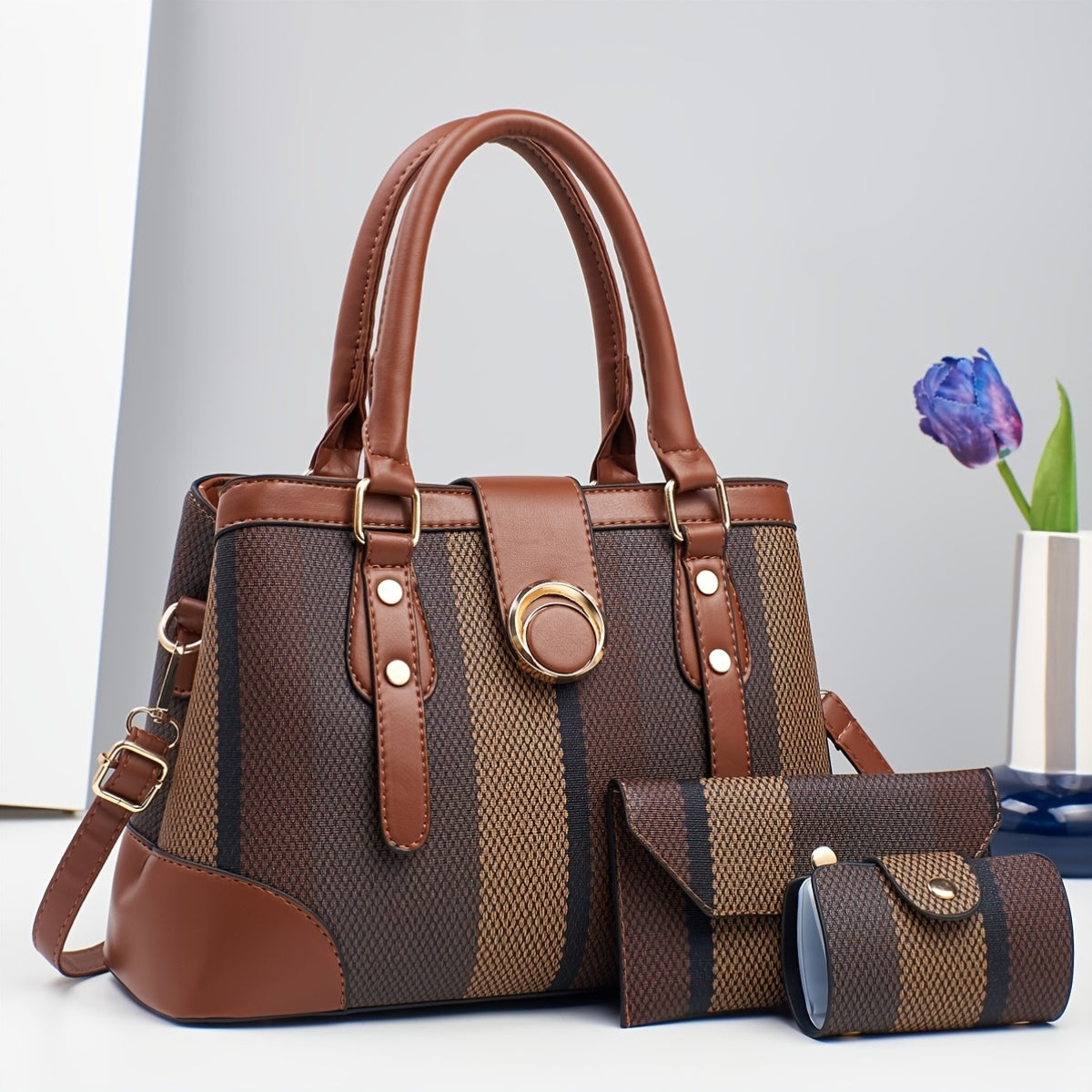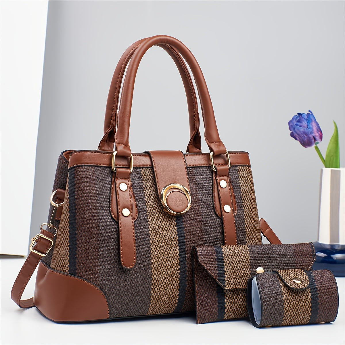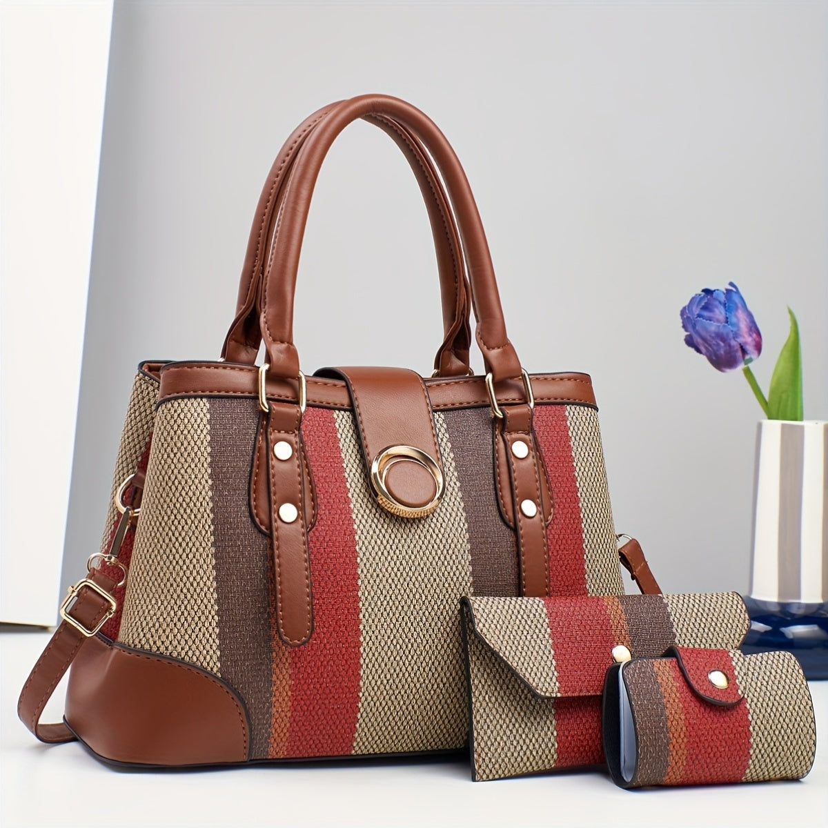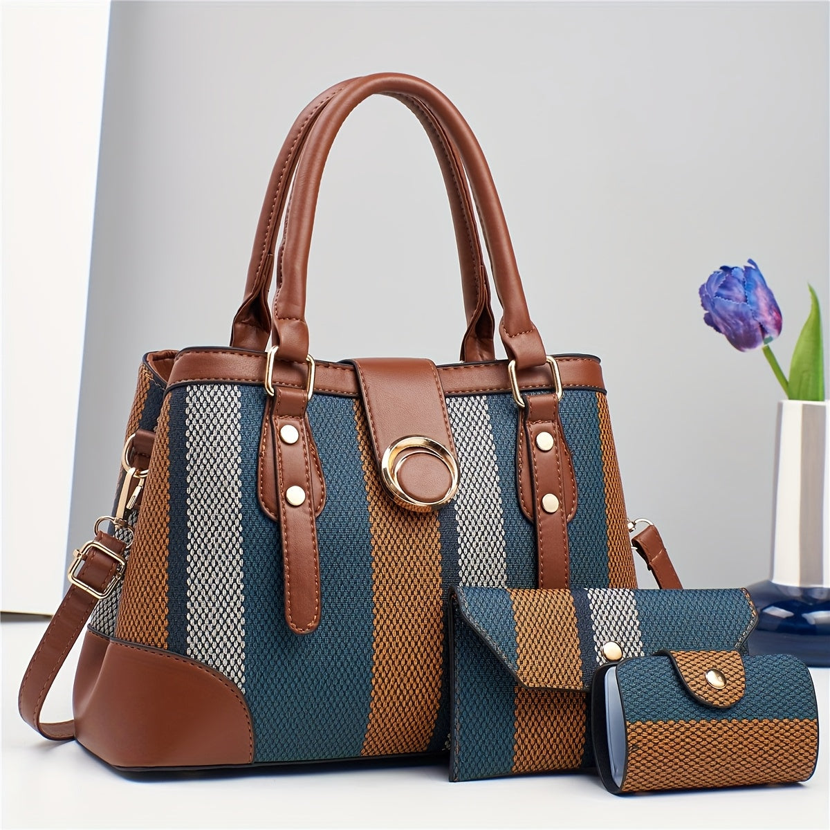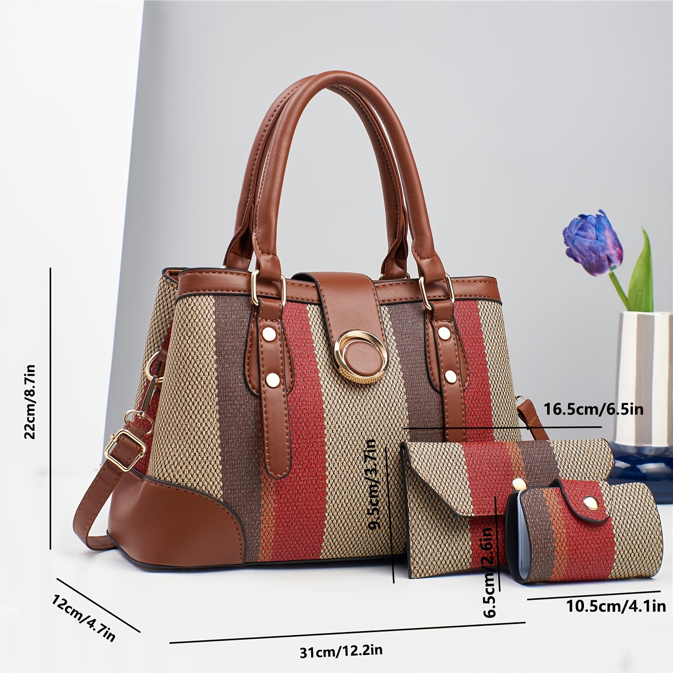 3pcs Women'S Handbag Set, Striped Shoulder Bag with Magnetic Closure, Polyester Lined, Urban Style, Multiple Colors, Large Capacity Tote with Crossbody Bag