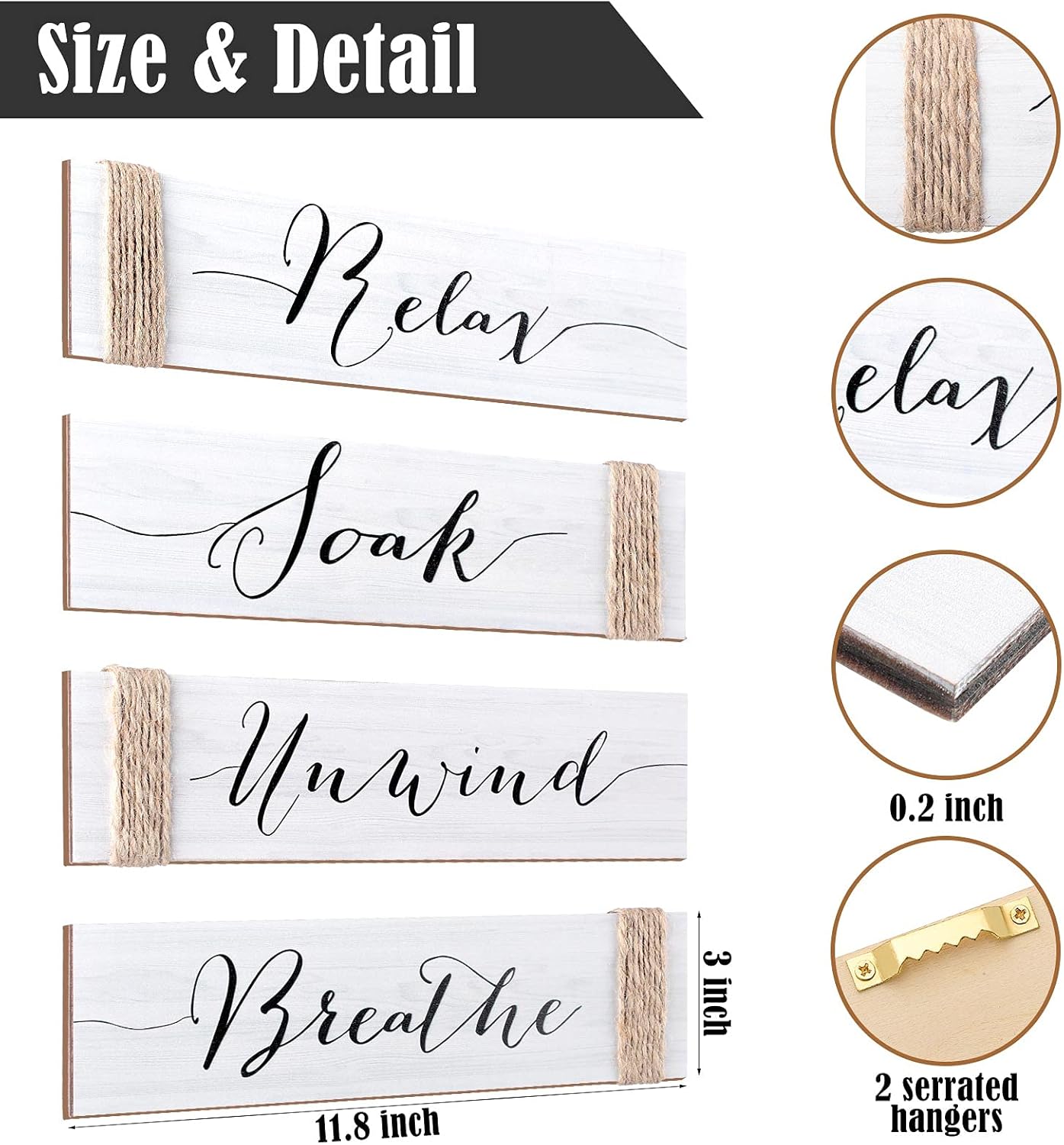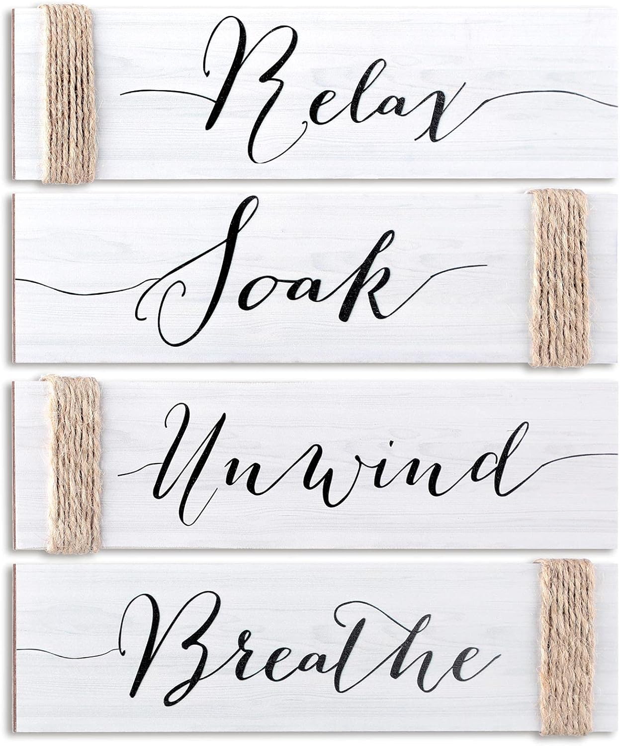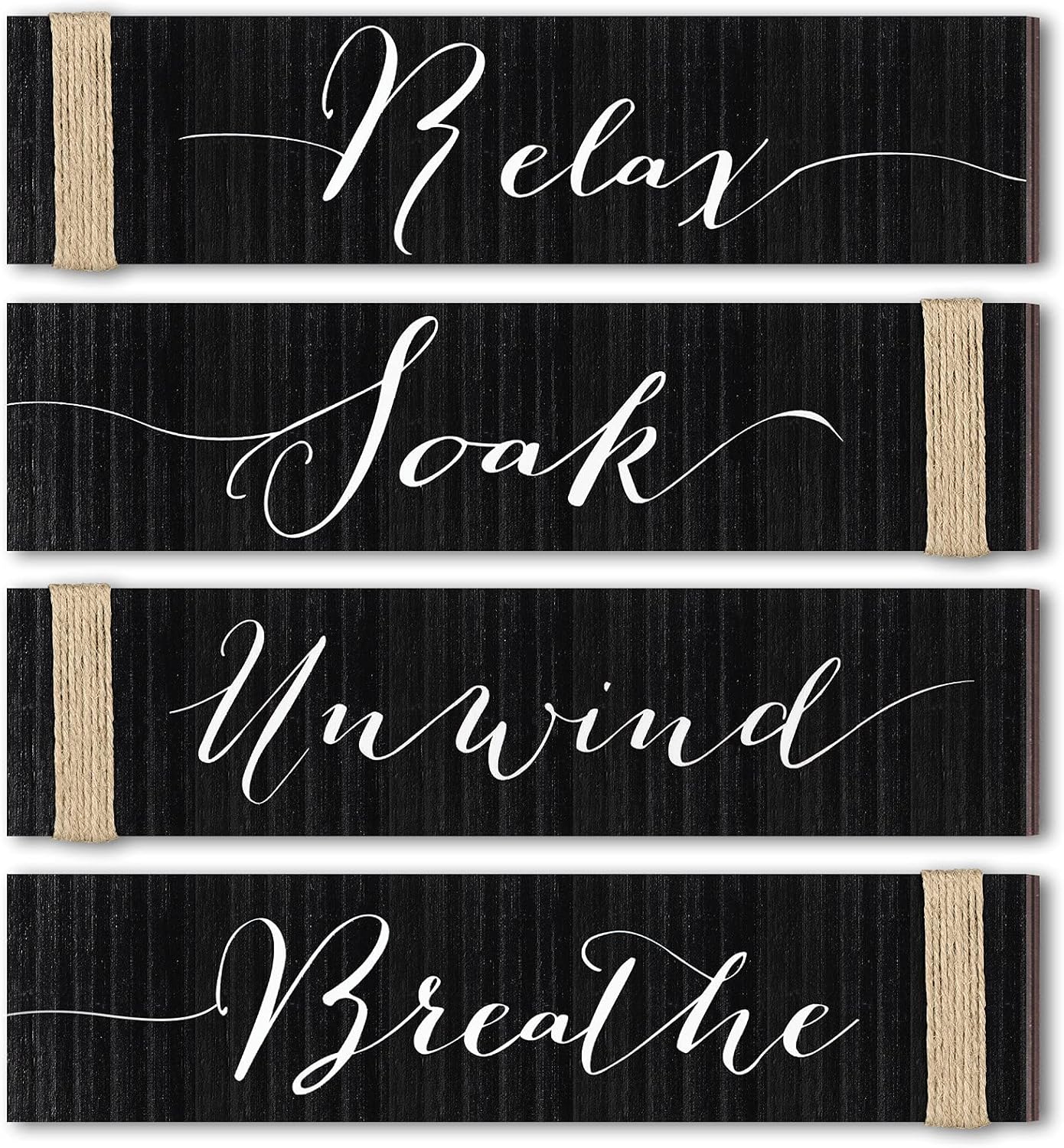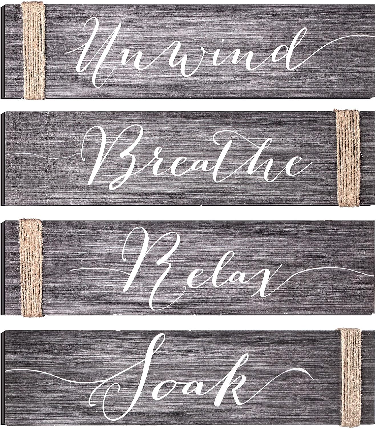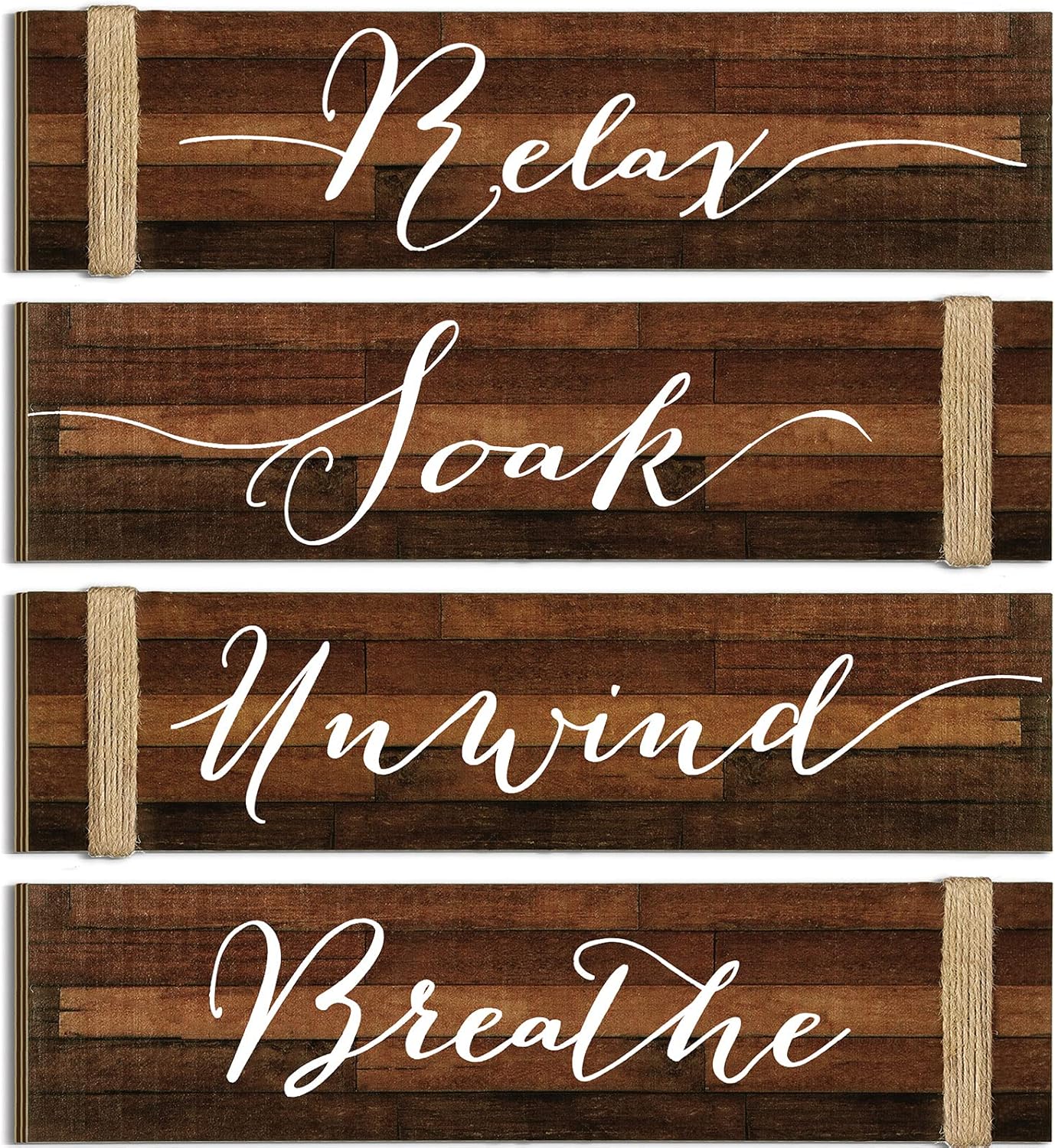 Vintage home style: these rustic bathroom wooden signs feature simple and classic color, and printed with artistic letters [Relax], [Soak], [Unwind] and [Breathe], also twist jute ropes on one edge of each sign, clear to see wood texture, which will look charming