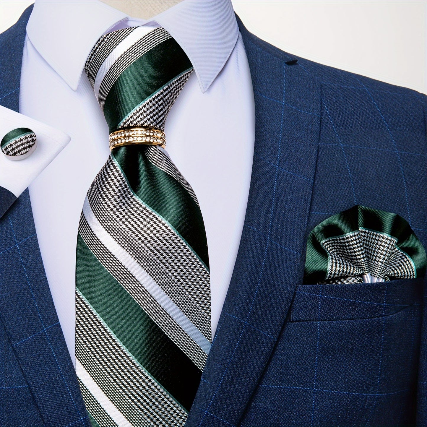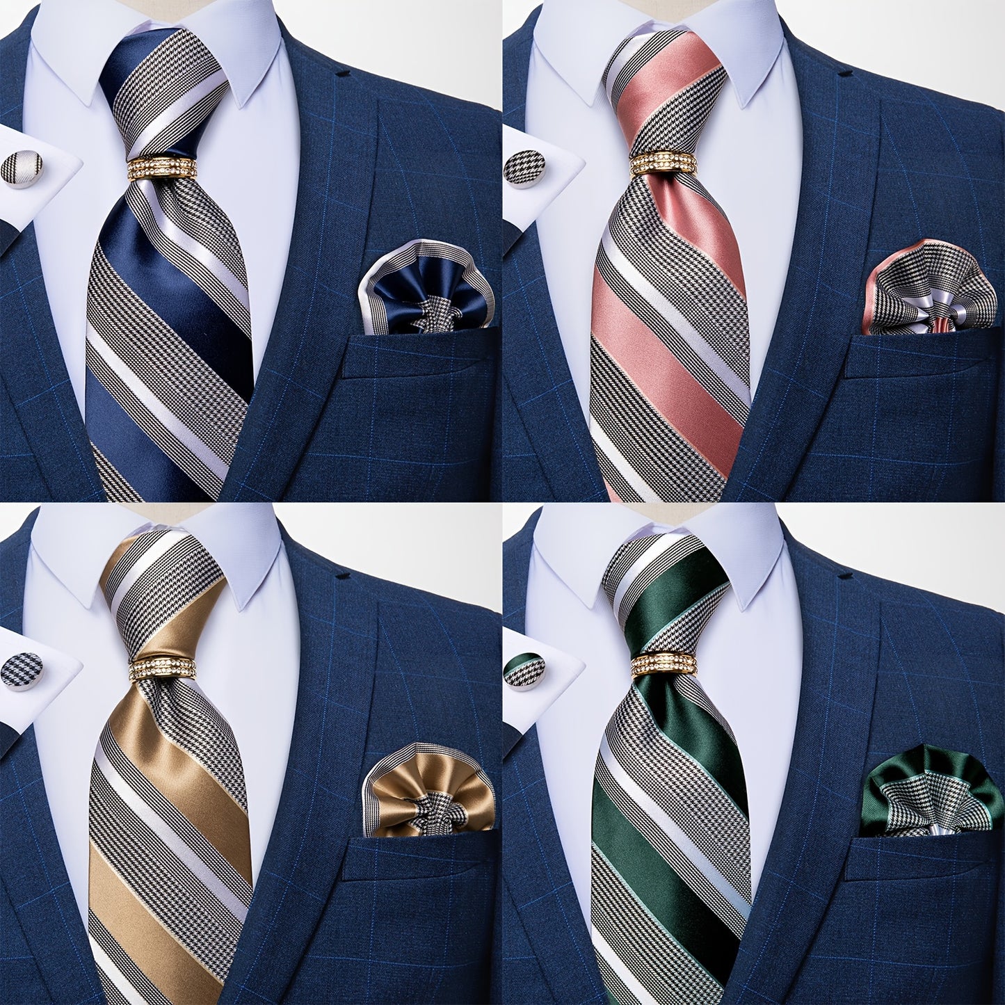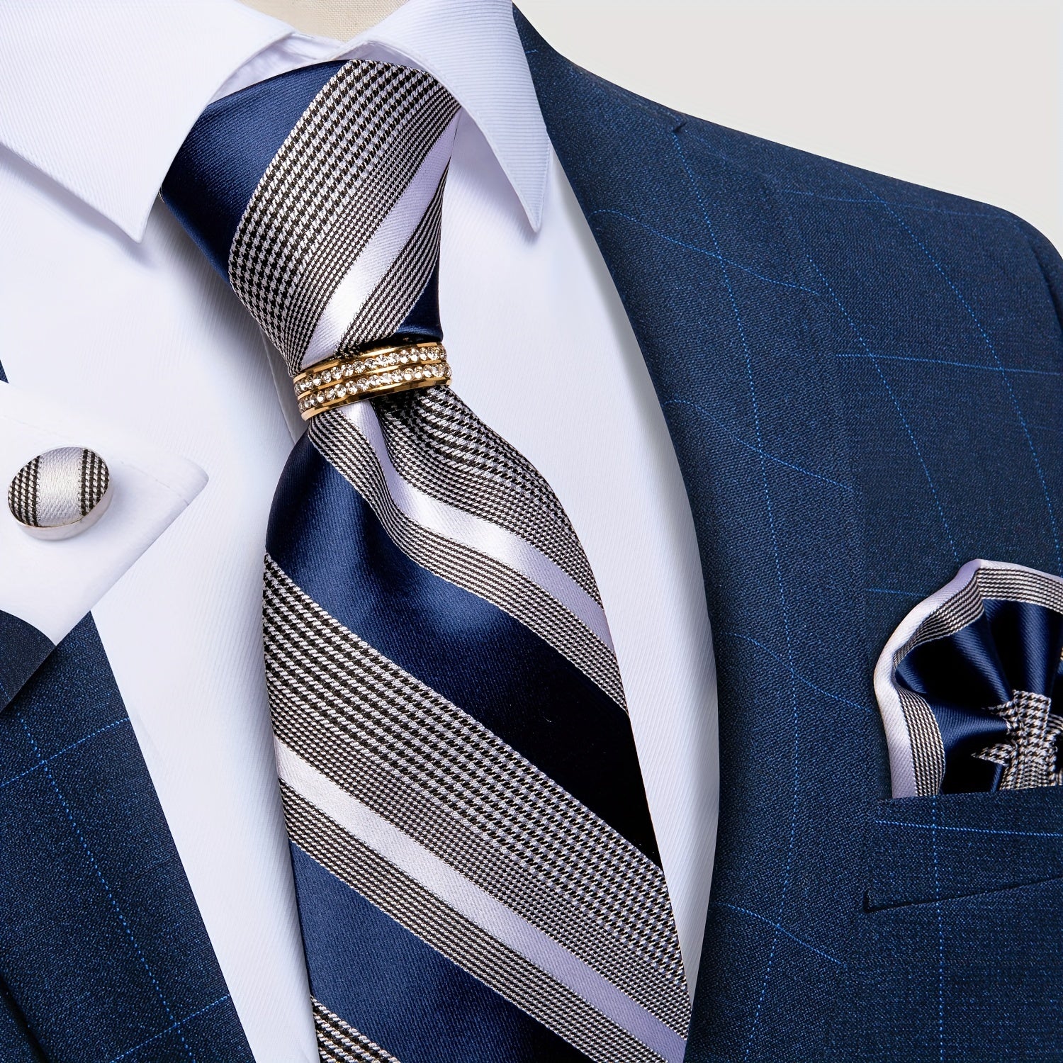 4pcs/Set Men's Tie Silk Blue Striped Wedding Necktie And Pocket Square Cufflinks Ring Set