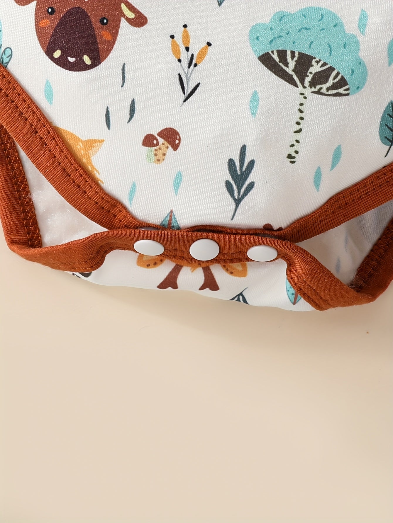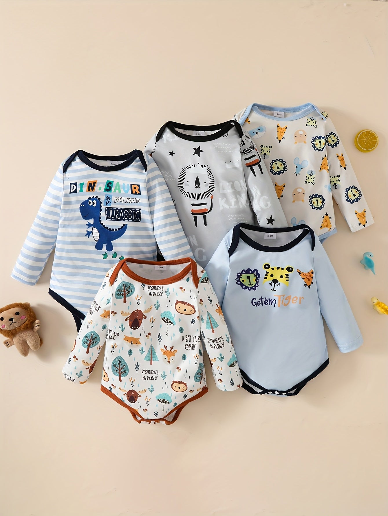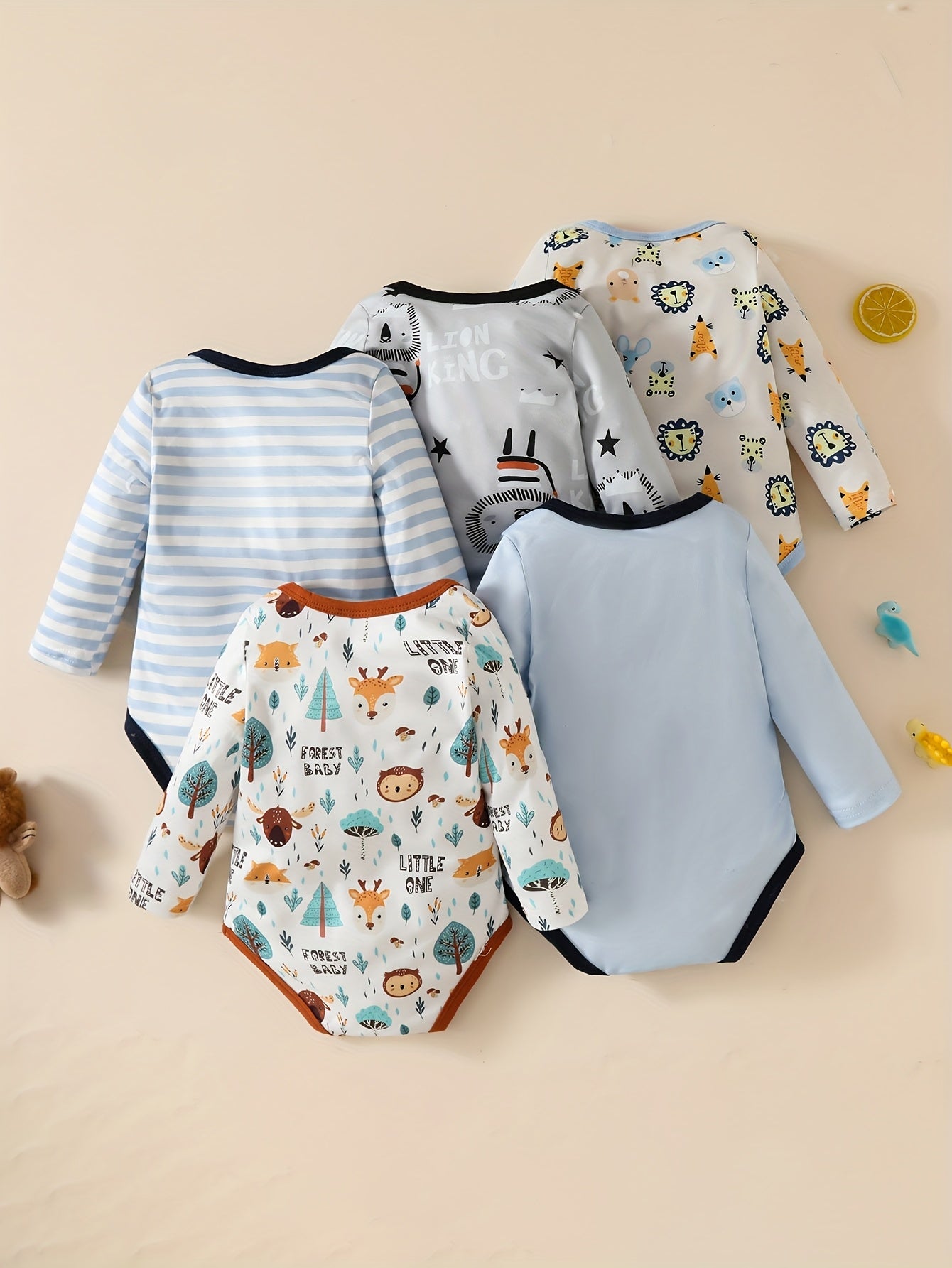[5pcs Baby Boy Onesies] 5pcs Soft Breathable Baby Boy Onesies | All-Season Outfits with Animal & Geometric Patterns, Machine Washable Snap Closure Rompers for Newborns | Easy Diaper Change, Playful Infant Clothes, Comfortable Fit