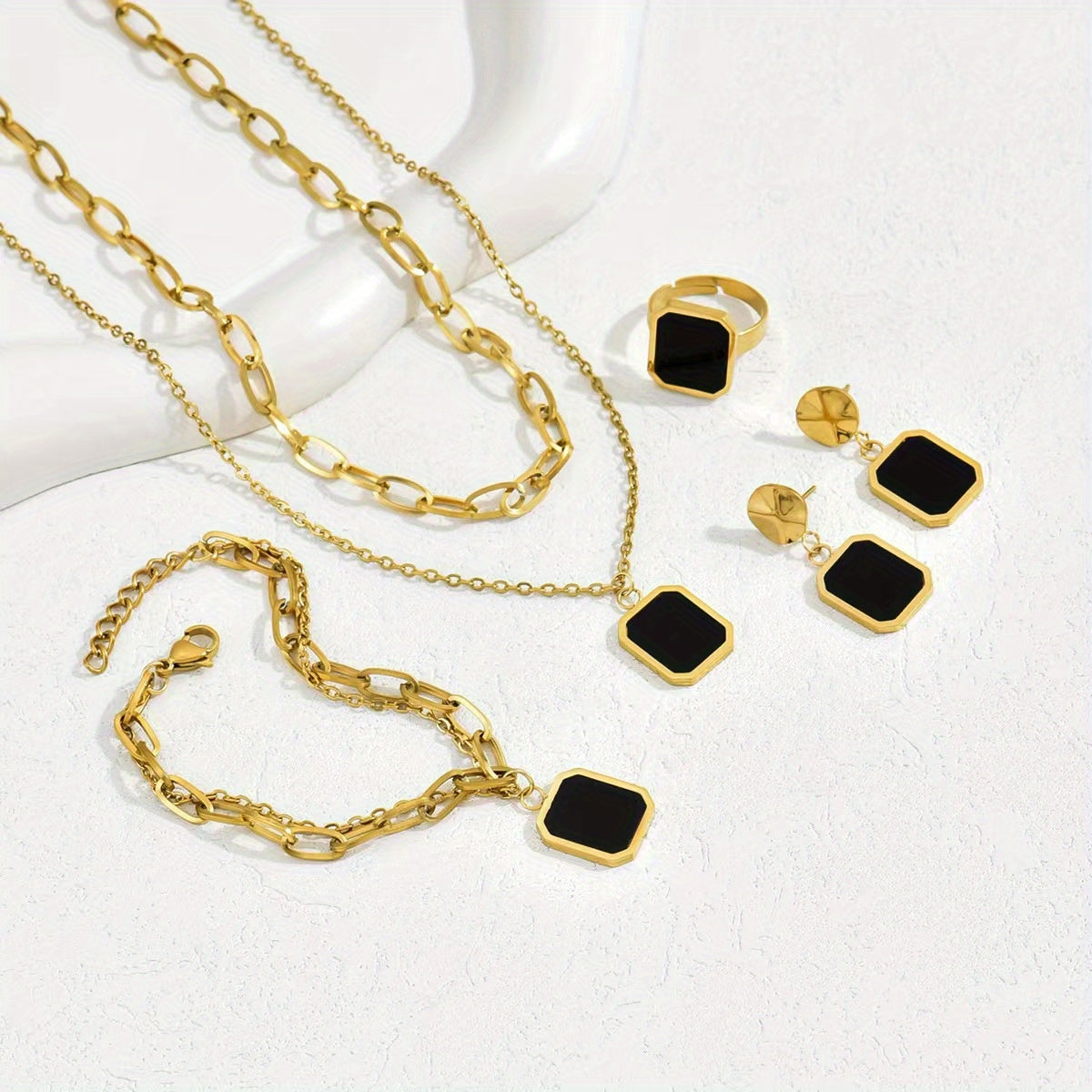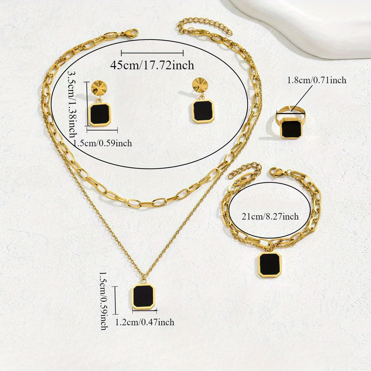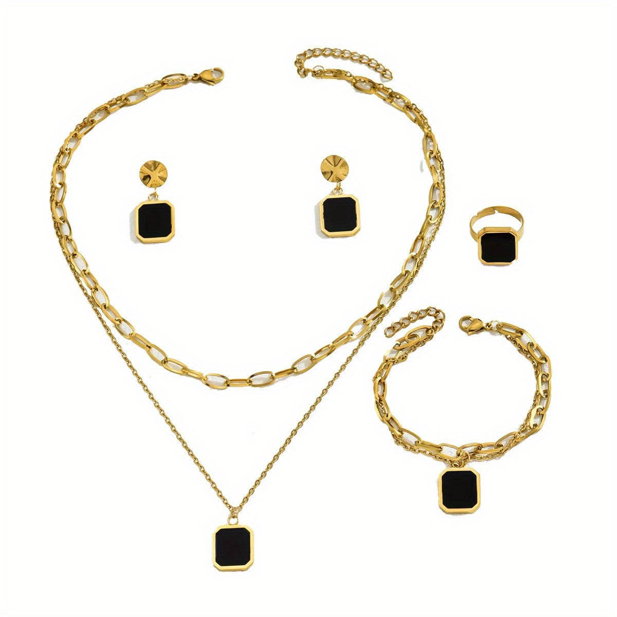 5pcs Set of Golden Jewelry 18K Gold-Plated Black Shell Square Necklace Earrings Jewelry Ring Set INS Personality Retro Korean Fashion Trend Joker Gift Daily Street Commuting Party to Celebrate The Holiday Party to Wear.
