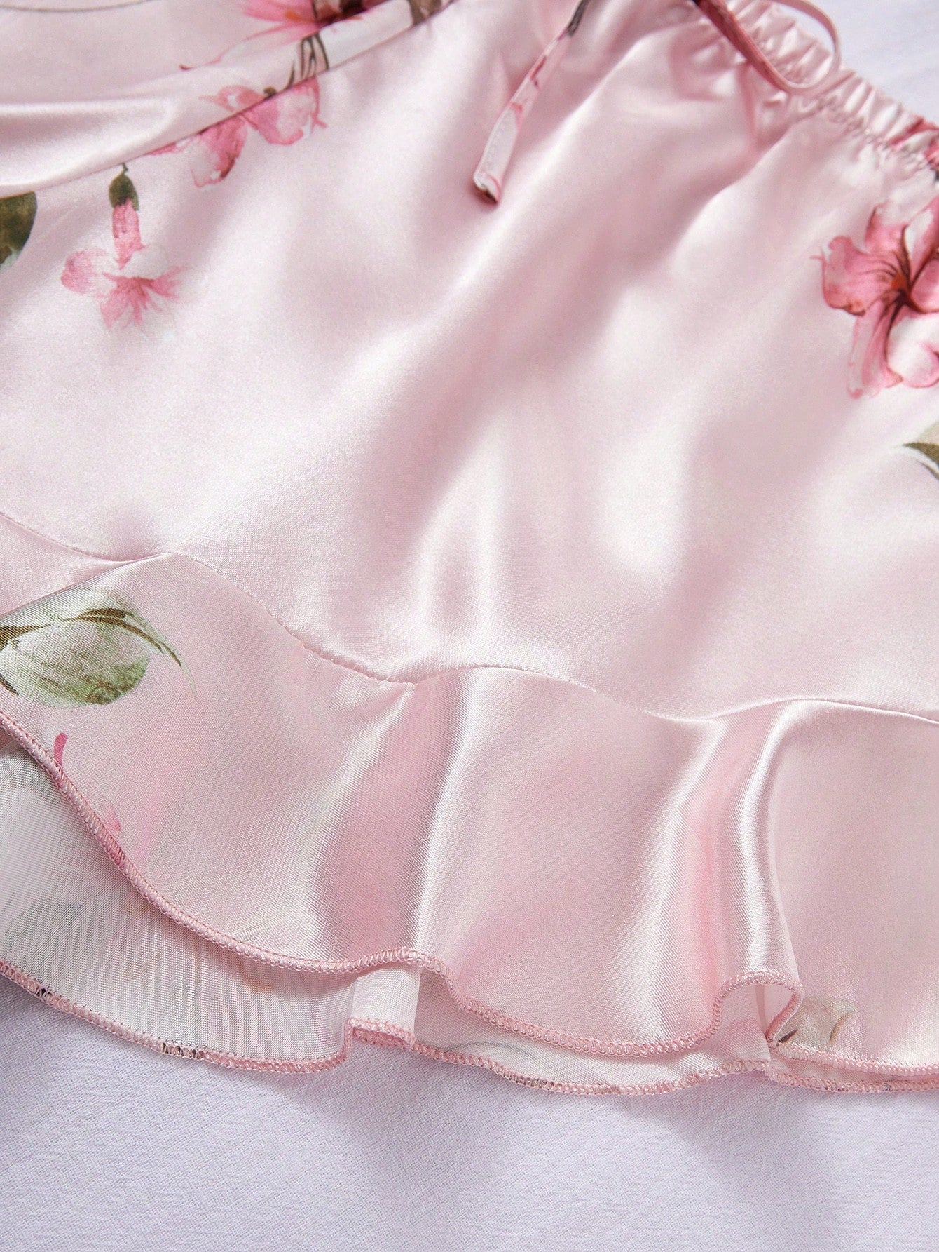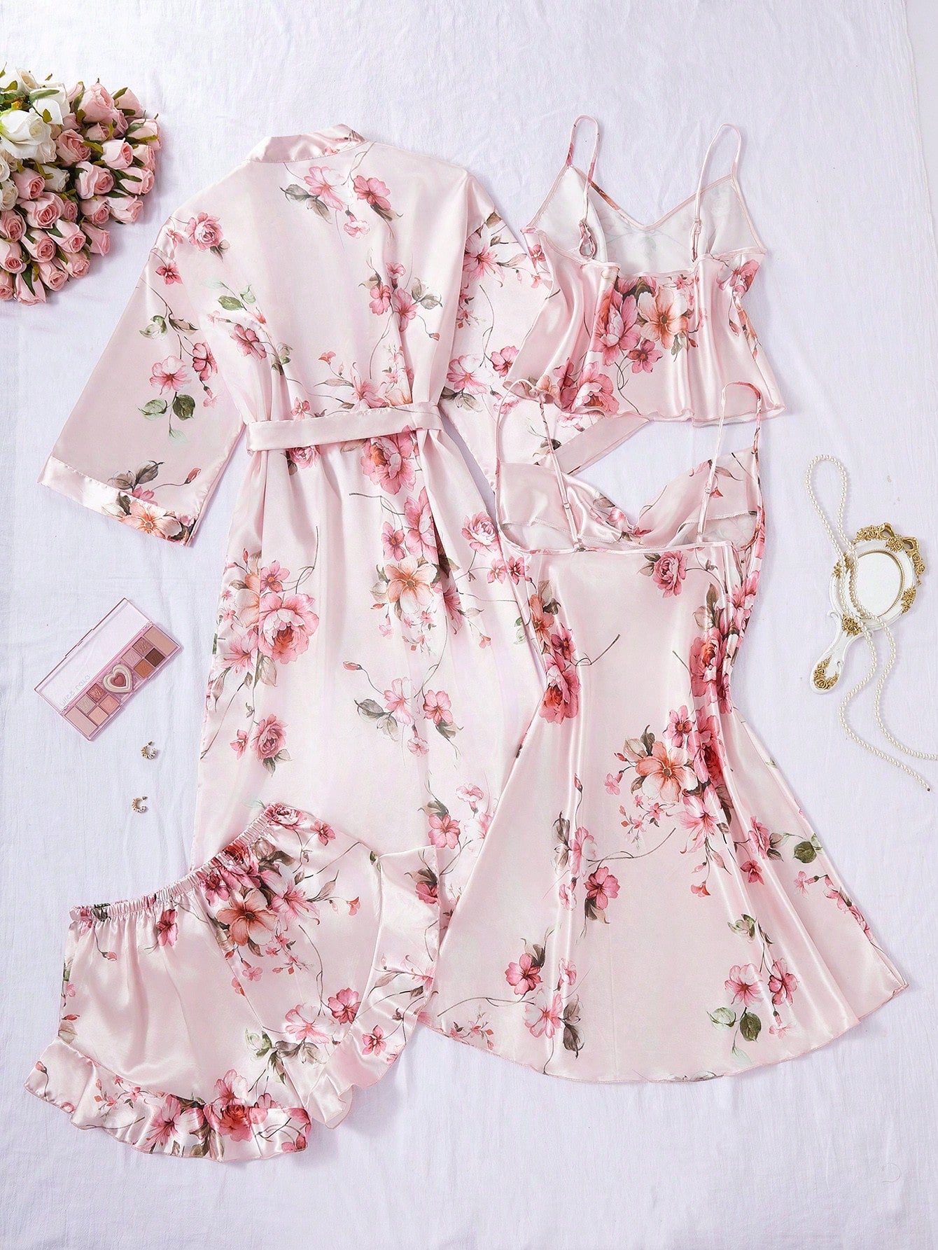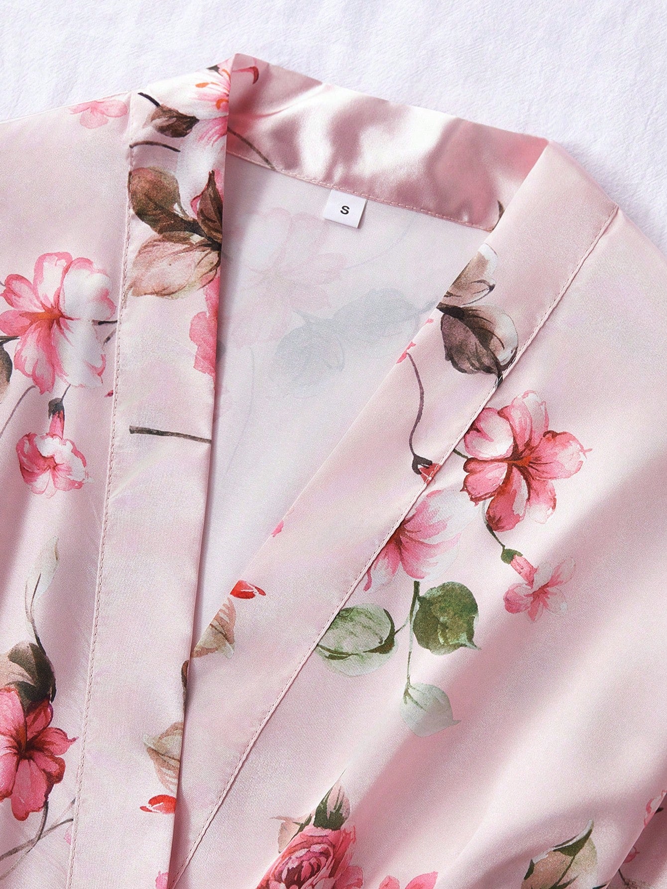 5pcs Women's Floral Print Faux Silk Pajama Set, Elegant Clothes