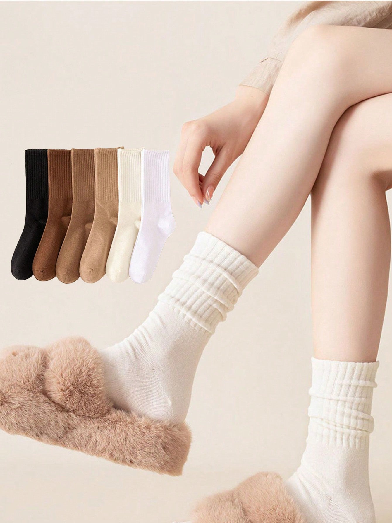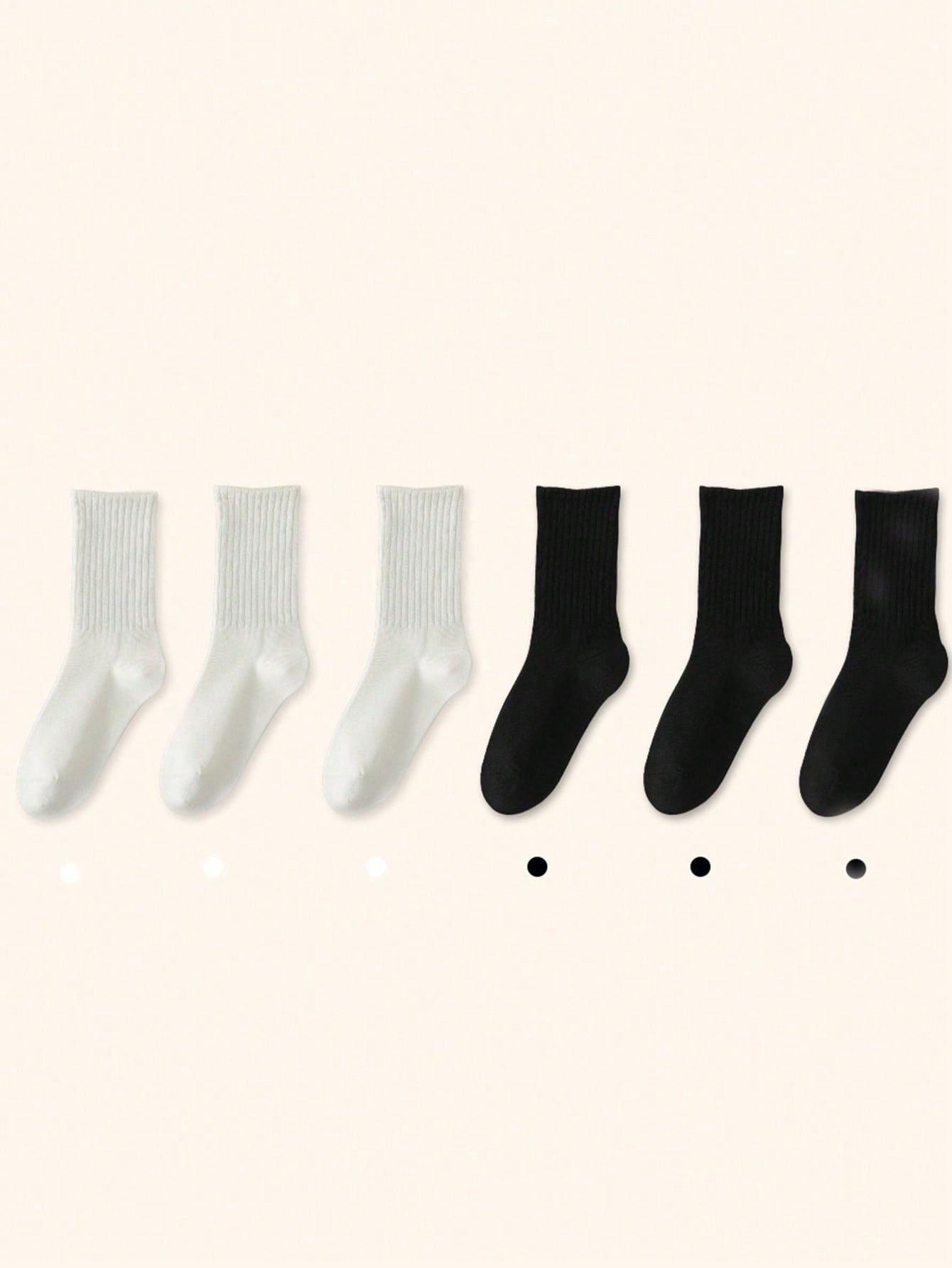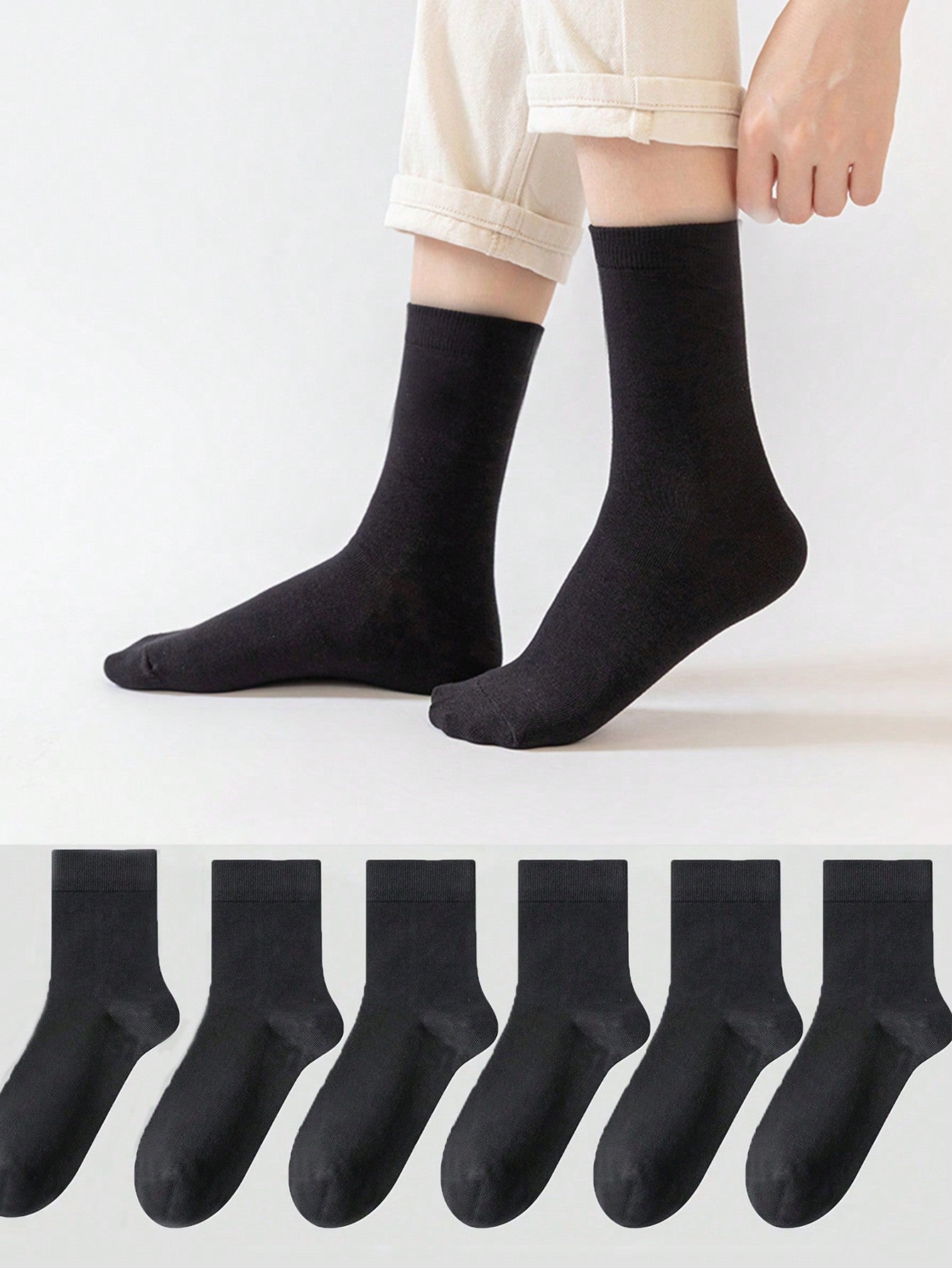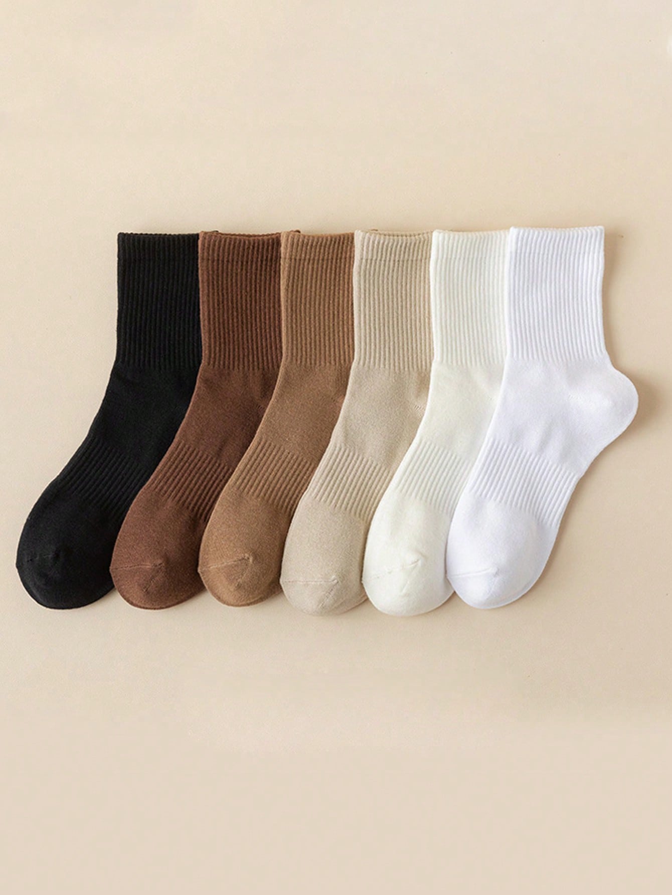 6 Pairs Solid Color Casual Sport Crew Socks, For Women, Autumn/Winter