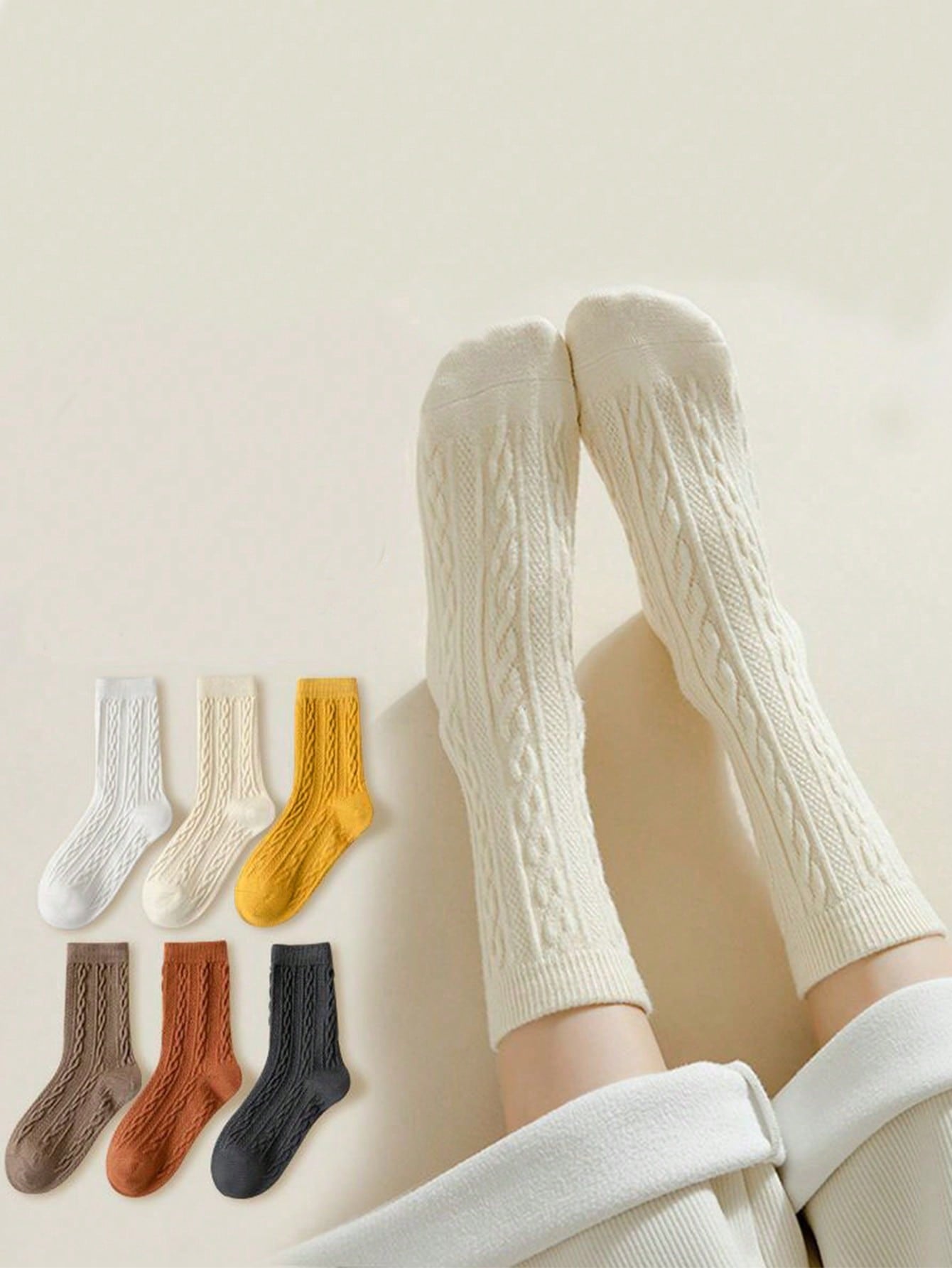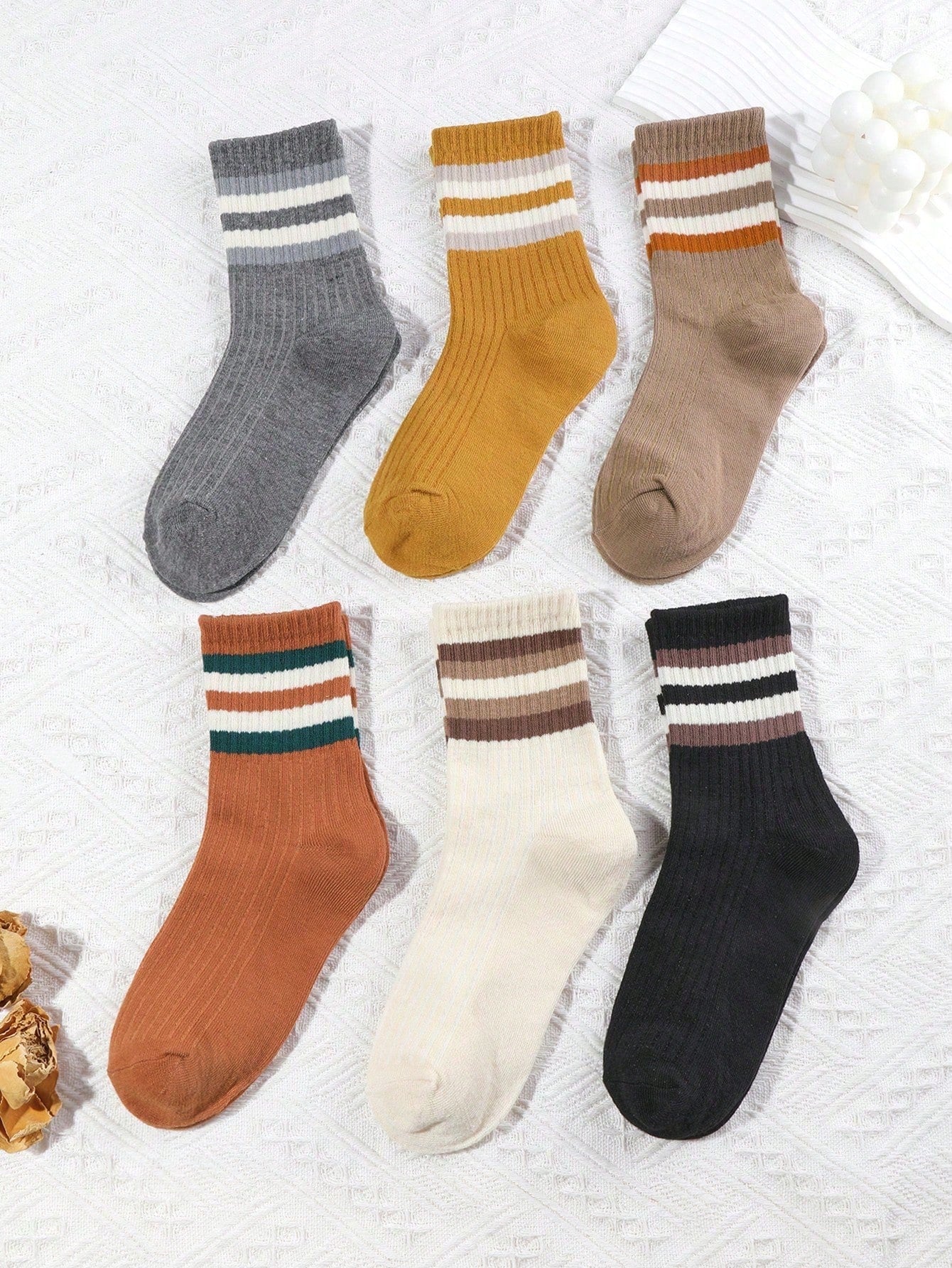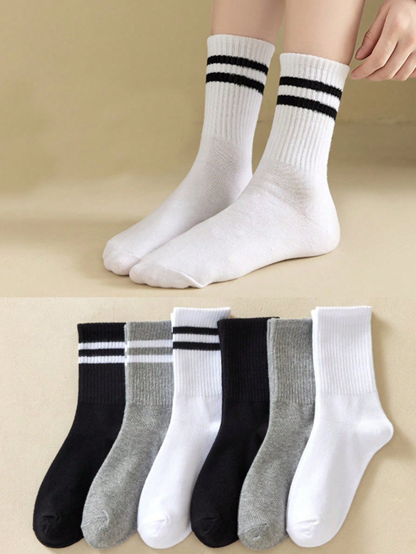 6 Pairs Solid Color Casual Sport Crew Socks, For Women, Autumn/Winter