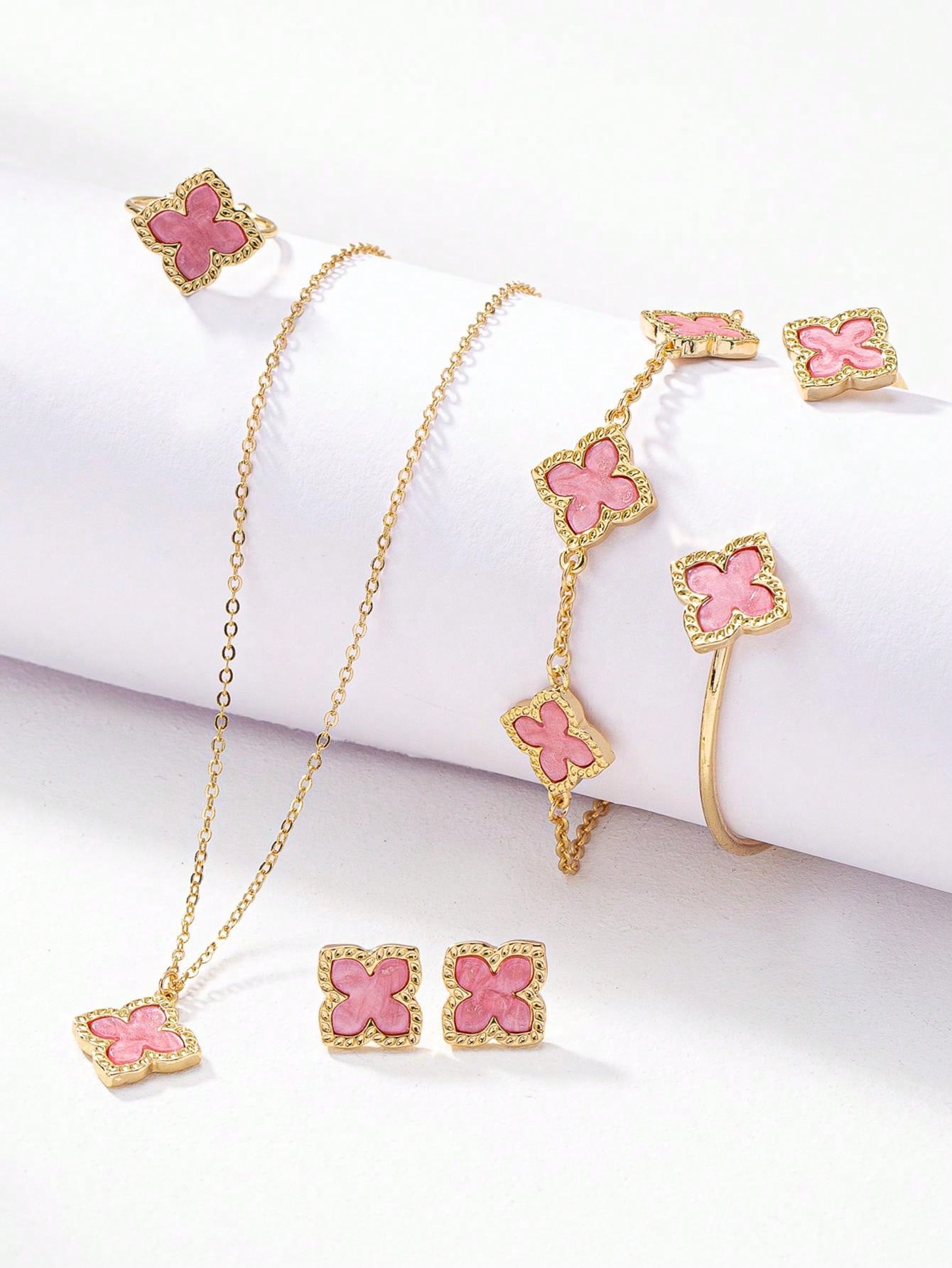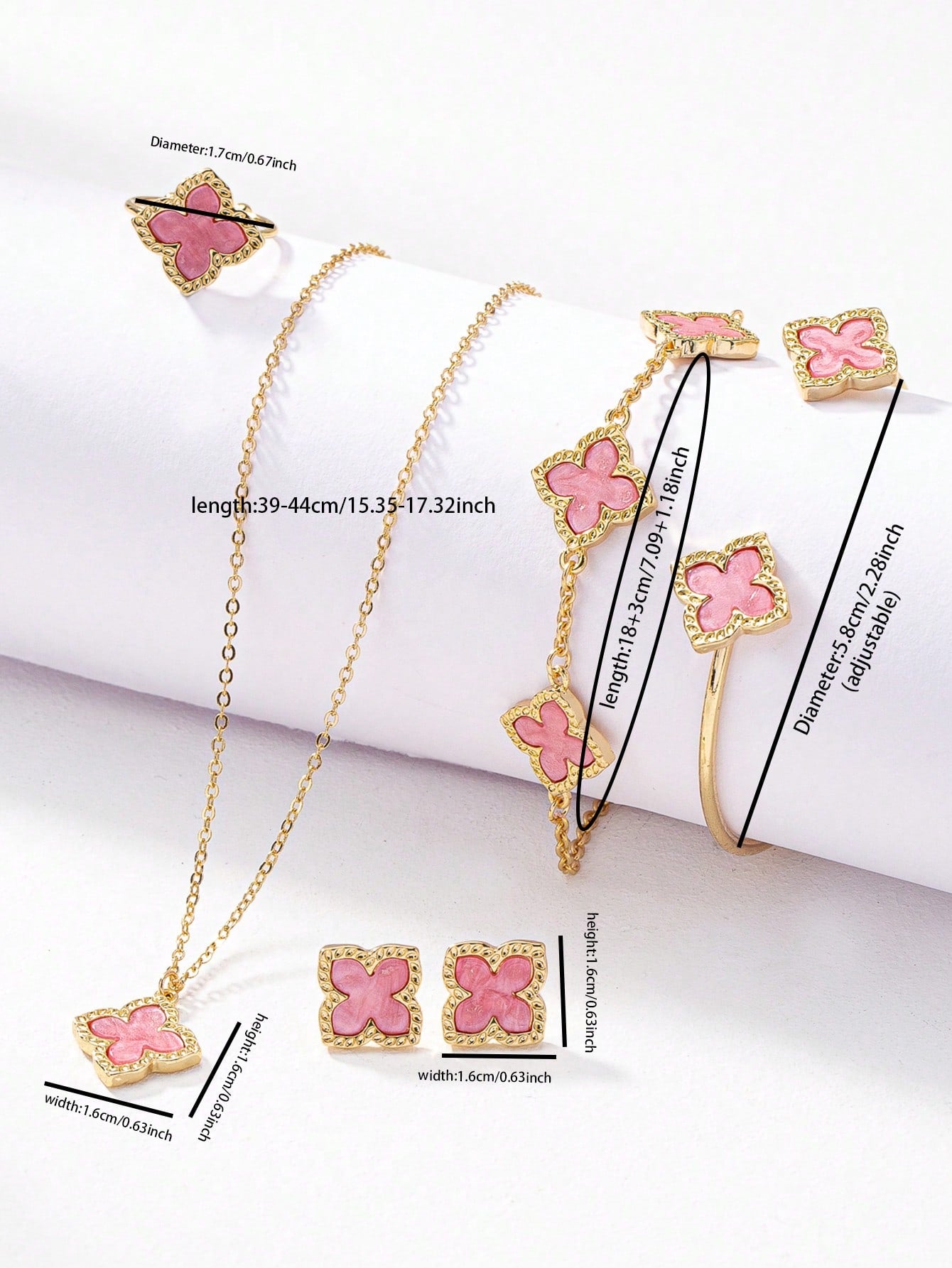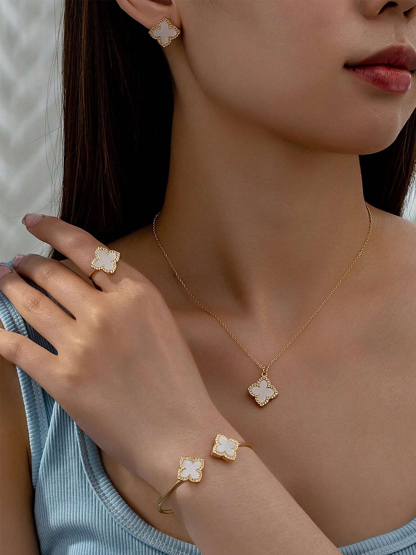 6 Pcs Four Leaf Clover Earring Necklace Bracelet Bangle Ring Jewelry Set For Women Valentines,Mom,Mother,Mother's Day,Gift