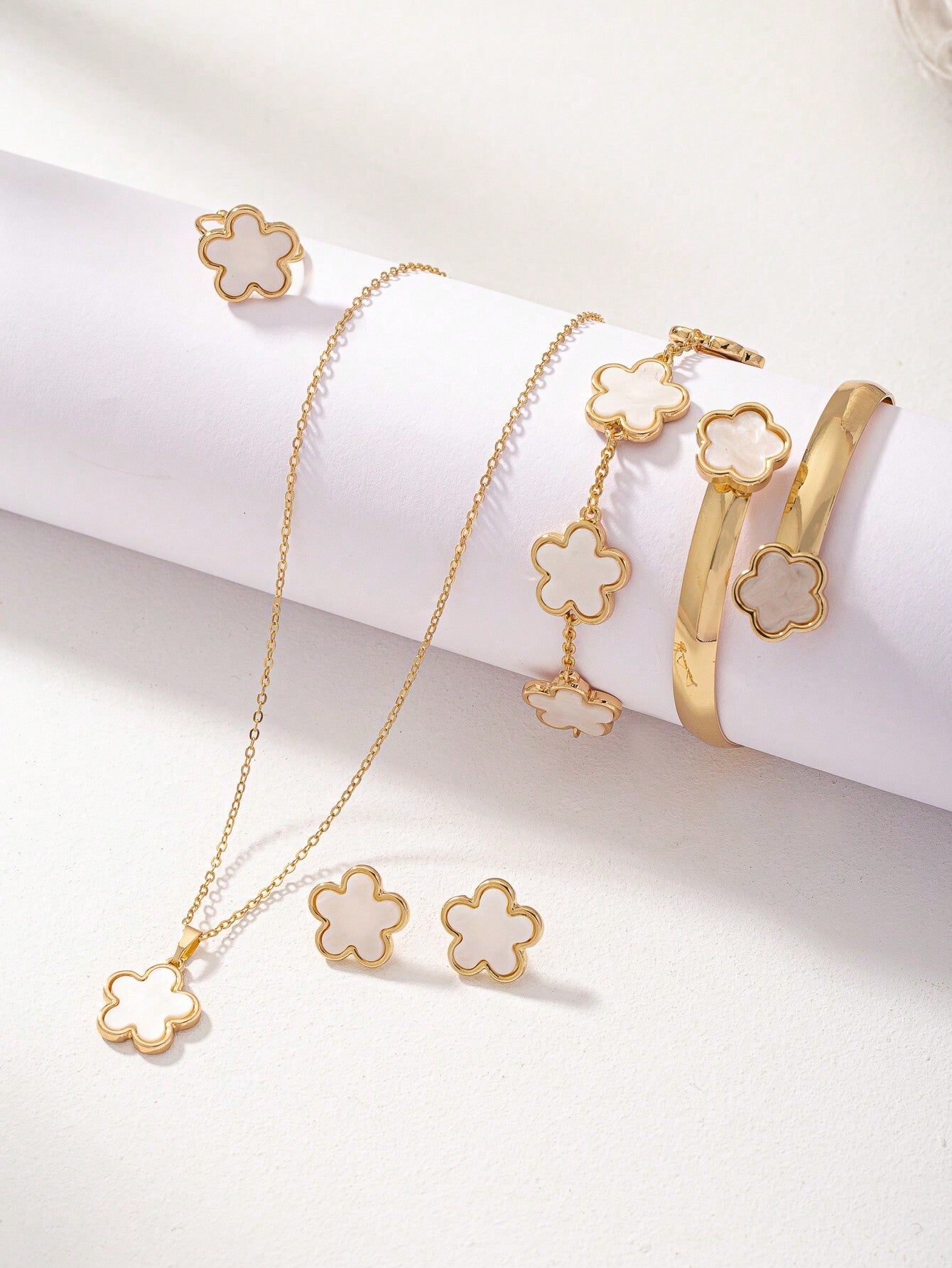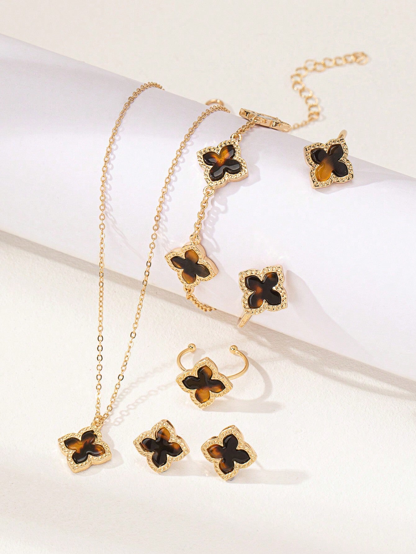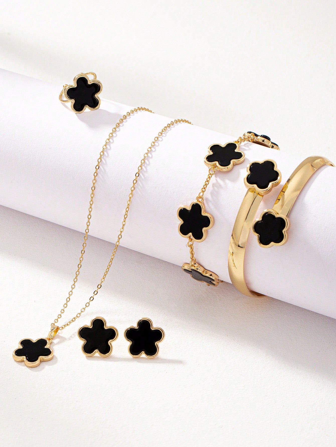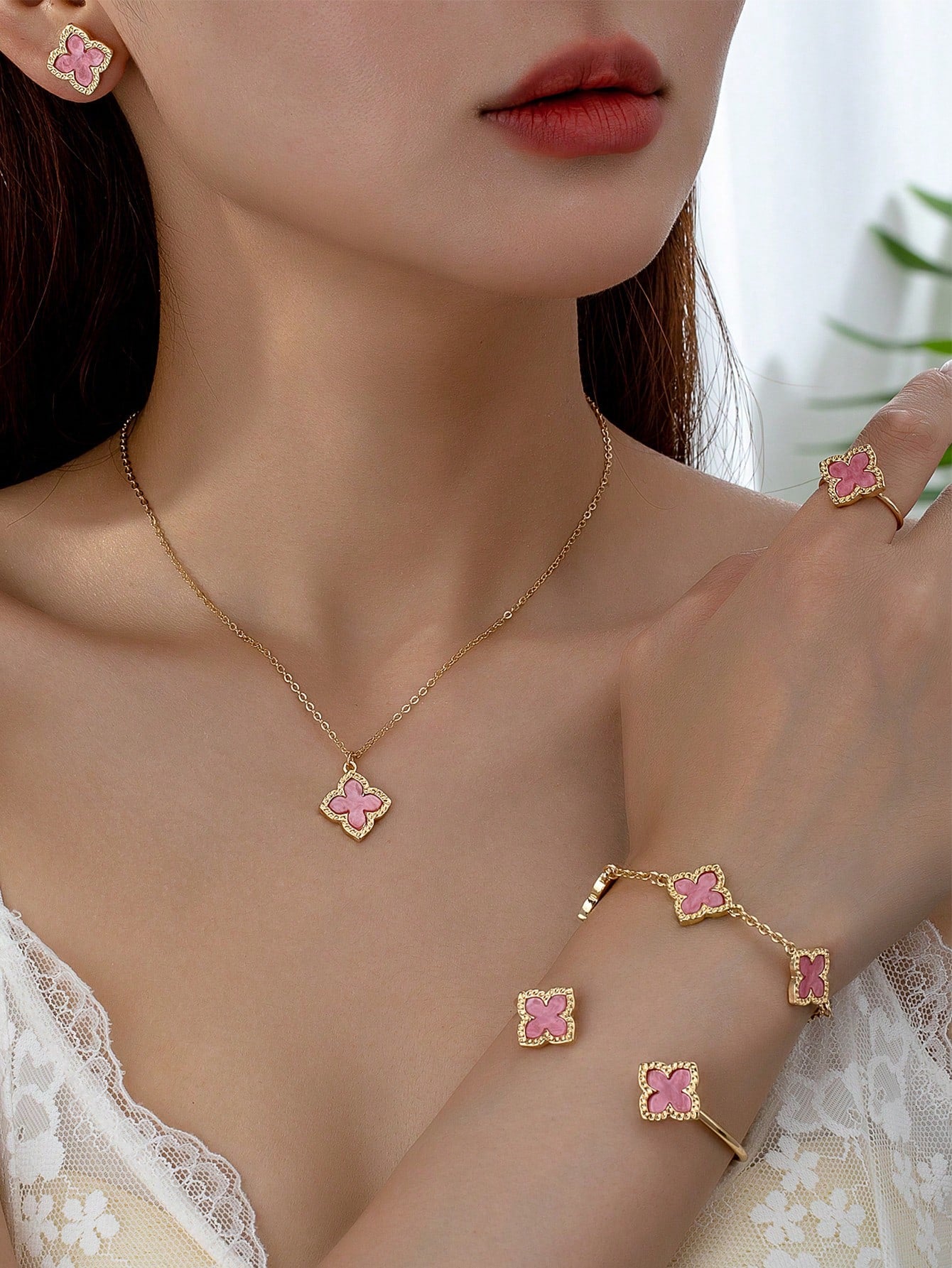 6 Pcs Four Leaf Clover Earring Necklace Bracelet Bangle Ring Jewelry Set For Women Valentines,Mom,Mother,Mother's Day,Gift