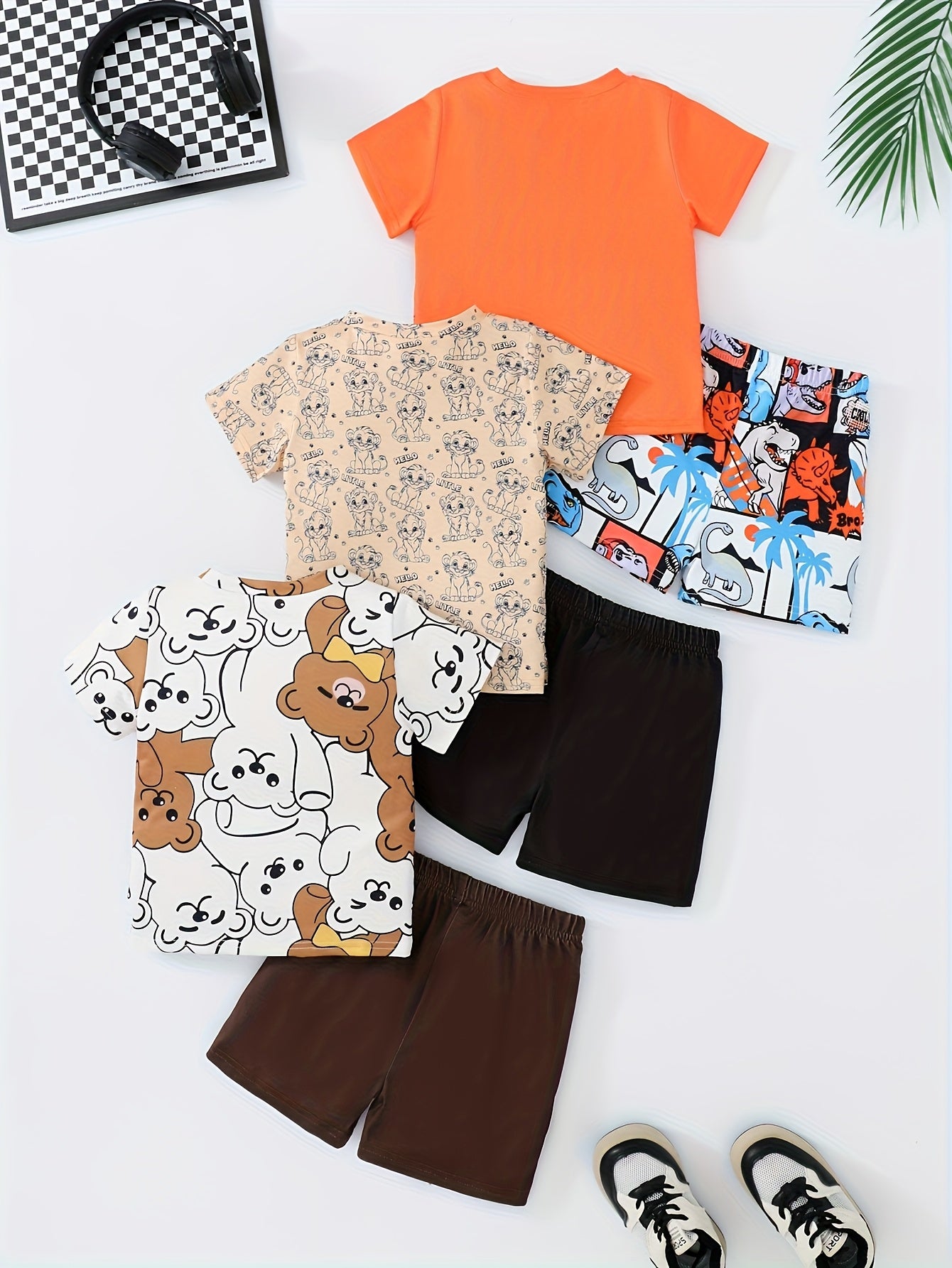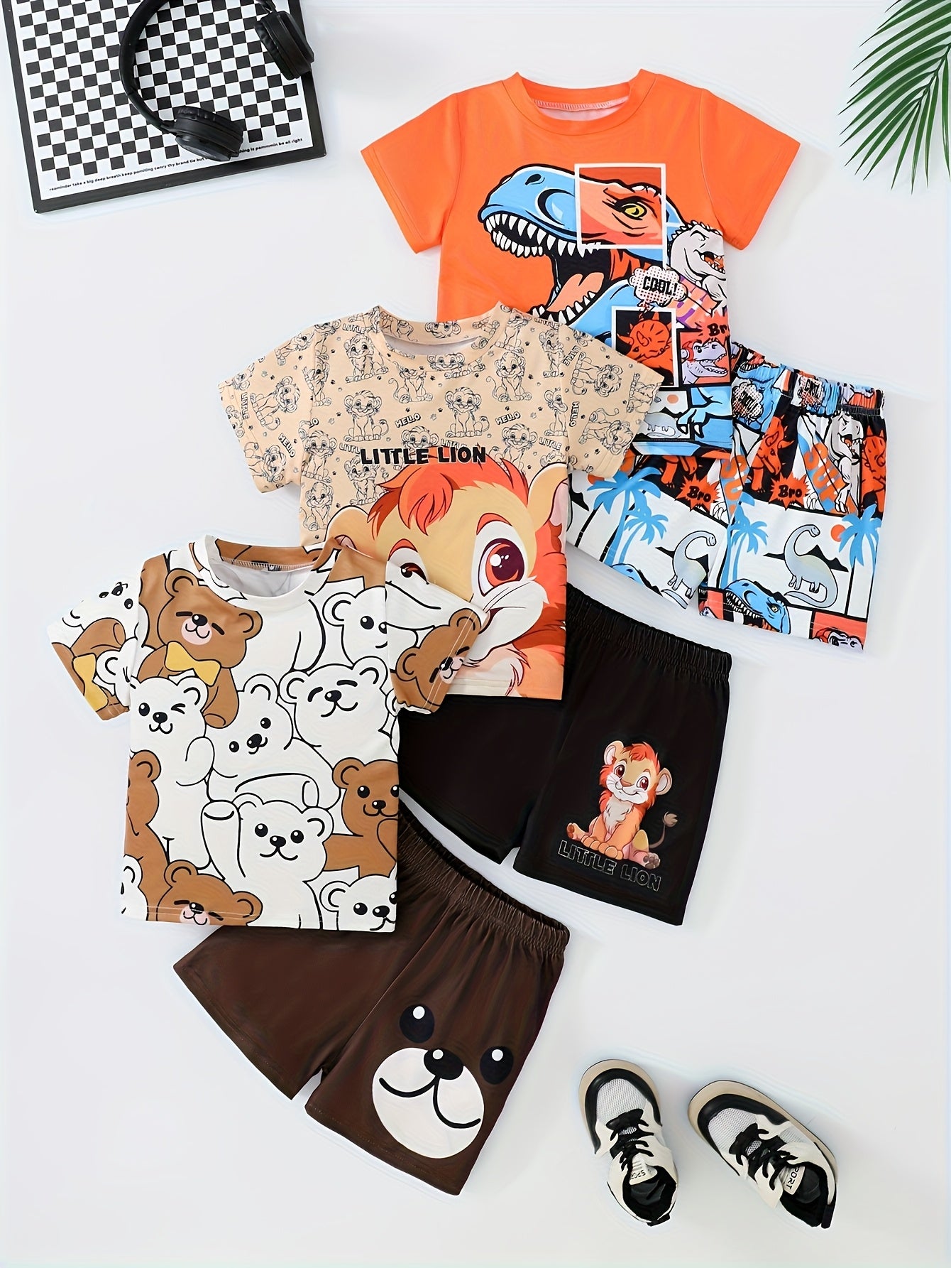 6pcs Cute Animal Print Shorts & T-Shirt Set for Newborn Boys - Lightweight Polyester, Summer Essentials with Bear, Lion, and Cartoon Designs, Black and White Sneakers Included, Newborn Clothing | Playful Animal Print | Stretchy Fabric, Baby Clothes, for O