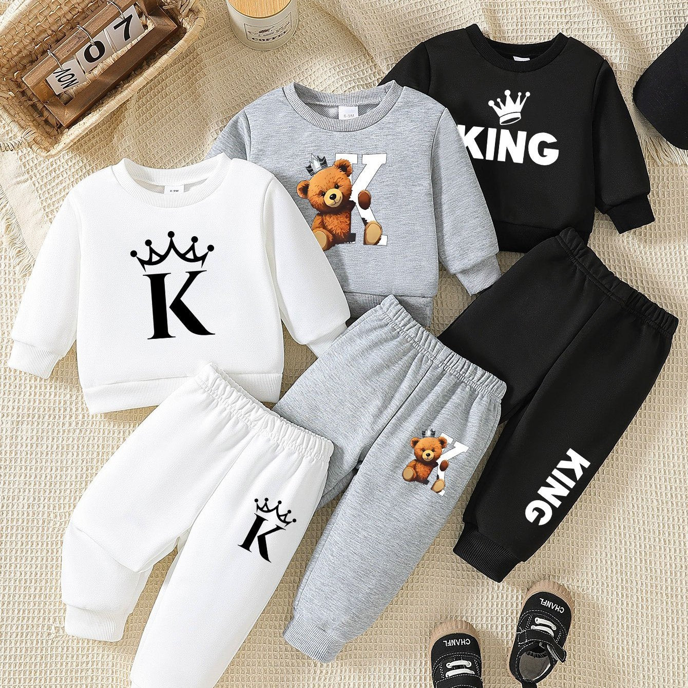 [6pcs Sportswear] 6pcs Baby Boy Sportswear Set, Casual Long Sleeve Crew Neck Pullovers | Polyester, Loose Fit, Slight Stretch, Alphabet Pattern, Cartoon Bear & Crown Applique | Spring/Fall Collection, for Outdoor