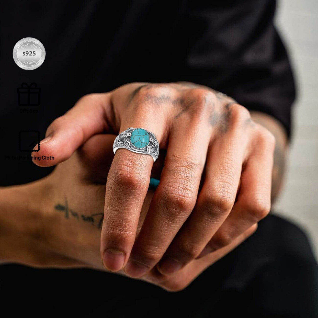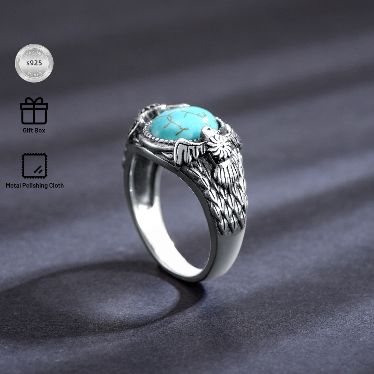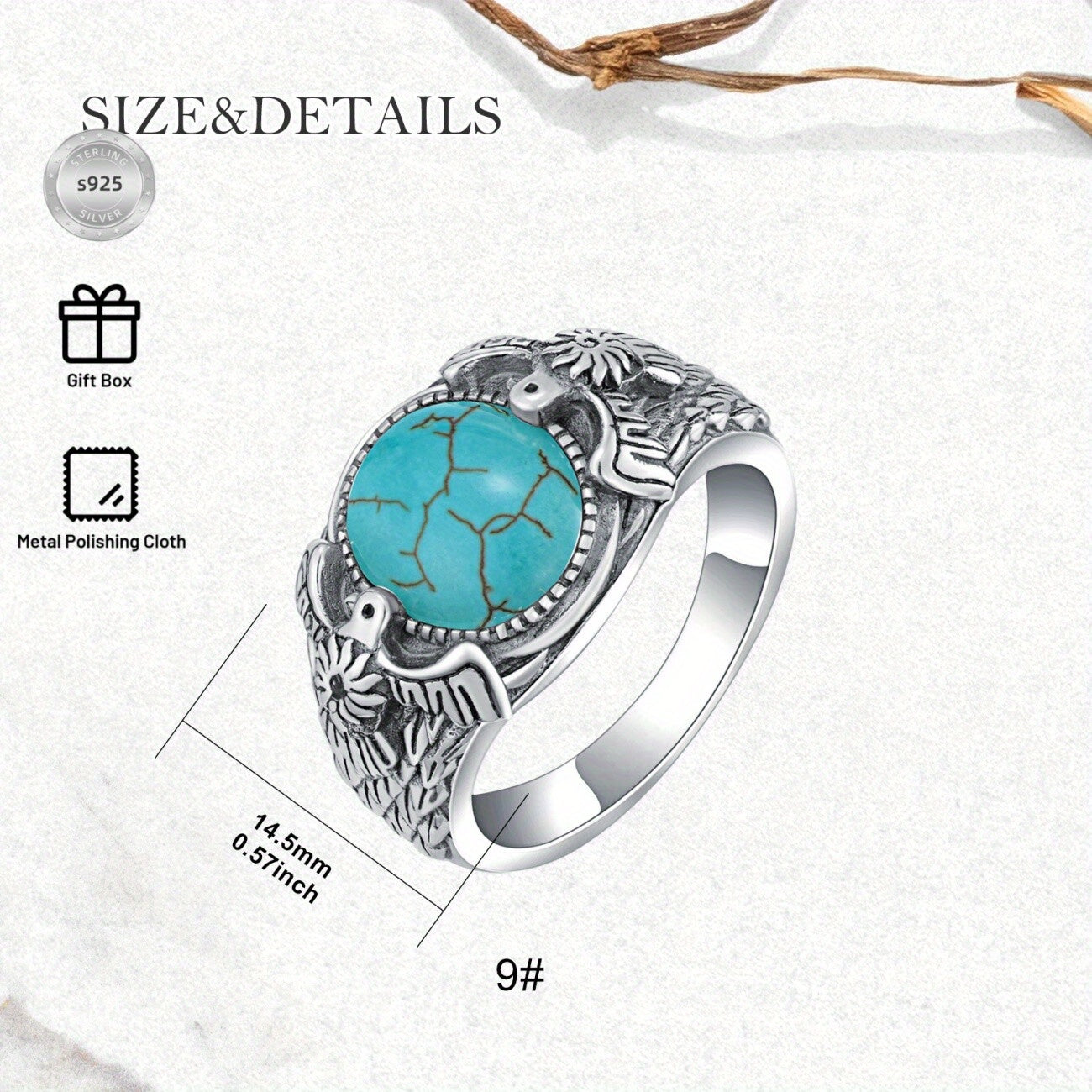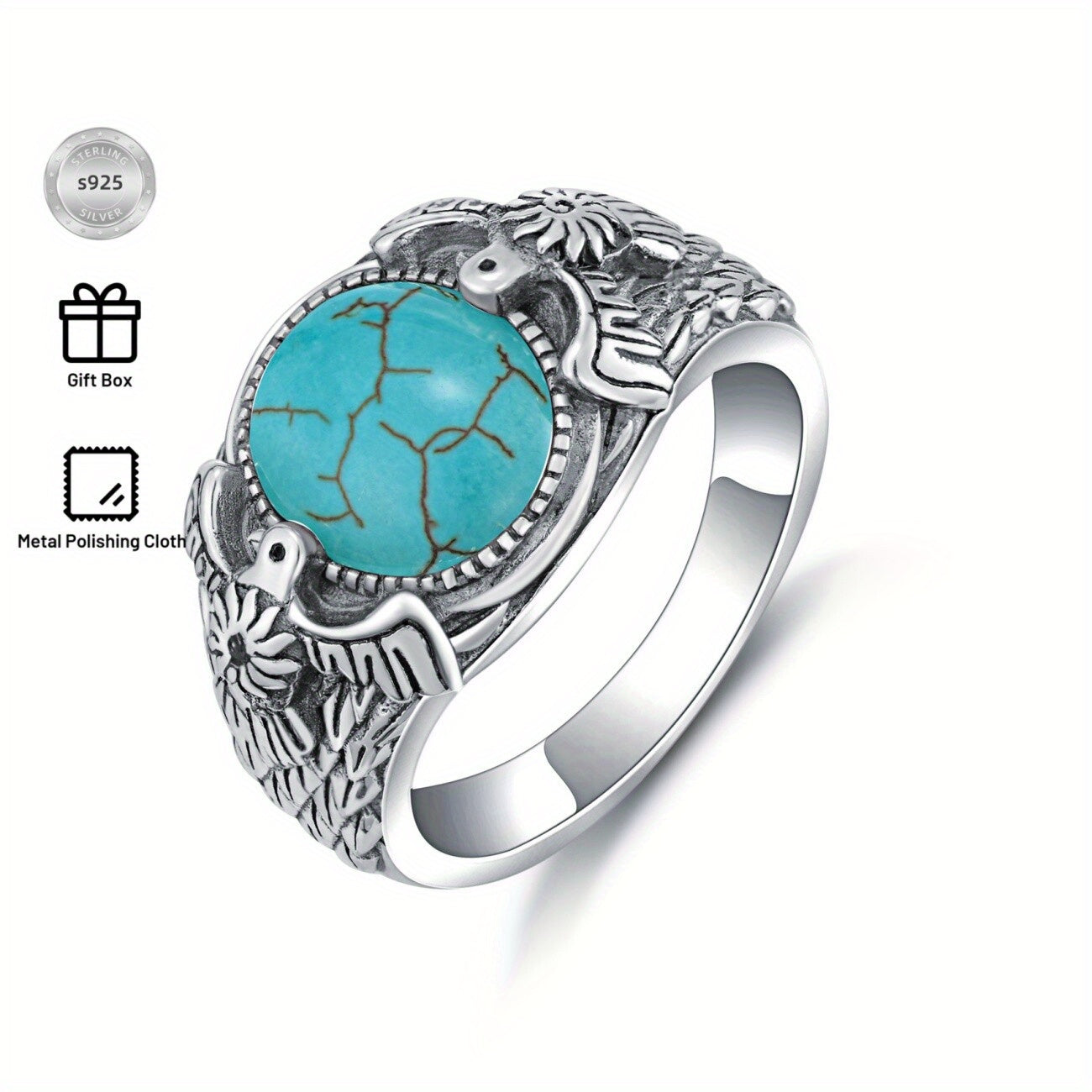 925 Sterling Silvery Real Turquoise Thunderbird Ring for Men 11x9 mm Faux Gemstone Eagle Sun Native American Rings Vintage Jewelry for Man