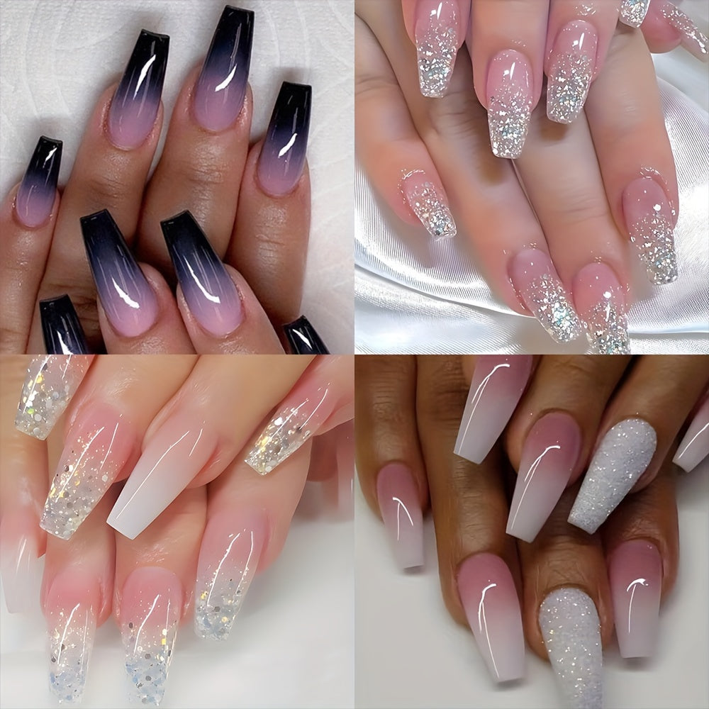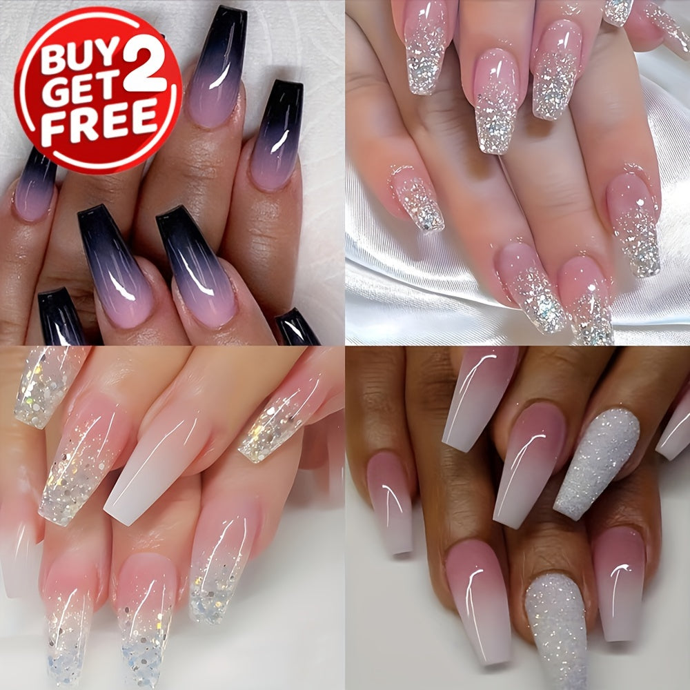 96pcs Elegant Medium Long Coffin Press-On Nails - Pink Glitter Gradient & Sparkling Stripe Patterns, Glossy Finish Artificial Manicure Set, Buy 2 Get 2 Free
