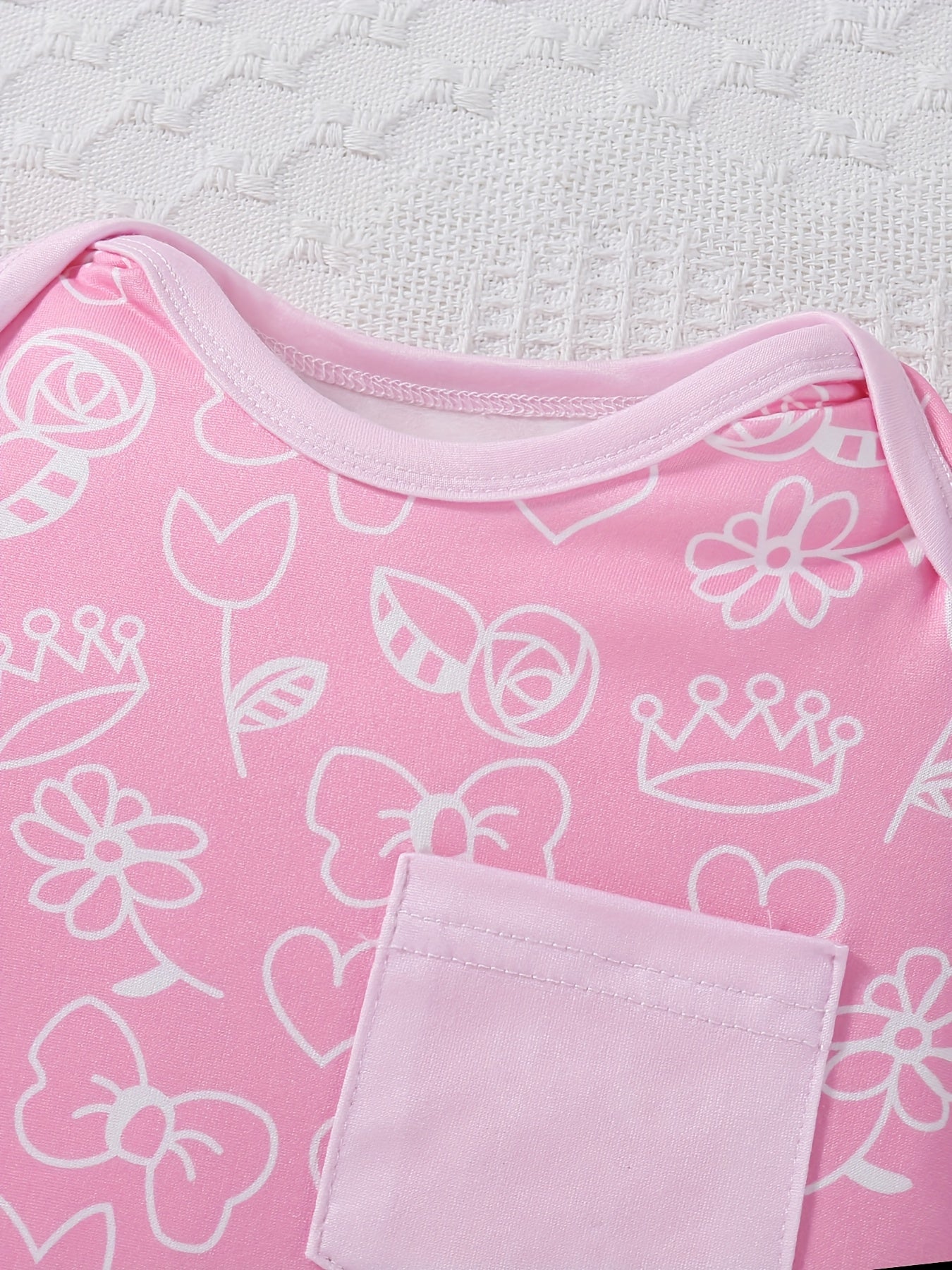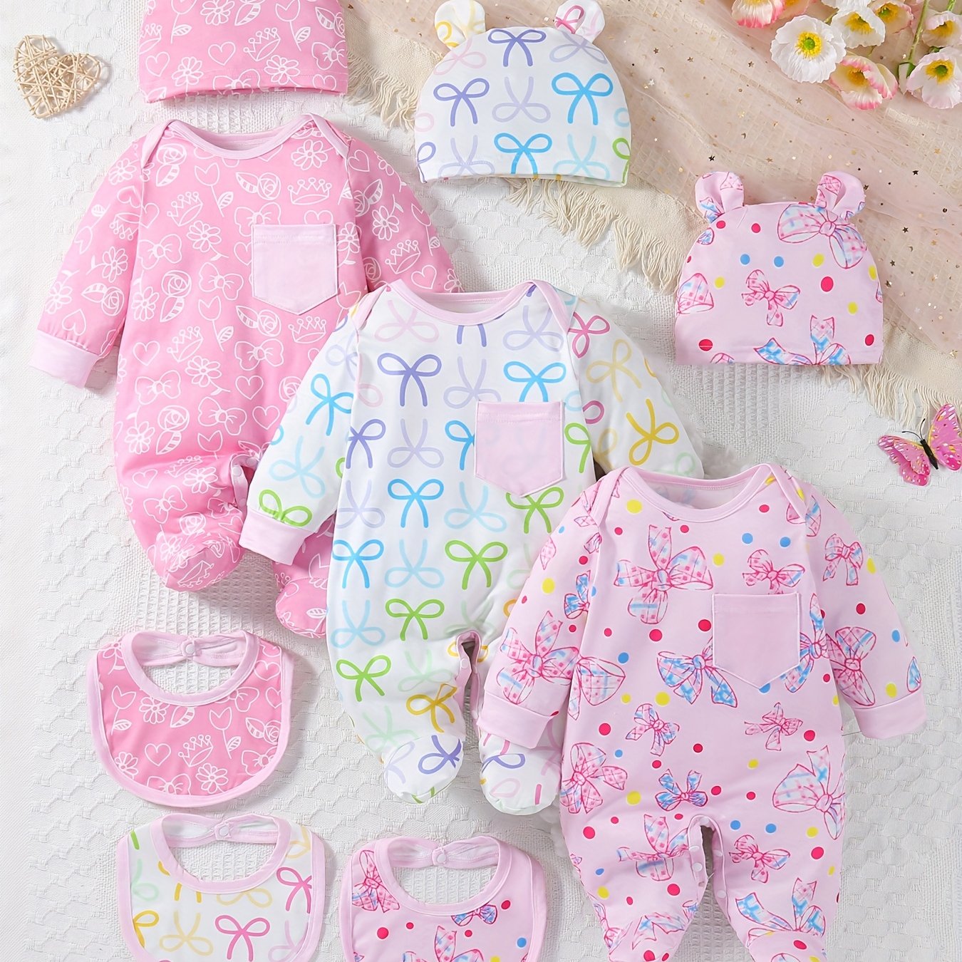 9pcs of Newborn Baby Long-Sleeved Foot-Covering Onesies with Flowers, Hearts, Bows, Colorful Prints And Tie-Dye Patterns, Front Patch Pockets, Bottom Crotch with Buttons, Long-Sleeved Foot-Covering Onesies, with Bunny Hats And Bibs, Soft And Comfortable C