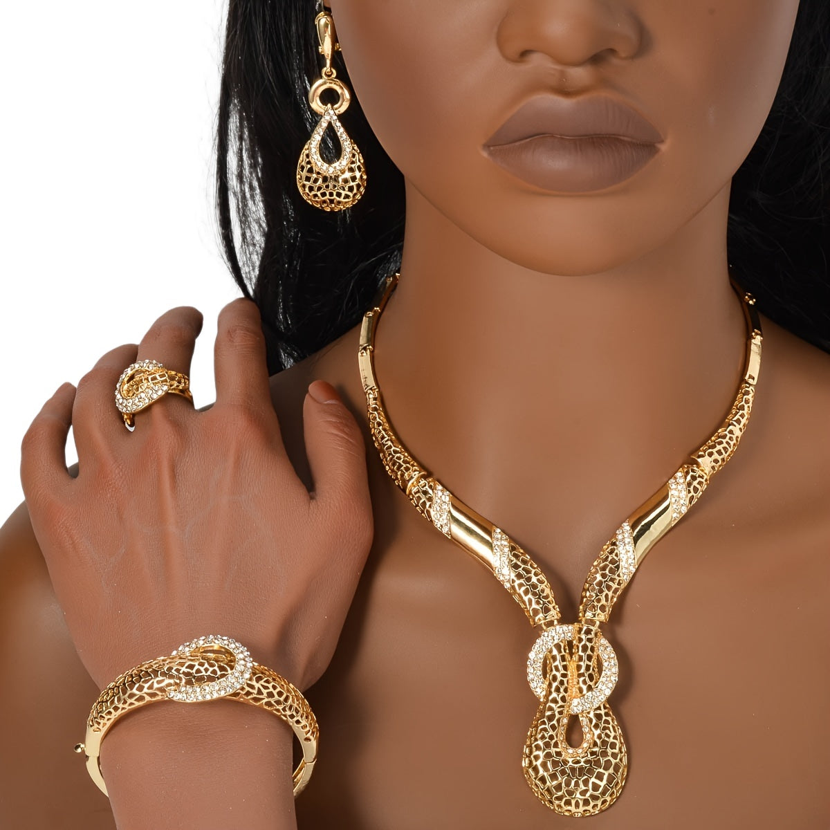 A Unique Middle Eastern Style Jewelry Set for Women Featuring a Shimmering Y-Shaped Necklace, Bracelet, Earrings, And Ring with Distinctive Curved Geometric Cutouts, Perfect for Wedding Party Gifts.