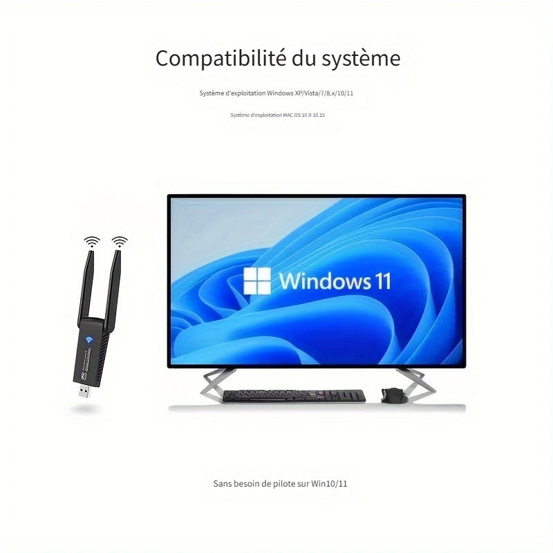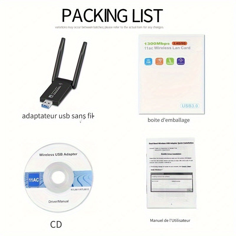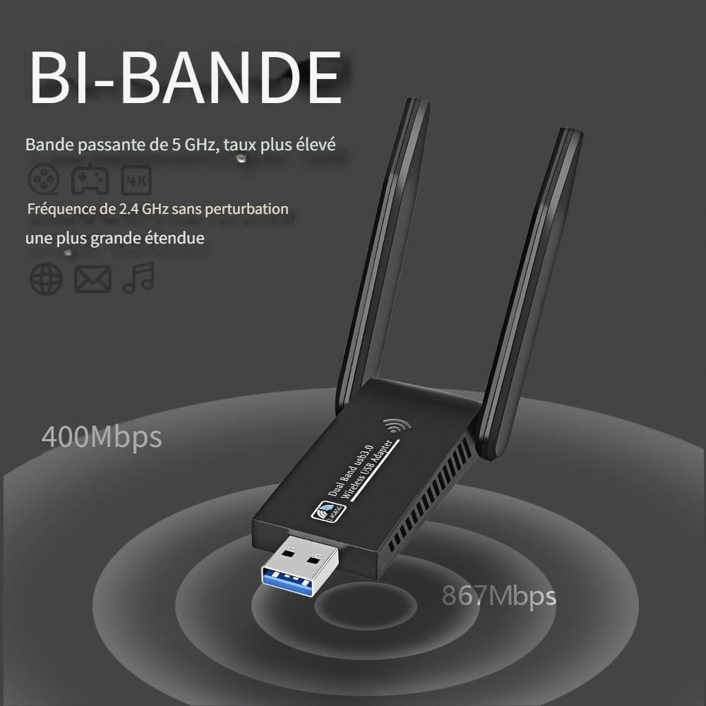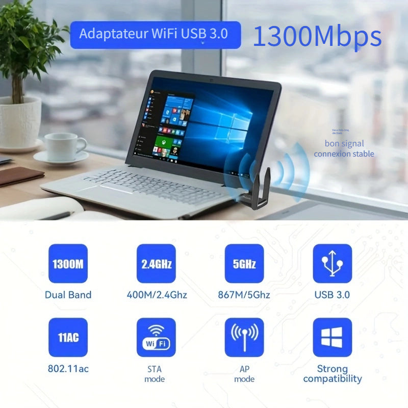 Adaptateur WiFi USB double bande 1300 Mbps WIMOTEK avec antennes 5 dBi, 802.11AC, USB 3.0, compatible Windows 11/10/8/7/XP, Mac OS 10.9-10.15, connectivité Wi-Fi fiable pour PC de bureau