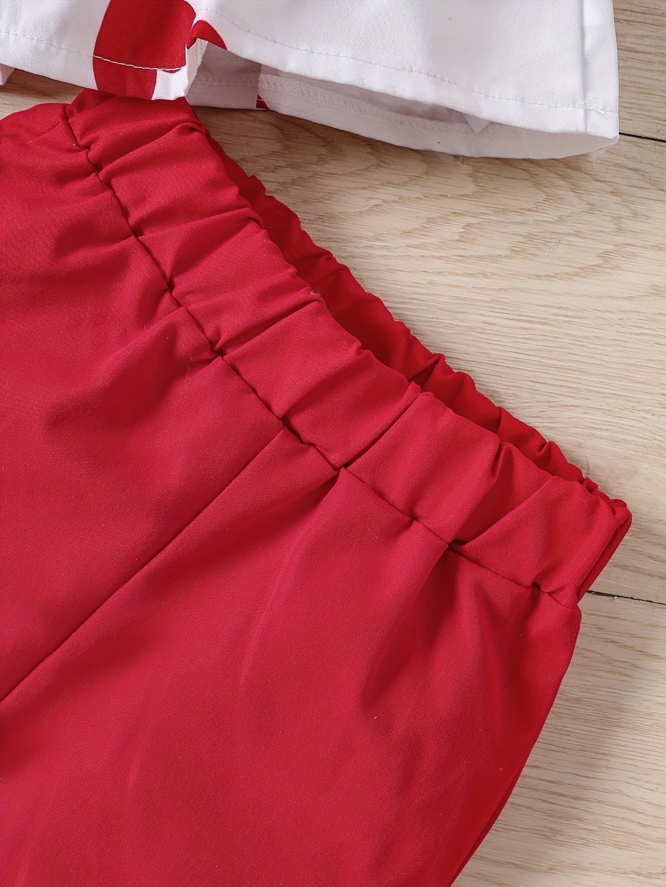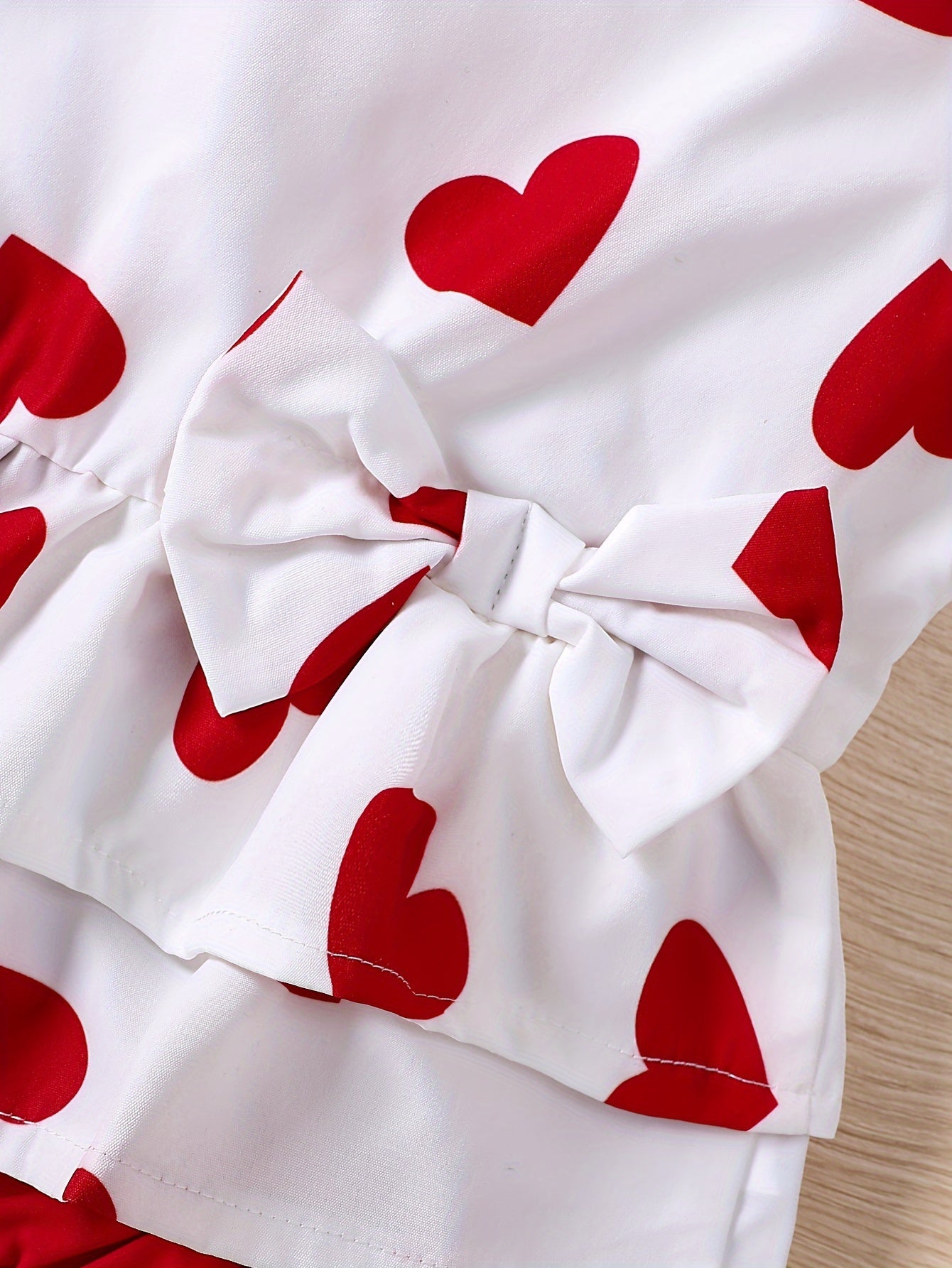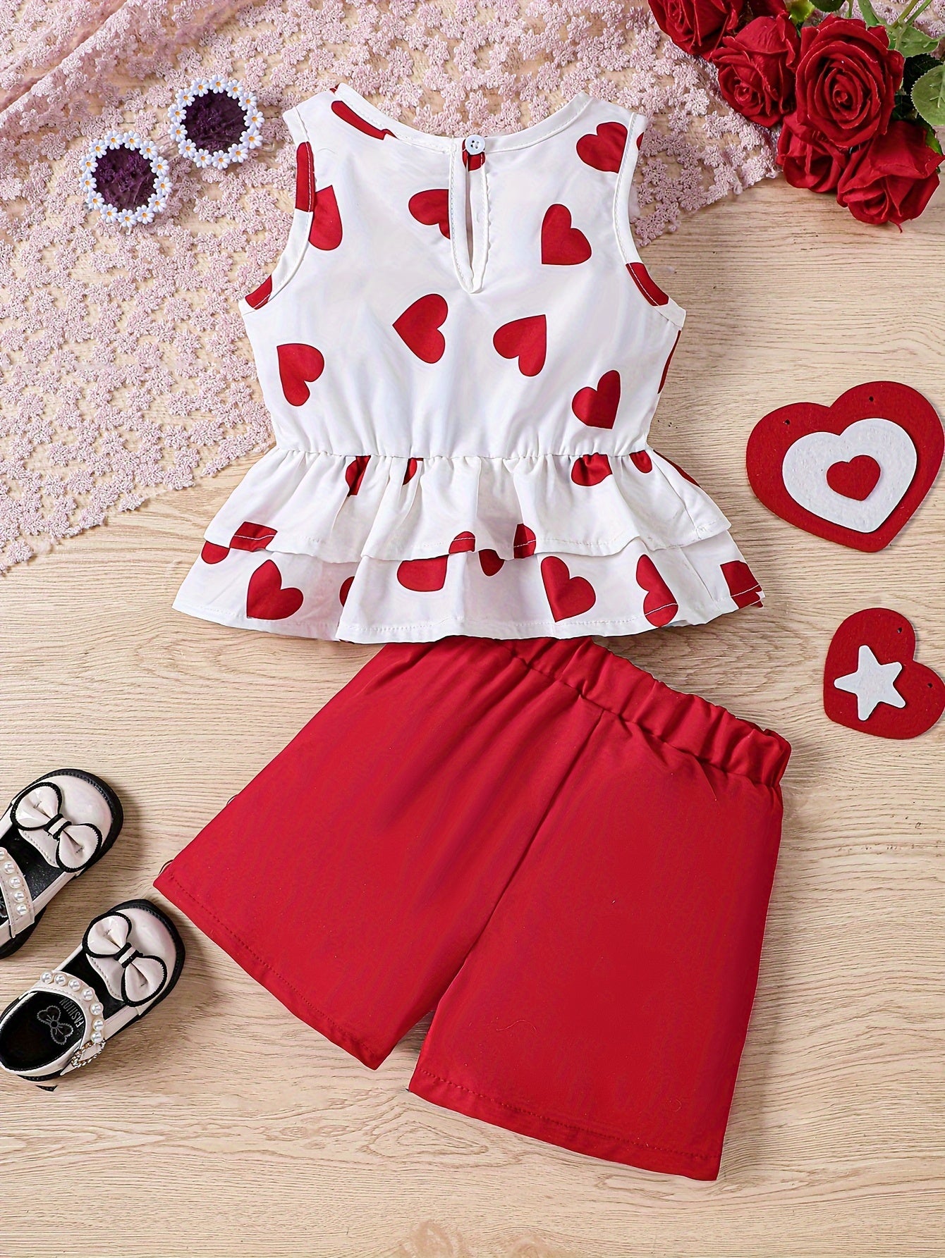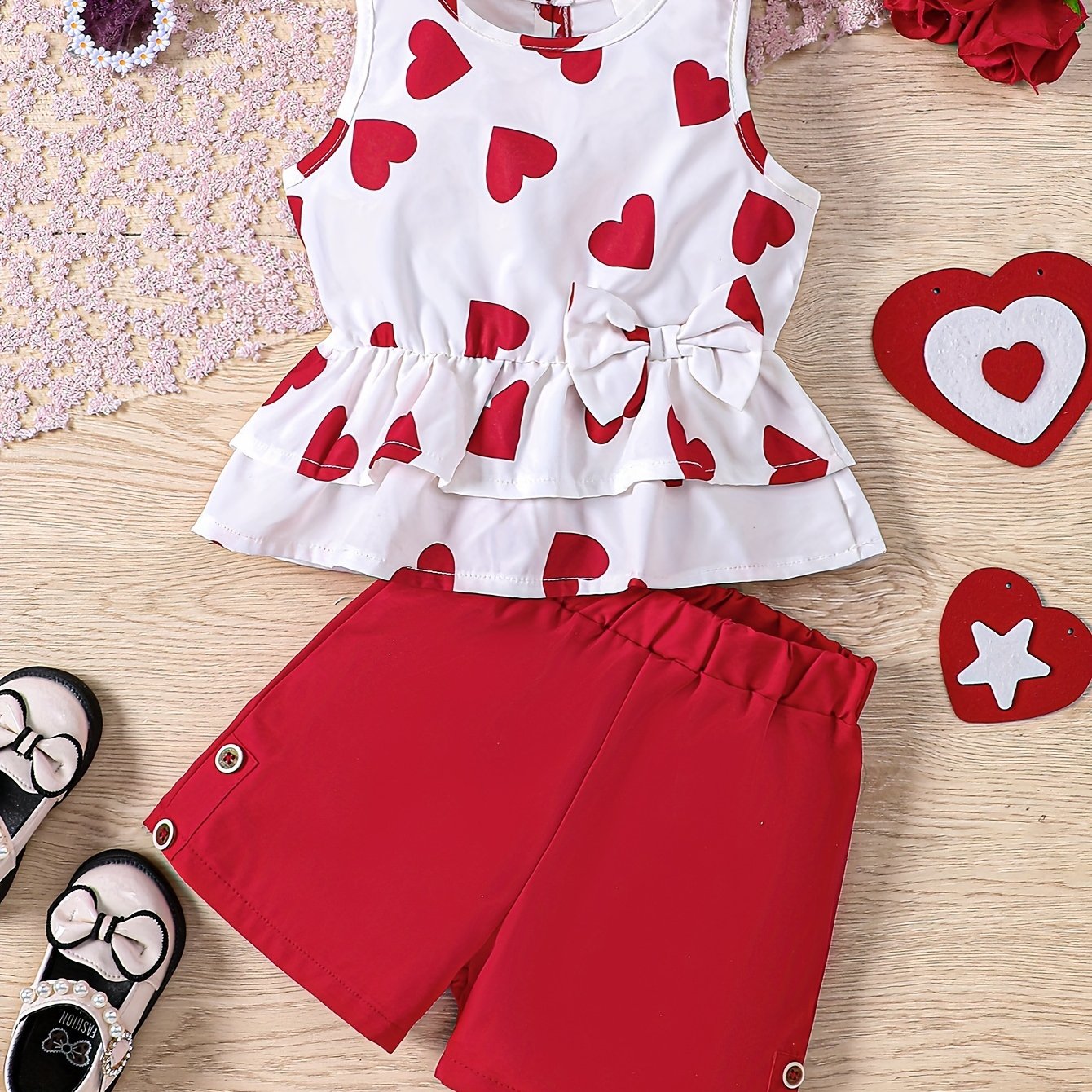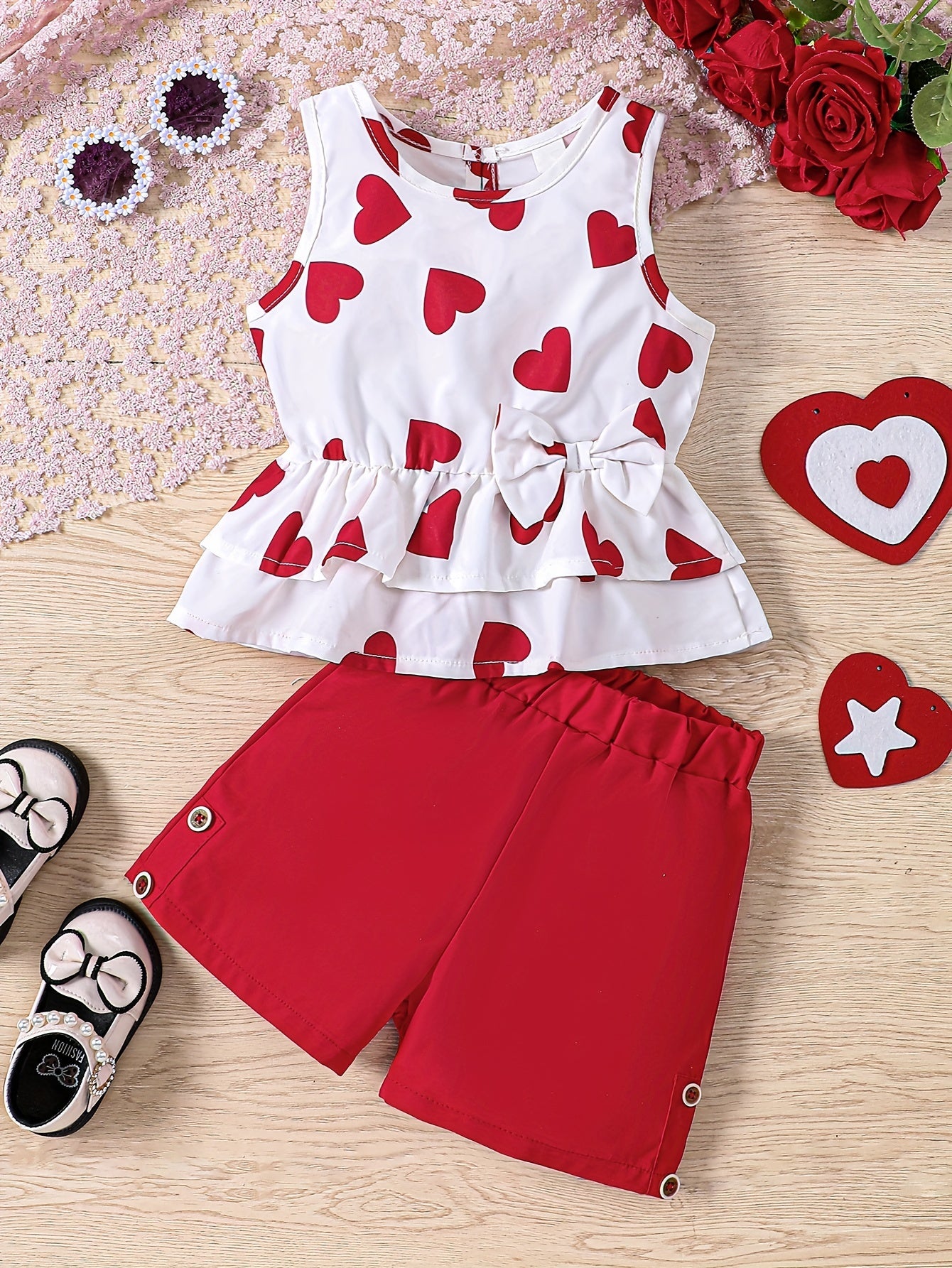 Adorable Girls' Summer Valentine's Day Set - Heart Print Bow-Accented Tank Top & Purple Shorts, 100% Polyester, Non-Transparent, Woven Style with Ruffled Hem - Perfect for Fashionable Little Ones, Girls Summer Outfit|Bow-Accented Top|Woven Texture, Perfec