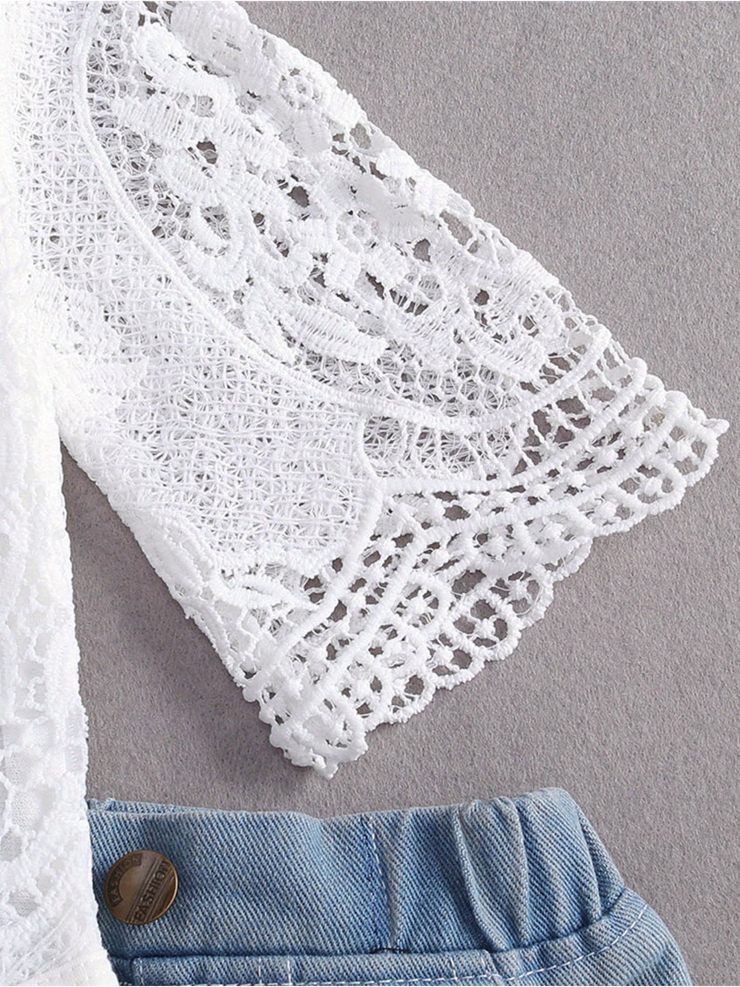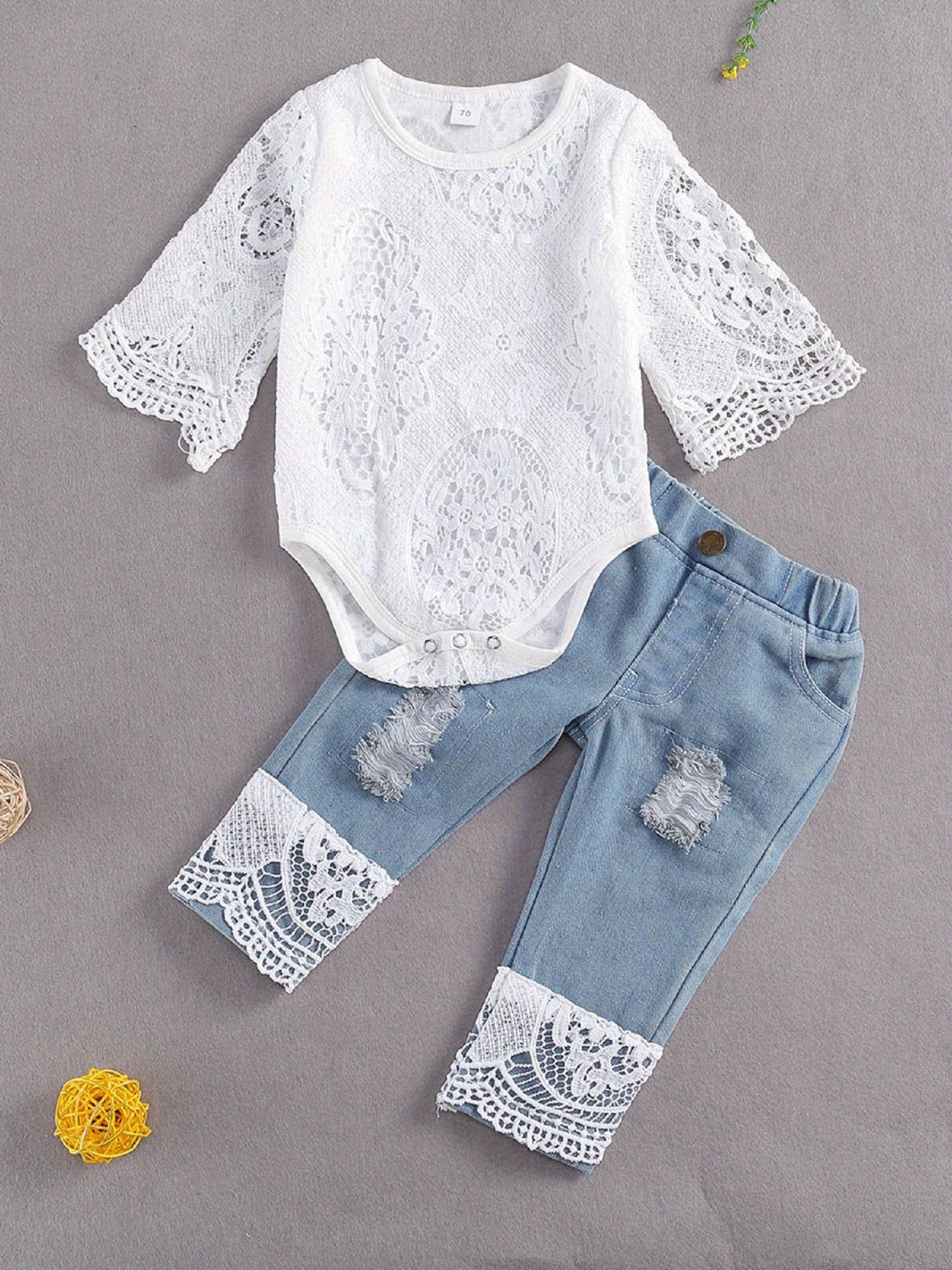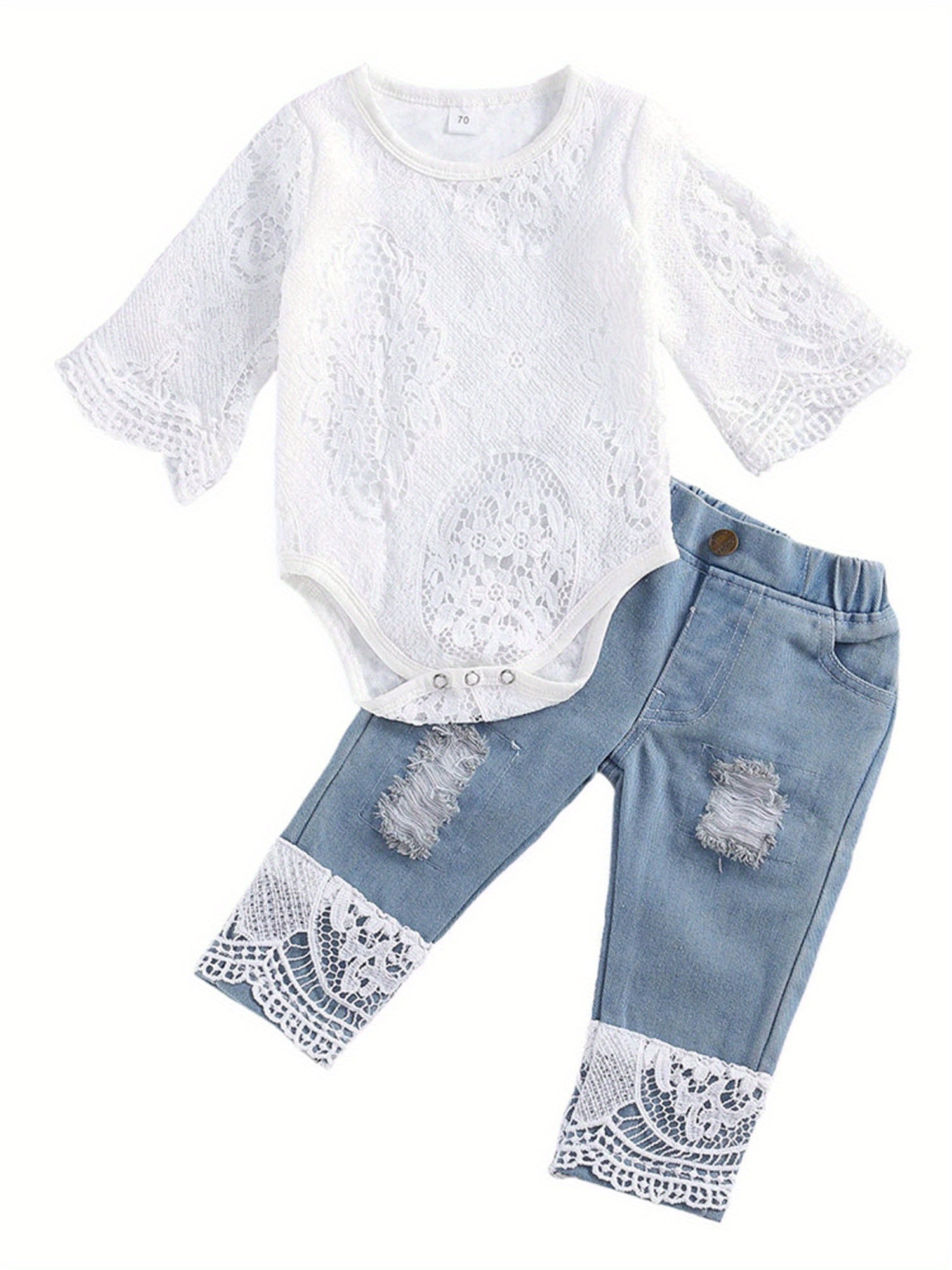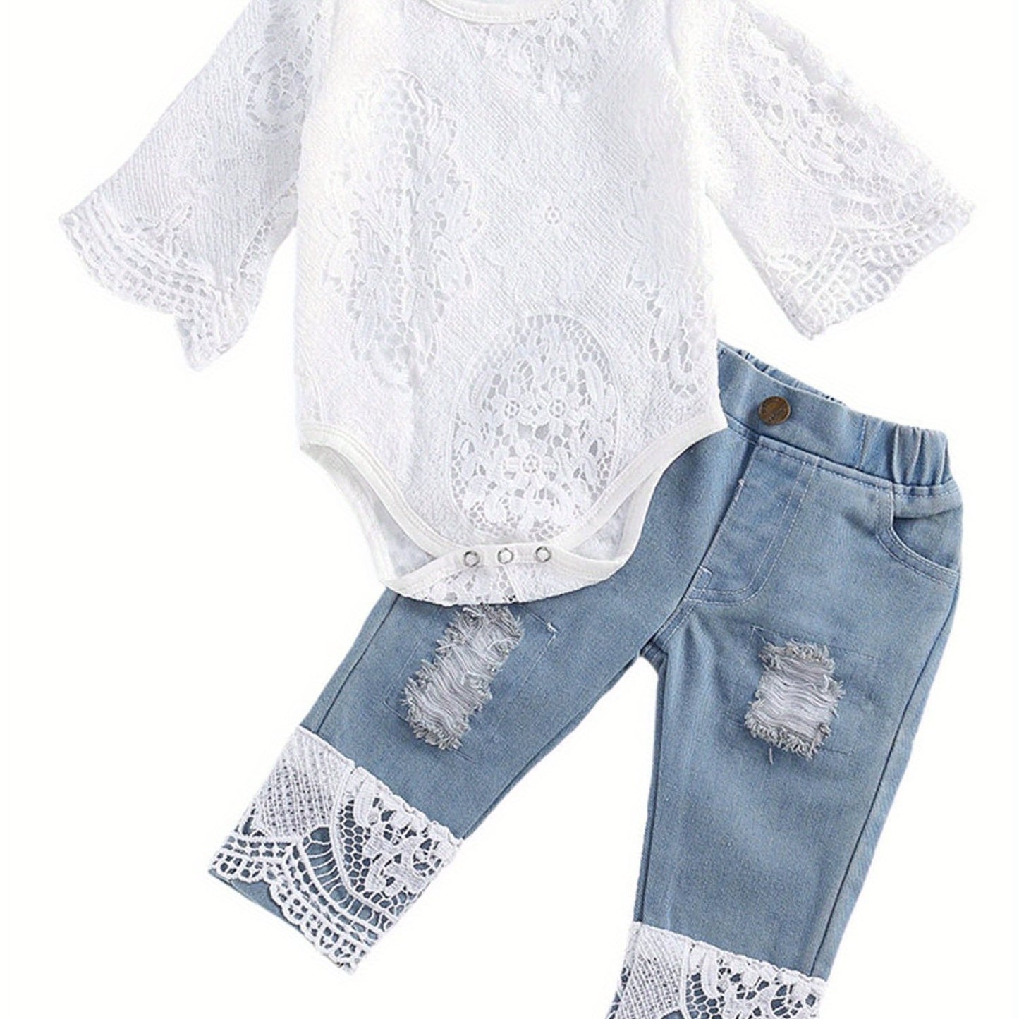 Adorable Youngsters Girl's 2pcs Outfit Set - Lace Hollow Romper & Ripped Jeans, Cotton Blend, Perfect for Spring/Fall, Perfect for Outdoor