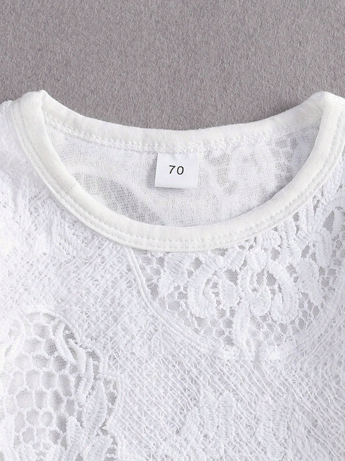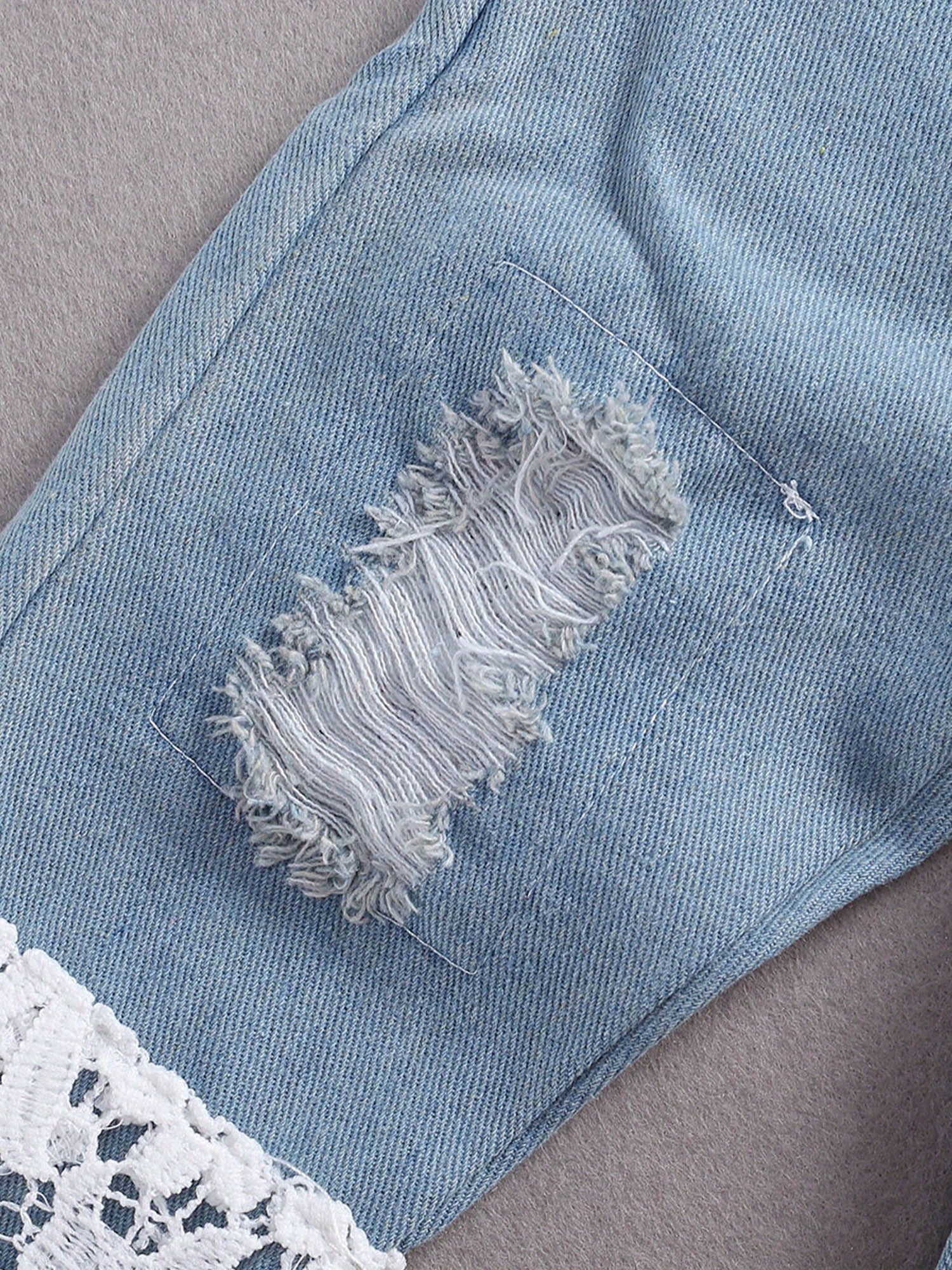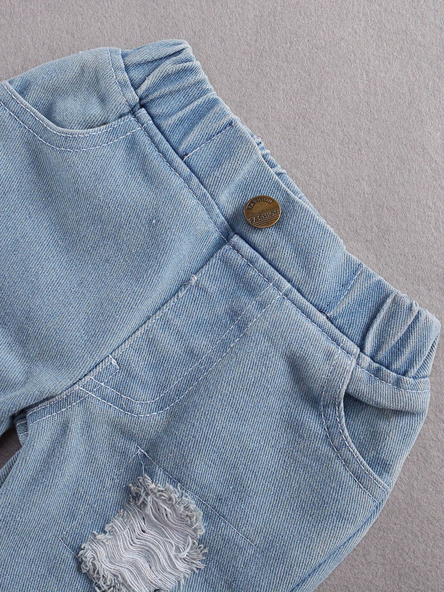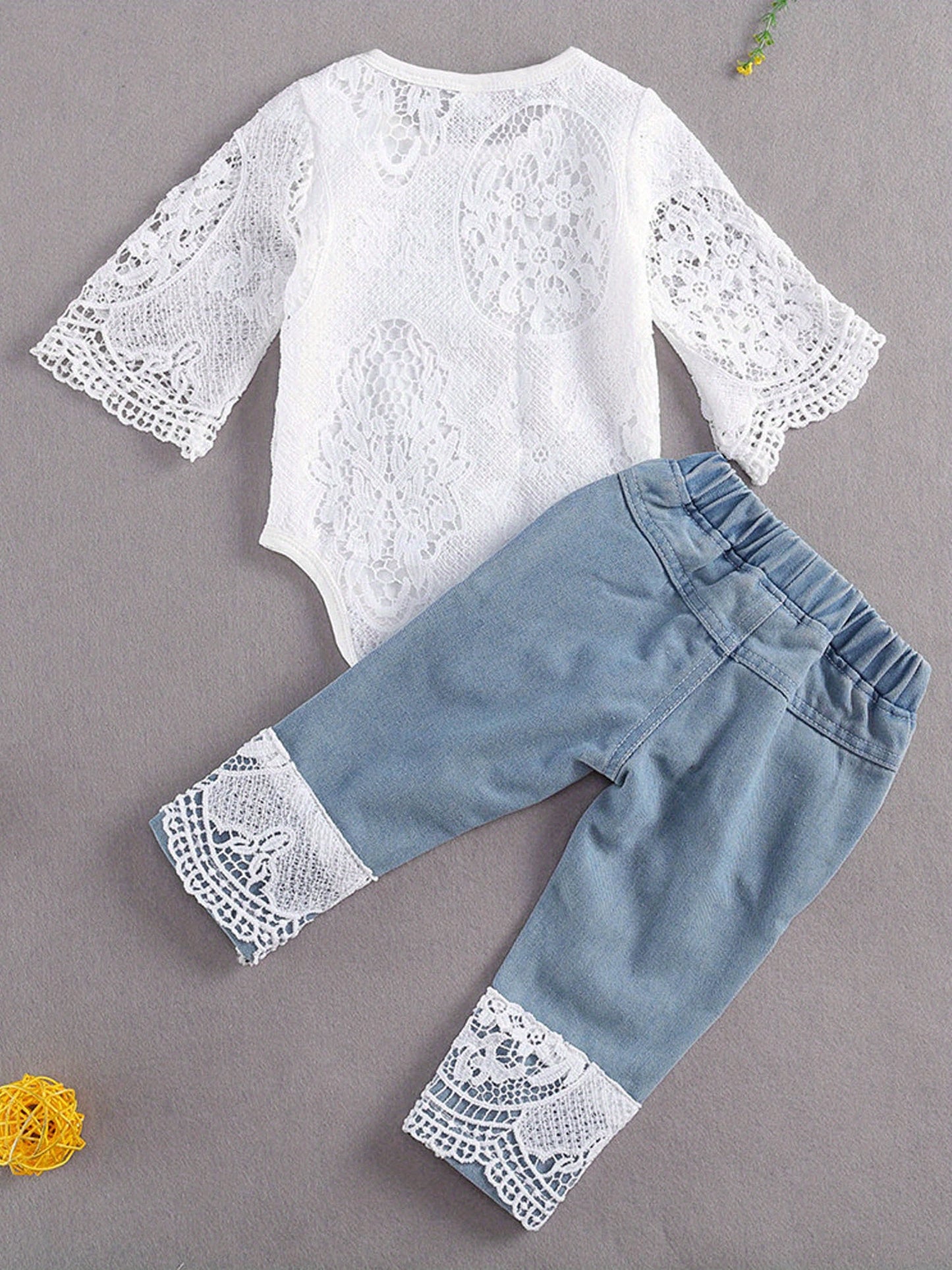Adorable Youngsters Girl's 2pcs Outfit Set - Lace Hollow Romper & Ripped Jeans, Cotton Blend, Perfect for Spring/Fall, Perfect for Outdoor