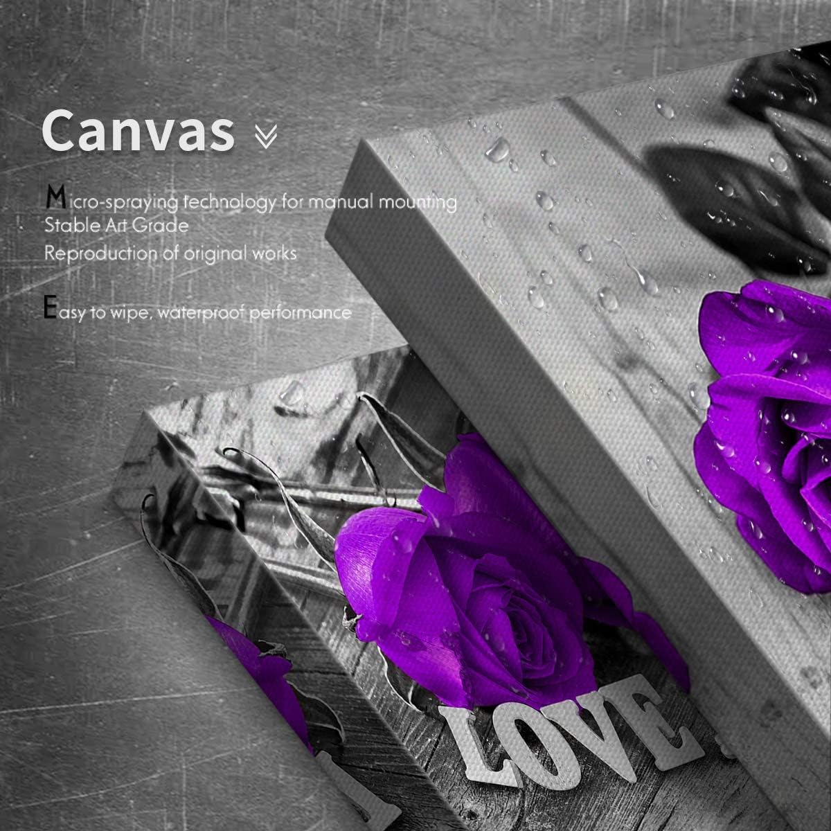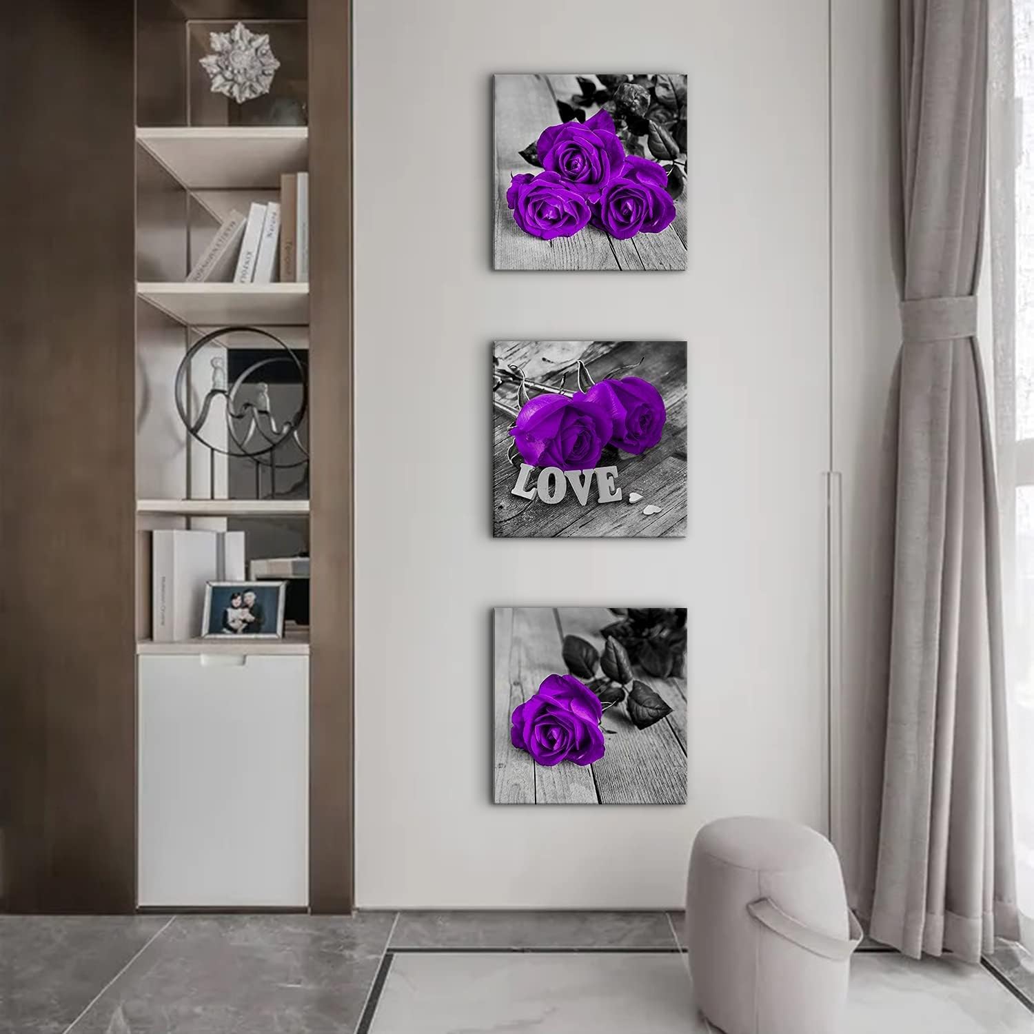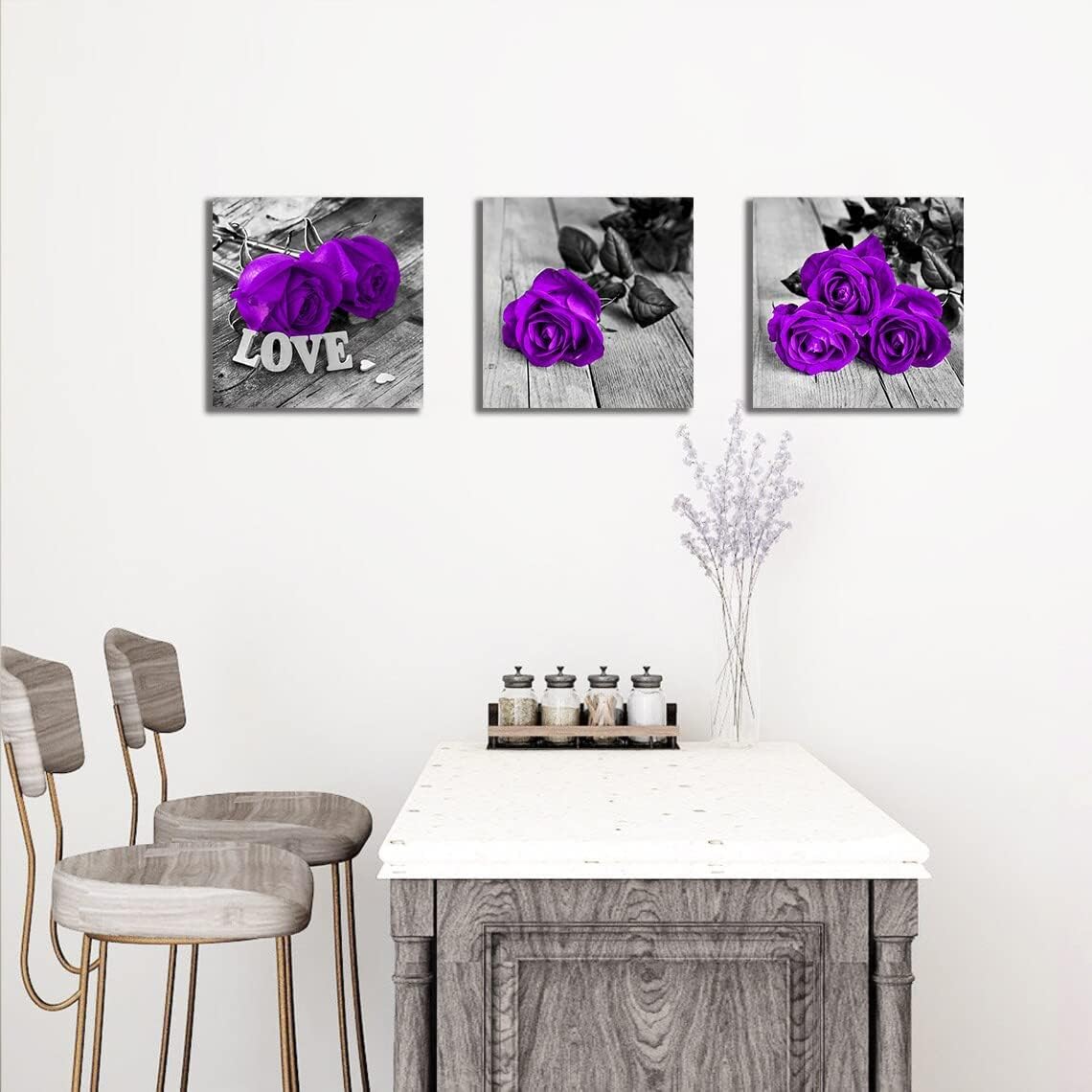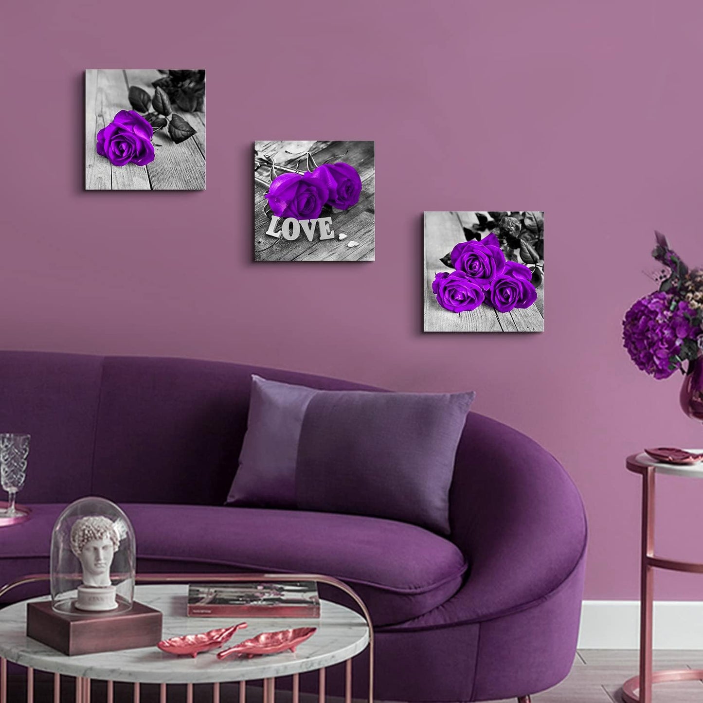 - 【Purple Pictures Wall Decor For Home Decorations】- Black and white flower easy match any home interior, 3 pieces set purple rose canvas framed wall art valentines day wall decor perfect for couple bedroom, bathroom, kitchen, living room, dining room, master room, laundry, stair, breakfast bar, RV, dorm, apartment, spa, restaurant, office, coffee shop, yoga room, cabin decorative or over sofa ideas. The unique wall decor for any space you want to lighten up.